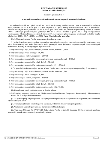 UCHWAŁA NR XVIII/105/15 RADY MIASTA PORĘBA z dnia 14 grudnia 2015 r. w sprawie ustalenia wysokości stawek opłaty targowej, sposobu jej poboru. Na podstawie art.18 ust.2 pkt 8, art.40 ust.1,art.41 ust.1 ustawy z dnia 8 marca 1990r. o samorządzie gminnym (tekst jednolity: Dz .U. z 2015r.,poz.1515 ) art.19 pkt1 lit. a i pkt 2 ustawy z dnia12 stycznia 1991r. o podatkach i opłatach lokalnych (tekst jednolity: Dz. U. z 2014r. poz.849 z późn. zm.)oraz art.47§4a ustawy z dnia 29 sierpnia 1997r. -Ordynacja podatkowa(tekst jednolity: Dz. U. z 2015r. poz.613 z późn. zm.) przy uwzględnieniu obwieszczenia Ministra Finansów z dnia 5 sierpnia 2015r. w sprawie górnych granic kwotowych podatków i opłat lokalnych w 2016r. (M.P. z 2015r. poz.735). Rada Miasta Poręba uchwala : § 1. 1. Na terenie miasta Poręba wprowadza się opłatę targową. 2. Ustala się dzienną stawkę opłaty targowej za prowadzenie sprzedaży na terenie targowiska położonego przy ulicy Przemysłowej od osób fizycznych, osób prawnych oraz jednostek organizacyjnych nieposiadających osobowości prawnej, w następujących wysokościach : 1) Przy sprzedaży z ręki, kosza, skrzynki, wiadra, wózka, roweru - 7,00 zł 2) Przy sprzedaży z wozu konnego - 10,00zł 3) Przy sprzedaży ze stołów, straganów - 25,00zł 4) Przy sprzedaży z samochodów osobowych, przyczep samochodowych - 25,00zł 5) Przy sprzedaży z samochodów o ład. do 1,5t - 30,00zł 6) Przy sprzedaży z samochodów ciężarowych powyżej 1,5 t - 35,00zł 3. Od sprzedaży dokonywanej na terenie Miasta Poręba poza obszarem targowiska przy ulicy Przemysłowej. 1) Przy sprzedaży z ręki, kosza, skrzynki, wiadra, wózka, roweru - 7,00zł 2) Przy sprzedaży z wozu konnego - 20,00zł 3) Przy sprzedaży ze stołów, straganów - 50,00zł 4) Przy sprzedaży z samochodów osobowych, przyczep samochodowych - 50,00zł 5) Przy sprzedaży z samochodów o ład. do 1,5t - 60,00zł 6) Przy sprzedaży z samochodów ciężarowych powyżej 1,5t - 70,00zł § 2. Zarządza się pobór opłaty targowej w drodze inkasa. 1) Pobór opłaty targowej powierza się Miejskiemu Przedsiębiorstwu Gospodarki Komunalnej i Mieszkaniowej Spółka z o. o. w upadłości układowej . § 3. Za pobór opłaty targowej ustala się wynagrodzenie prowizyjne w wysokości 12% pobranych i terminowo odprowadzonych kwot. § 4. Terminem płatności opłaty targowej jest dzień, w którym dokonywana jest sprzedaż . § 5. Wykonanie uchwały powierza się Burmistrzowi Miasta Poręba. § 6. Traci moc Uchwała Nr XVII/98/15 Rady Miasta Poręba z dnia 30 listopada 2015 r. w sprawie ustalenia wysokości stawek opłaty targowej, sposobu jej poboru. Id: 159A3221-D127-4F74-8250-5AF0176D9AB3. Uchwalony Strona 1 § 7. Uchwała podlega ogłoszeniu w Dzienniku Urzędowym Województwa Śląskiego wchodzi w życie z dniem 1 stycznia 2016r. Przewodniczący Rady Miasta Urszula Milka Id: 159A3221-D127-4F74-8250-5AF0176D9AB3. Uchwalony Strona 2 UZASADNIENIE Z dniem 1 stycznia 2016 r. opłaty lokalne będą miały charakter fakultatywny; ich wprowadzenie na obszarze danej gminy uzależnione będzie od woli organu stanowiącego. Decyzja rady gminy co do wprowadzenia opłaty lokalnej – w ocenie Kolegium RIO w Częstochowie – powinna być jednoznaczna, wyraźnie zakomunikowana stosownym zapisem w treści uchwały dotyczącej danej opłaty, przykładowo: „ Wprowadza się opłatę targową na terenie miasta Poręba”. Brak takiego postanowienia w uchwale w sprawie opłaty lokalnej Kolegium traktuje jako istotne naruszenie prawa, powodujące konieczność jej usunięcia z obrotu prawnego. W ocenie Kolegium uchwała gminy zawierająca jedynie stawki opłaty lokalnej, np. targowej, opłaty za psa, a nie zawierająca wyraźnej dyspozycji o wprowadzeniu danej opłaty jest nieważna. Wykluczona jest zatem możliwość „dorozumianego”, tylko przez ustalenie stawek, wprowadzenia opłaty lokalnej przez radę gminy. Id: 159A3221-D127-4F74-8250-5AF0176D9AB3. Uchwalony Strona 1