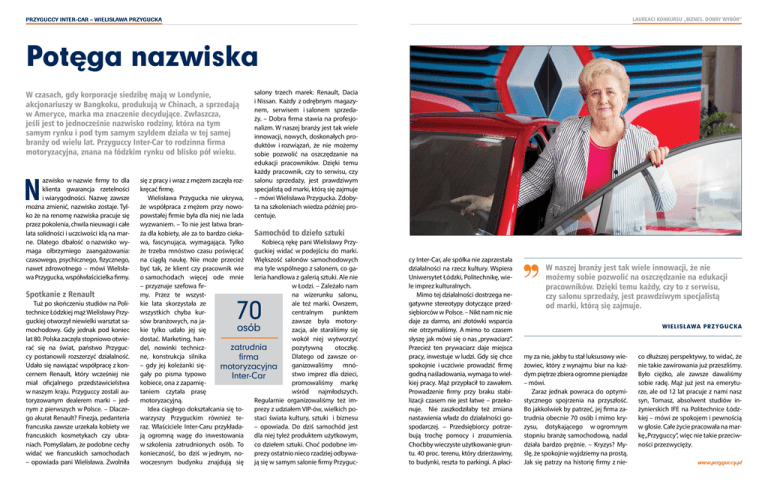 Laureaci konkursu „Biznes. dobry wybór” Przyguccy inter-car – Wielisława Przygucka Potęga nazwiska W czasach, gdy korporacje siedzibę mają w Londynie, akcjonariuszy w Bangkoku, produkują w Chinach, a sprzedają w Ameryce, marka ma znaczenie decydujące. Zwłaszcza, jeśli jest to jednocześnie nazwisko rodziny, która na tym samym rynku i pod tym samym szyldem działa w tej samej branży od wielu lat. Przyguccy Inter-Car to rodzinna firma motoryzacyjna, znana na łódzkim rynku od blisko pół wieku. N azwisko w nazwie firmy to dla klienta gwarancja rzetelności i wiarygodności. Nazwę zawsze można zmienić, nazwisko zostaje. Tylko że na renomę nazwiska pracuje się przez pokolenia, chwila nieuwagi i całe lata solidności i uczciwości idą na marne. Dlatego dbałość o nazwisko wymaga olbrzymiego zaangażowania: czasowego, psychicznego, fizycznego, nawet zdrowotnego – mówi Wielisława Przygucka, współwłaścicielka firmy. Spotkanie z Renault Tuż po skończeniu studiów na Politechnice Łódzkiej mąż Wielisławy Przyguckiej otworzył niewielki warsztat samochodowy. Gdy jednak pod koniec lat 80. Polska zaczęła stopniowo otwierać się na świat, państwo Przyguccy postanowili rozszerzyć działalność. Udało się nawiązać współpracę z koncernem Renault, który wcześniej nie miał oficjalnego przedstawicielstwa w naszym kraju. Przyguccy zostali autoryzowanym dealerem marki – jednym z pierwszych w Polsce. – Dlaczego akurat Renault? Finezja, pedanteria francuska zawsze urzekała kobiety we francuskich kosmetykach czy ubraniach. Pomyślałam, że podobne cechy widać we francuskich samochodach – opowiada pani Wielisława. Zwolniła salony trzech marek: Renault, Dacia i Nissan. Każdy z odrębnym magazynem, serwisem i salonem sprzedaży. – Dobra firma stawia na profesjonalizm. W naszej branży jest tak wiele innowacji, nowych, doskonałych produktów i rozwiązań, że nie możemy sobie pozwolić na oszczędzanie na edukacji pracowników. Dzięki temu każdy pracownik, czy to serwisu, czy salonu sprzedaży, jest prawdziwym specjalistą od marki, którą się zajmuje – mówi Wielisława Przygucka. Zdobyta na szkoleniach wiedza później procentuje. się z pracy i wraz z mężem zaczęła rozkręcać firmę. Wielisława Przygucka nie ukrywa, że współpraca z mężem przy nowopowstałej firmie była dla niej nie lada wyzwaniem. – To nie jest łatwa branża dla kobiety, ale za to bardzo ciekaSamochód to dzieło sztuki wa, fascynująca, wymagająca. Tylko Kobiecą rękę pani Wielisławy Przyże trzeba mnóstwo czasu poświęcać guckiej widać w podejściu do marki. na ciągłą naukę. Nie może przecież Większość salonów samochodowych być tak, że klient czy pracownik wie ma tyle wspólnego z salonem, co gao samochodach więcej ode mnie leria handlowa z galerią sztuki. Ale nie – przyznaje szefowa firw Łodzi. – Zależało nam na wizerunku salonu, my. Przez te wszystale też marki. Owszem, kie lata skorzystała ze centralnym punktem wszystkich chyba kurzawsze była motorysów branżowych, na jaosób kie tylko udało jej się zacja, ale staraliśmy się dostać. Marketing, hanwokół niej wytworzyć del, nowinki techniczpozytywną otoczkę. zatrudnia ne, konstrukcja silnika Dlatego od zawsze orfirma – gdy jej koleżanki sięganizowaliśmy mnómotoryzacyjna stwo imprez dla dzieci, gały po pisma typowo Inter-Car promowaliśmy markę kobiece, ona z zapamiętaniem czytała prasę wśród najmłodszych. motoryzacyjną. Regularnie organizowaliśmy też imIdea ciągłego dokształcania się toprezy z udziałem VIP-ów, wielkich powarzyszy Przyguckim również testaci świata kultury, sztuki i biznesu raz. Właściciele Inter-Caru przykłada– opowiada. Do dziś samochód jest ją ogromną wagę do inwestowania dla niej tyleż produktem użytkowym, w szkolenia zatrudnionych osób. To co dziełem sztuki. Choć podobne imkonieczność, bo dziś w jednym, noprezy ostatnio nieco rzadziej odbywawoczesnym budynku znajdują się ją się w samym salonie firmy Przyguc- 70 cy Inter-Car, ale spółka nie zaprzestała działalności na rzecz kultury. Wspiera Uniwersytet Łódzki, Politechnikę, wiele imprez kulturalnych. Mimo tej działalności dostrzega negatywne stereotypy dotyczące przedsiębiorców w Polsce. – Nikt nam nic nie daje za darmo, ani złotówki wsparcia nie otrzymaliśmy. A mimo to czasem słyszę jak mówi się o nas „prywaciarz”. Przecież ten prywaciarz daje miejsca pracy, inwestuje w ludzi. Gdy się chce spokojnie i uczciwie prowadzić firmę godną naśladowania, wymaga to wielkiej pracy. Mąż przypłacił to zawałem. Prowadzenie firmy przy braku stabilizacji czasem nie jest łatwe – przekonuje. Nie zaszkodziłaby też zmiana nastawienia władz do działalności gospodarczej. – Przedsiębiorcy potrzebują trochę pomocy i zrozumienia. Choćbby wieczyste użytkowanie gruntu. 40 proc. terenu, który dzierżawimy, to budynki, reszta to parkingi. A płaci- W naszej branży jest tak wiele innowacji, że nie możemy sobie pozwolić na oszczędzanie na edukacji pracowników. Dzięki temu każdy, czy to z serwisu, czy salonu sprzedaży, jest prawdziwym specjalistą od marki, którą się zajmuje. Wielisł awa Przygucka my za nie, jakby tu stał luksusowy wieżowiec, który z wynajmu biur na każdym piętrze zbiera ogromne pieniądze – mówi. Zaraz jednak powraca do optymistycznego spojrzenia na przyszłość. Bo jakkolwiek by patrzeć, jej firma zatrudnia obecnie 70 osób i mimo kryzysu, dotykającego w ogromnym stopniu branżę samochodową, nadal działa bardzo prężnie. – Kryzys? Myślę, że spokojnie wyjdziemy na prostą. Jak się patrzy na historię firmy z nie- co dłuższej perspektywy, to widać, że nie takie zawirowania już przeszliśmy. Było ciężko, ale zawsze dawaliśmy sobie radę. Mąż już jest na emeryturze, ale od 12 lat pracuje z nami nasz syn, Tomasz, absolwent studiów inżynierskich IFE na Poli
