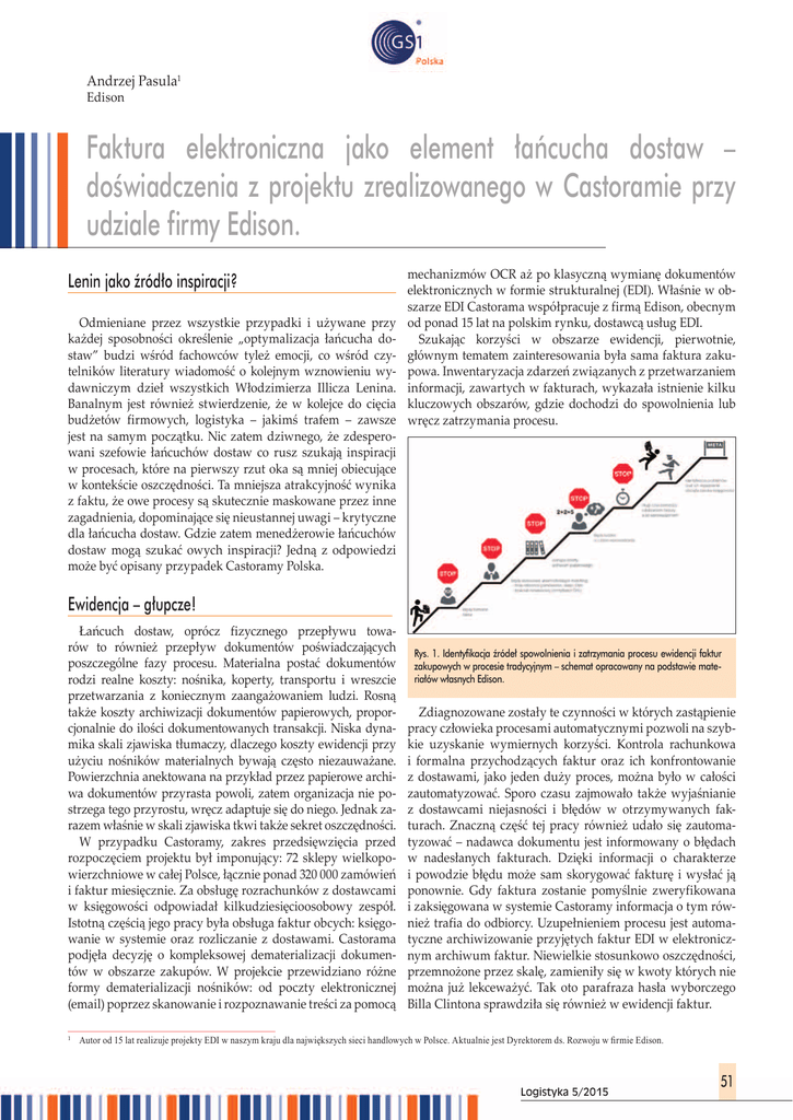 Andrzej Pasula1 Edison Faktura elektroniczna jako element łańcucha dostaw – doświadczenia z projektu zrealizowanego w Castoramie przy udziale firmy Edison. Lenin jako źródło inspiracji? Odmieniane przez wszystkie przypadki i używane przy każdej sposobności określenie „optymalizacja łańcucha dostaw” budzi wśród fachowców tyleż emocji, co wśród czytelników literatury wiadomość o kolejnym wznowieniu wydawniczym dzieł wszystkich Włodzimierza Illicza Lenina. Banalnym jest również stwierdzenie, że w kolejce do cięcia budżetów firmowych, logistyka – jakimś trafem – zawsze jest na samym początku. Nic zatem dziwnego, że zdesperowani szefowie łańcuchów dostaw co rusz szukają inspiracji w procesach, które na pierwszy rzut oka są mniej obiecujące w kontekście oszczędności. Ta mniejsza atrakcyjność wynika z faktu, że owe procesy są skutecznie maskowane przez inne zagadnienia, dopominające się nieustannej uwagi – krytyczne dla łańcucha dostaw. Gdzie zatem menedżerowie łańcuchów dostaw mogą szukać owych inspiracji? Jedną z odpowiedzi może być opisany przypadek Castoramy Polska. mechanizmów OCR aż po klasyczną wymianę dokumentów elektronicznych w formie strukturalnej (EDI). Właśnie w obszarze EDI Castorama współpracuje z firmą Edison, obecnym od ponad 15 lat na polskim rynku, dostawcą usług EDI. Szukając korzyści w obszarze ewidencji, pierwotnie, głównym tematem zainteresowania była sama faktura zakupowa. Inwentaryzacja zdarzeń związanych z przetwarzaniem informacji, zawartych w fakturach, wykazała istnienie kilku kluczowych obszarów, gdzie dochodzi do spowolnienia lub wręcz zatrzymania procesu. Ewidencja – głupcze! Łańcuch dostaw, oprócz fizycznego przepływu towarów to również przepływ dokumentów poświadczających poszczególne fazy procesu. Materialna postać dokumentów rodzi realne koszty: nośnika, koperty, transportu i wreszcie przetwarzania z koniecznym zaangażowaniem ludzi. Rosną także koszty archiwizacji dokumentów papierowych, proporcjonalnie do ilości dokumentowanych transakcji. Niska dynamika skali zjawiska tłumaczy, dlaczego koszty ewidencji przy użyciu nośników materialnych bywają często niezauważane. Powierzchnia anektowana na przykład przez papierowe archiwa dokumentów przyrasta powoli, zatem organizacja nie postrzega tego przyrostu, wręcz adaptuje się do niego. Jednak zarazem właśnie w skali zjawiska tkwi także sekret oszczędności. W przypadku Castoramy, zakres przedsięwzięcia przed rozpoczęciem projektu był imponujący: 72 sklepy wielkopowierzchniowe w całej Polsce, łącznie ponad 320 000 zamówień i faktur miesięcznie. Za obsługę rozrachunków z dostawcami w księgowości odpowiadał kilkudziesięcioosobowy zespół. Istotną częścią jego pracy była obsługa faktur obcych: księgowanie w systemie oraz rozliczanie z dostawami. Castorama podjęła decyzję o kompleksowej dematerializacji dokumentów w obszarze zakupów. W projekcie przewidziano różne formy dematerializacji nośników: od poczty elektronicznej (email) poprzez skanowanie i rozpoznawanie treści za pomocą Rys. 1. Identyfikacja źródeł spowolnienia i zatrzymania procesu ewidencji faktur zakupowych w procesie tradycyjnym – schemat opracowany na podstawie materiałów własnych Edison. Zdiagnozowane zostały te czynności w których zastąpienie pracy człowieka procesami automatycznymi pozwoli na szybkie uzyskanie wymiernych korzyści. Kontrola rachunkowa i formalna przychodzących faktur oraz ich konfrontowanie z dostawami, jako jeden duży proces, można było w całości zautomatyzować. Sporo czasu zajmowało także wyjaśnianie z dostawcami niejasności i błędów w otrzymywanych fakturach. Znaczną część tej pracy również udało się zautomatyzować – nadawca dokumentu jest informowany o błędach w nadesłanych fakturach. Dzięki informacji o charakterze i powodzie błędu może sam skorygować fakturę i wysłać ją ponownie. Gdy faktura zostanie pomyślnie zweryfikowana i zaksięgowana w systemie Castoramy informacja o tym również trafia do odbiorcy. Uzupełnieniem procesu jest automatyczne archiwizowanie przyjętych faktur EDI w elektronicznym archiwum faktur. Niewielkie stosunkowo oszczędności, przemnożone przez skalę, zamieniły się w kwoty których nie można już lekceważyć. Tak oto parafraza hasła wyborczego Billa Clintona sprawdziła się również w ewidencji faktur. Autor od 15 lat realizuje projekty EDI w naszym kraju dla największych sieci handlowych w Polsce. Aktualnie jest Dyrektorem ds. Rozwoju w firmie Edison. 1 Logistyka 5/2015 51 Warto na moment skupić się na pojęciu e-faktury i faktury elektronicznej, bo sporo zamieszania panuje w tym zakresie. Najczęściej, gdy przywołuje się „e-fakturę”, to myśli się o dokumencie zapisanym do postaci PDF (lub podobnej), a następnie wysłanym do odbiorcy drogą elektroniczną (najczęściej jest zwykły email). To w istocie jedynie obraz faktury (rodzaj jej zdjęcia), a do jej zaksięgowania nadal potrzebny jest człowiek. W przypadku „e-faktury” zmienia się jedynie listonosza tradycyjnego na elektronicznego. E-faktura PDF nawet jeśli po stronie sprzedawcy nie ma postaci materialnej (choć często jest praktyka drukowania takich dokumentów i archiwizowania papierowych wersji) to po stronie nabywcy najczęściej dochodzi do zmaterializowania – po prostu dokument się drukuje aby łatwiej było go zaksięgować i zarchiwizować. Nie kwestionując zalet takiego rozwiązania trudno nie zauważyć, że w istocie, beneficjentem jest tu sprzedawca, a po stronie nabywcy korzyści właściwie brak – wręcz rosną koszty, bo faktury musi sam wydrukować. Dodanie do faktury PDF podpisu elektronicznego kiedyś obligatoryjne a dziś jedynie zalecane, niczego tu nie zmienia – to nadal jedynie „obrazek faktury”. Mogę go sobie pooglądać, ale aby skorzystać z informacji w tej faktu