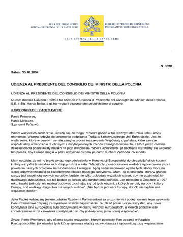 N. 0530 Sabato 30.10.2004 UDIENZA AL PRESIDENTE DEL CONSIGLIO DEI MINISTRI DELLA POLONIA UDIENZA AL PRESIDENTE DEL CONSIGLIO DEI MINISTRI DELLA POLONIA Questa mattina Giovanni Paolo II ha ricevuto in Udienza il Presidente del Consiglio dei Ministri della Polonia, S.E. il Sig. Marek Belka, e gli ha rivolto il discorso che pubblichiamo di seguito: ● DISCORSO DEL SANTO PADRE Panie Premierze, Panie Ministrze, Szanowni Państwo, Witam wszystkich serdecznie. Cieszę się, że mogę Państwa gościć w tak ważnym dla Polski i dla Europy momencie. Wczoraj odbyła się ceremonia podpisania Traktatu Konstytucyjnego Unii Europejskiej. Jest to wydarzenie, które w pewnym sensie zamyka proces rozszerzenia Wspólnoty o państwa, które zawsze współdziałały w tworzeniu duchowych i instytucjonalnych zrębów Starego Kontynentu, a które przez ostatnie dziesięciolecia pozostawały niejako na jego marginesie. Stolica Apostolska i ja osobiście staraliśmy się wspierać ten proces, aby Europa mogła w pełni oddychać dwoma płucami: duchem Zachodu i Wschodu. Mam nadzieję, że mimo braku wyraźnego odniesienia w Konstytucji Europejskiej do chrześcijańskich korzeni kultury wszystkich narodów wchodzących dziś w skład Wspólnoty, ponadczasowe wartości wypracowane przez pokolenia naszych przodków na fundamencie Ewangelii, będą nadal inspirować wysiłki tych, którzy biorą na siebie odpowiedzialność za kształtowanie oblicza naszego kontynentu. Ufam, że ta struktura, która w gruncie rzeczy jest wspólnotą wolnych narodów, będzie nie tylko dokładała wszelkich starań, aby nie pozbawiać ich duchowego dziedzictwa, ale też będzie go strzec jako fundamentu jedności. Jak mówiłem w Gnieźnie w 1997 roku, trwałej jedności nie można budować „odcinając się od tych korzeni, z których wyrosły narody i kultury Europy, i od wielkiego bogactwa minionych wieków". „Nie będzie jedności Europy, dopóki nie będzie ona wspólnotą ducha". Jako Papież wdzięczny jestem polskim Rządom i Parlamentowi za zrozumienie i podejmowanie tego wyzwania. Panu Premierowi dziękuję za wyrażone w liście zapewnienie, że „Rząd polski uczyni wszystko, aby nowa konstytucja Unii Europejskiej była odczytywana w duchu wartości europejskich, u których podstaw leży chrześcijańska wizja człowieka i polityki jako służby poświęconej jemu i całej wspólnocie". Życzę, Panie Premierze, aby ofiarna służba wszystkich, którym powierzył Pan zadania w Rządzie Rzeczypospolitej, jak również tych którzy sprawują władzę ustawodawczą i sądowniczą, przy współudziale 2 całego społeczeństwa pozwoliła w jak najszybszym czasie wypracować obfite owoce, ku pomyślności wszystkich Polaków. Niech Bóg prowadzi naszą Ojczyznę ku szczęśliwej przyszłości, niech obdarzy łaską mądrości tych, na których spoczywa odpowiedzialność za jej losy i błogosławi wszystkim jej mieszkańcom! Dziękuję Państwu za wizytę i za wszelką życzliwość. [Signor Primo Ministro, Signor Ministro, Illustri Signori!Il mio cordiale benvenuto a tutti. Sono lieto di potervi ricevere in un momento così importante per la Polonia e per l’Europa. Ieri ha avuto luogo la cerimonia della firma del Trattato Costituzionale dell’Unione Europea. E’ un evento che in un certo senso conclude il processo dell’allargamento della Comunità a quegli Stati che sempre hanno cooperato alla formazione delle fondamenta spirituali ed istituzionali del Vecchio Continente, ma che durante gli ultimi decenni sono rimasti per così dire ai margini di esso. La Sede Apostolica e io personalmente abbiamo cercato di sostenere tale processo affinché, l’Europa potesse respirare pienamente con due polmoni: con lo spirito dell’Occidente e dell’Oriente.Ho fiducia che, pur mancando nella Costituzione Europea un esplicito riferimento alle radici cristiane della cultura di tutte le nazioni che compongono oggi la Comunità, i valori perenni elaborati sul fondamento del Vangelo dalle generazioni di coloro che ci hanno preceduto continueranno ad ispirare gli sforzi di coloro che si assumono la responsabilità della formazione del volto del nostro continente. Spero, che questa struttura, che in fondo è una comunità di libere nazioni, non soltanto farà il possibile per non privarle del loro patrimonio spirituale, ma anche lo custodirà come fondamento dell’unità. Come ho detto a Gniezno nell’anno 1997, non è possibile costruire una durevole unità "separandosi dalle radici dalle quali sono cresciuti i paesi d’Europa e dalla grande ricchezza della cultura spirituale dei secoli passati". "Non ci sarà l’unità dell’Europa fino a quando essa non si fonderà nell’unità dello spirito".Come Papa, sono grato ai Governi e al Parlamento polacchi per la comprensione di questa sfida e per averla accolta. Ringrazio il Signor Primo Ministro per l’assicurazione, espressa nella lettera, che "il Governo polacco farà di tutto perché la nuova Costituzione dell’Unione Europea sia intesa nello spirito dei valori europei, alla base dei quali c’è la visione cristiana dell’uomo e della politica come servizio dedicato all’uomo stesso e a tutta la comunità".Le auguro, Signor Primo Ministro, che la piena dedizione di tutte le persone alle quali Lei ha affidato dei compiti nel Governo della Repubblica di Polonia, come anche di coloro che esercitano il potere legislativo e giudiziario, con la compartecipazione dell’intera società, permetta nel più breve tempo possibile di portare frutti abbondanti, per la prosperità di tutti i Polacchi.Dio guidi la nostra Patria verso un felice futuro, dia la grazia della saggezza a coloro su cui grava la responsabilità per le sue sorti e benedica tutti i suoi abitanti!Grazie della visita e di ogni benevolenza.] [01711-09.02] [Testo originale: Polacco]