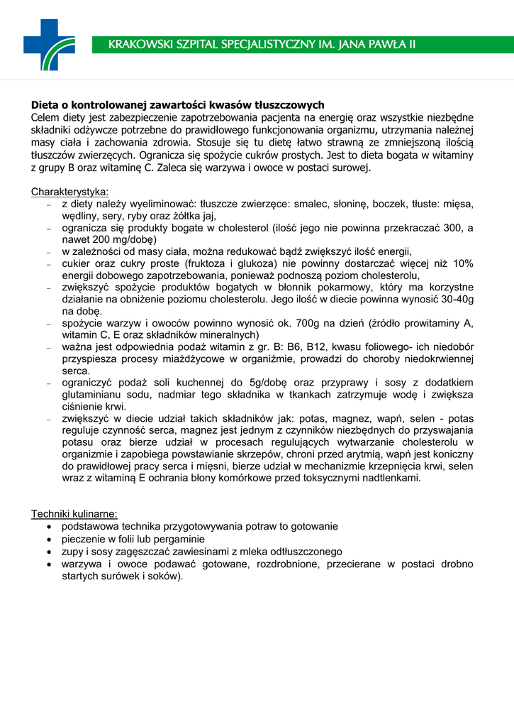 Dieta o kontrolowanej zawartości kwasów tłuszczowych Celem diety jest zabezpieczenie zapotrzebowania pacjenta na energię oraz wszystkie niezbędne składniki odżywcze potrzebne do prawidłowego funkcjonowania organizmu, utrzymania należnej masy ciała i zachowania zdrowia. Stosuje się tu dietę łatwo strawną ze zmniejszoną ilością tłuszczów zwierzęcych. Ogranicza się spożycie cukrów prostych. Jest to dieta bogata w witaminy z grupy B oraz witaminę C. Zaleca się warzywa i owoce w postaci surowej. Charakterystyka: z diety należy wyeliminować: tłuszcze zwierzęce: smalec, słoninę, boczek, tłuste: mięsa, wędliny, sery, ryby oraz żółtka jaj, ogranicza się produkty bogate w cholesterol (ilość jego nie powinna przekraczać 300, a nawet 200 mg/dobę) w zależności od masy ciała, można redukować bądź zwiększyć ilość energii, cukier oraz cukry proste (fruktoza i glukoza) nie powinny dostarczać więcej niż 10% energii dobowego zapotrzebowania, ponieważ podnoszą poziom cholesterolu, zwiększyć spożycie produktów bogatych w błonnik pokarmowy, który ma korzystne działanie na obniżenie poziomu cholesterolu. Jego ilość w diecie powinna wynosić 30-40g na dobę. spożycie warzyw i owoców powinno wynosić ok. 700g na dzień (źródło prowitaminy A, witamin C, E oraz składników mineralnych) ważna jest odpowiednia podaż witamin z gr. B: B6, B12, kwasu foliowego- ich niedobór przyspiesza procesy miażdżycowe w organiźmie, prowadzi do choroby niedokrwiennej serca. ograniczyć podaż soli kuchennej do 5g/dobę oraz przyprawy i sosy z dodatkiem glutaminianu sodu, nadmiar tego składnika w tkankach zatrzymuje wodę i zwiększa ciśnienie krwi. zwiększyć w diecie udział takich składników jak: potas, magnez, wapń, selen - potas reguluje czynność serca, magnez jest jednym z czynników niezbędnych do przyswajania potasu oraz bierze udział w procesach regulujących wytwarzanie cholesterolu w organizmie i zapobiega powstawianie skrzepów, chroni przed arytmią, wapń jest koniczny do prawidłowej pracy serca i mięsni, bierze udział w mechanizmie krzepnięcia krwi, selen wraz z witaminą E ochrania błony komórkowe przed toksycznymi nadtlenkami. Techniki kulinarne: podstawowa technika przygotowywania potraw to gotowanie pieczenie w folii lub pergaminie zupy i sosy zagęszczać zawiesinami z mleka odtłuszczonego warzywa i owoce podawać gotowane, rozdrobnione, przecierane w postaci drobno startych surówek i soków). Produkty zalecane: Napoje: słaba herbata: zielona, czerwona, chude mleko, kawa zbożowa z mlekiem, soki z owoców i warzyw, chude jogurty niskotłuszczowe Pieczywo: z pełnego przemiału, bułki grahamki, biszkopty na białkach, pieczywo z dodatkiem soi, słonecznika, Dodatki do pieczywa: chudy twaróg, serek homogenizowany, chude wędliny drobiowe, chuda szynka, dżemy niskosłodzone, białka jaj, serek sojowy, Zupy i sosy gorące: warzywne, owocowe, krupniki podprawiane zawiesiną z mleka i mąki, mleczne na mleku odtłuszczonym Dodatki do zup: bułki z pełnego przemiału, ryż, grzanki, kasze, ziemniaki, lane ciasto na białkach, makaron, Mięso, drób, ryby: chude gatunki mięs: cielęcina, indyk, kurczaki, królik, potrawy gotowane, duszone bez tłuszczu, ryby chude, Potrawy półmięsne i bezmięsne: budynie z kasz, warzyw, makaron z mięsem, leniwe pierogi na białkach, kluski ziemniaczane, risotto, Tłuszcze: olej rzepakowy, oliwa z oliwek, olej słonecznikowy, sojowy, kukurydziany Warzywa: świeże i mrożone, zwłaszcza suche nasiona roślin strączkowych: fasola, groch, soczewica, oraz pomidory, brokuły, brukselka, kalafior, marchew, dynia, cukinia, melon, kawon, sałata, szpinak, jarmuż, cebula, czosnek, buraki, selery, Ziemniaki: gotowane, pieczone Owoce: świeże, suszone, niskosłodzone, wszystkie koloru żółtopomarańczowego i zielonego, owoce jagodowe, cytrusowe, szczególnie borówki (czarne jagody), czarne porzeczki, grejpfruty, jabłka, morele, pigwy, winogrona czerwone, Desery: kompoty, galaretki owocowe, kisiele, sałatki owocowe, musy owocowe, biszkopty na białkach Przyprawy: korzenne Sosy zimne: sosy owocowe na bazie owoców jagodowych Produkty przeciwwskazane: mocna herbata, pełne mleko, alkohol, jogurt pełnotłusty świeże pieczywo z mąki wysoko oczyszczonej i z dużą ilością tłuszczu masło w dużych ilościach, sery pełnotłuste, smalec, konserwy, tłuste wędliny, żółtka zupy na wywarach mięsnych, kostnych, tłuste, zawiesiste, zasmażane, zaprawiane śmietaną kluski i ciasta francuskie mięsa tłuste i ryby: wieprzowina, baranina, podroby, gęsi, kaczki, potrawy smażone racuchy, bliny owocowe smażone w cieście, placki ziemniaczane tłuszcze zwierzęce: smalec, słonina, łój, margaryny twarde, olej palmowy, tłuszcze uwodornione warzywa i owoce: solone, konserwowane, orzechy solone ziemniaki: smażone na tłuszczu, frytki, krążki, placki torty, tłuste kremy, tłuste ciasta z dodatkiem żółtka ocet majonezy z żółtkiem, sosy i kremy ze śmietaną i dużą ilością tłuszczu. Literatura: H. Ciborowska, A. Rudnicka „Dietetyka, Żywienie zdrowego i chorego człowieka”. PZWL, rok 2014