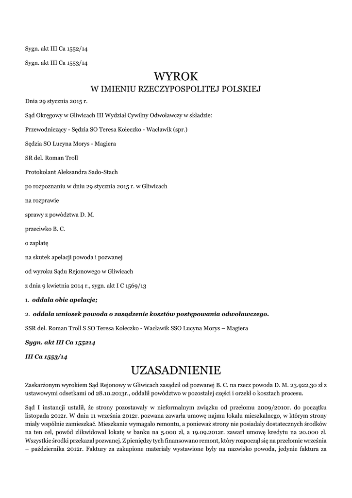 Sygn. akt III Ca 1552/14 Sygn. akt III Ca 1553/14 WYROK W IMIENIU RZECZYPOSPOLITEJ POLSKIEJ Dnia 29 stycznia 2015 r. Sąd Okręgowy w Gliwicach III Wydział Cywilny Odwoławczy w składzie: Przewodniczący - Sędzia SO Teresa Kołeczko - Wacławik (spr.) Sędzia SO Lucyna Morys - Magiera SR del. Roman Troll Protokolant Aleksandra Sado-Stach po rozpoznaniu w dniu 29 stycznia 2015 r. w Gliwicach na rozprawie sprawy z powództwa D. M. przeciwko B. C. o zapłatę na skutek apelacji powoda i pozwanej od wyroku Sądu Rejonowego w Gliwicach z dnia 9 kwietnia 2014 r., sygn. akt I C 1569/13 1. oddala obie apelacje; 2. oddala wniosek powoda o zasądzenie kosztów postępowania odwoławczego. SSR del. Roman Troll S SO Teresa Kołeczko - Wacławik SSO Lucyna Morys – Magiera Sygn. akt III Ca 155214 III Ca 1553/14 UZASADNIENIE Zaskarżonym wyrokiem Sąd Rejonowy w Gliwicach zasądził od pozwanej B. C. na rzecz powoda D. M. 23.922,30 zł z ustawowymi odsetkami od 28.10.2013r., oddalił powództwo w pozostałej części i orzekł o kosztach procesu. Sąd I instancji ustalił, że strony pozostawały w nieformalnym związku od przełomu 2009/2010r. do początku listopada 2012r. W dniu 11 września 2012r. pozwana zawarła umowę najmu lokalu mieszkalnego, w którym strony miały wspólnie zamieszkać. Mieszkanie wymagało remontu, a ponieważ strony nie posiadały dostatecznych środków na ten cel, powód zlikwidował lokatę w banku na 5.000 zł, a 19.09.2012r. zawarł umowę kredytu na 20.000 zł. Wszystkie środki przekazał pozwanej. Z pieniędzy tych finansowano remont, który rozpoczął się na przełomie września – października 2012r. Faktury za zakupione materiały wystawione były na nazwisko powoda, jedynie faktura za zakupione materiały do wykonania prac elektrycznych była wystawiona na nazwisko pozwanej. W grudniu 2012r. pozwana wystąpiła o skorygowanie wystawionych faktur na swoje nazwisko i wystąpiła do urzędu skarbowego o zwrot wydatków na remont. Ustalił też sąd, że do rąk pozwanej w okresie od lipca 2012r. do lutego 2012r. wypłacono kwotę 16.094,23 zł należną jej córce w związku ze śmiercią ojca. Po rozstaniu powód zażądał zwrotu zainwestowanych w remont środków i pozwana zadeklarowała zwrot kwoty 5.000 zł jak i kredytu, który miała spłacić uiszczając raty w wysokości 1.077,70 zł. miesięcznie. W dniu 19.11.2012r. przelała na rachunek powoda 1.077,70 zł, a przelew zatytułowała „opłata za ratę”. Ponadto strony będąc w związku kupiły lodówkę i pralkę, a także samochód F. (...), chociaż umowę kupna samochodu podpisała pozwana i partner jej matki E. T.. Samochód został sprzedany. W mieszkaniu mieszka obecnie pozwana z córką i ona też posiada wyłącznie lodówkę i pralkę. Powód pismem z 17.12.2012r. wezwał pozwaną do zwrotu ruchomości, a w pozwie zażądał z tego tytułu zasądzenia kwoty 5.480 zł. Ustalając powyższe w oparciu o wskazaną w pozwie podstawę z art. 405 k.c. uznał Sąd Rejonowy, że pozwany wykazał, iż przekazał pozwanej kwotę 25.000 zł. na remont mieszkania, w którym strony miały wspólnie zamieszkać, ale cel ten nie został osiągnięty, albowiem strony rozstały się. Dokonał więc przysporzenia na rzecz majątku pozwanej nie uzyskując ekwiwalentnego świadczenia, a to wieloletniego użyczenia lokalu mieszkalnego przez pozwaną i wspólnego zamieszkiwania w nim. Stąd świadczenie powoda jako nienależne w rozumieniu przepisu art. 410 § 2 k.c., na podstawie art. 405 k.c. podlegało zwrotowi przez pozwaną. Podniósł, że bez znaczenia jest okoliczność jaka część środków pieniężnych przekazana została na remont, albowiem postępowanie dowodowe wykazało, że środki pozostały w majątku pozwanej stanowiąc jej korzyść. Ponieważ pozwana przekazała powodowi jedną ratę w wysokości 1.077,70 zł., o tę kwotę pomniejszone zostało zasądzone w pkt 1 zaskarżonego wyroku roszczenie. Oddalając żądanie zwrotu wydatków poniesionych na zakup lodówki, pralki i samochodu uznał sąd I instancji powołując się na poglądy orzecznictwa i doktryny, iż ponieważ rzeczy ruchome nabyte w czasie trwania związku stron miały służyć im obojgu we wspólnym gospodarstwie, to do ich rozliczenia należy stosować przepisy o współwłasności w częściach ułamkowych, a w konsekwencji, ich rozliczenie jest możliwe w postępowania o zniesienie współwłasności, a nie w procesie opartym na przepisach o bezpodstawnym wzbogaceniu. O odsetkach sąd orzekł na podstawie art. 481 § 1 i 2 k.c. oraz art. 455 k.c., a orzeczenie o kosztach uzasadnił przepisem art. 100 k.p.c. Apelację od wyroku wniosły obydwie strony. Powód zaskarżył wyrok w części oddalającej powództwo i zarzucił naruszenie art. 210 k.c. poprzez jego niezastosowanie i oddalenie powództwa mimo prawidłowego ustalenia, iż samodzielnie zakupił samochód, pralkę i lodówkę. Podniósł, że rozstrzygnięcie w tym przedmiocie było możliwe w niniejszym postępowaniu. Przedstawiając powyższy zarzut wniósł o zmianę zaskarżonego wyroku poprzez uwzględnienie powództwa w całości i zasądzenie od pozwanej na swoją rzecz kosztów postępowania za obie instancje, ewentualnie o uchylenie wyroku w zaskarżonej części i przekazanie sprawy w tym zakresie sądowi I instancji do ponownego rozpoznania. Pozwana zaskarżyła wyrok w części uwzględniającej powództwo i zarzuciła naruszenie przepisów postępowania poprzez błędną ocenę materiału dowodowego będącego podstawą ustaleń faktycznych stanowiących podstawę rozstrzygnięcia. Podniosła, że sąd I instancji pomijał zgłaszane przez nią wnioski dowodowe, nie przyjmował jej wyjaśnień i nawet ich nie zapisywał uznając je za nieważne. Zarzuciła bezkrytyczne zaakceptowanie materiału dowodowego przedstawionego przez powoda jako wiarygodnego i bezpodstawne pozbawienie waloru wiarygodności części jej zeznań i zeznań świadków pr