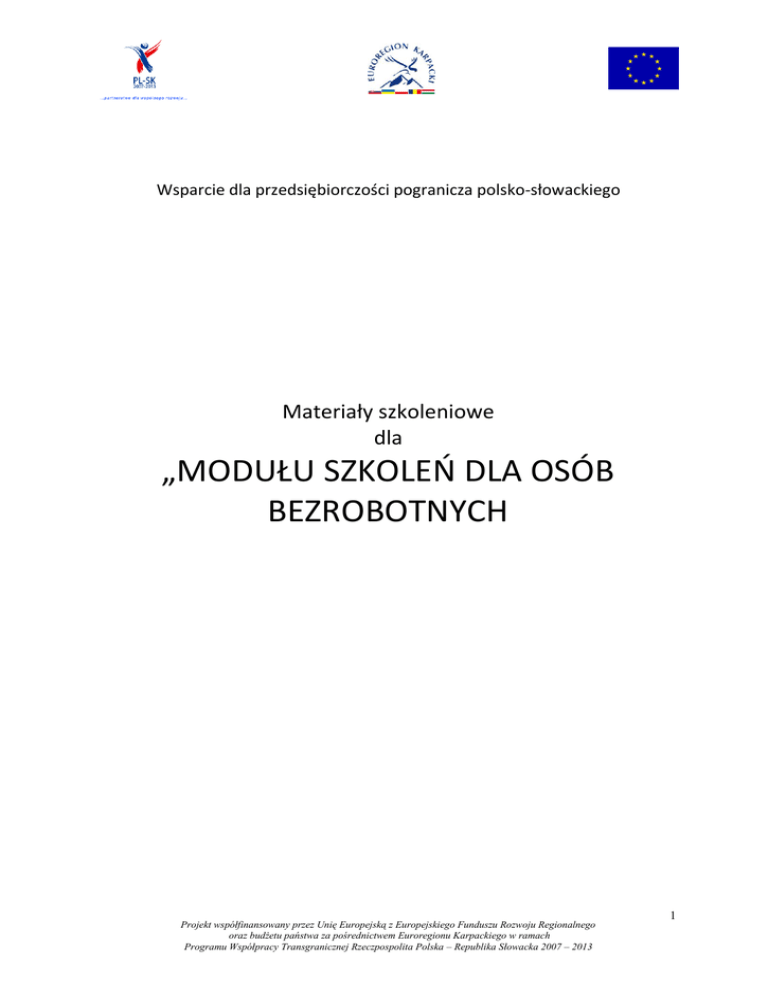 Wsparcie dla przedsiębiorczości pogranicza polsko-słowackiego Materiały szkoleniowe dla „MODUŁU SZKOLEŃ DLA OSÓB BEZROBOTNYCH Projekt współfinansowany przez Unię Europejską z Europejskiego Funduszu Rozwoju Regionalnego oraz budżetu państwa za pośrednictwem Euroregionu Karpackiego w ramach Programu Współpracy Transgranicznej Rzeczpospolita Polska – Republika Słowacka 2007 – 2013 1 Opracował Jerzy Jagustyn AKTYWNE POSZUKIWANIE PRACY Kontrakt –osobiste informacje traktowane są jako poufne, zadawanie pytań jest ok, każdy ma prawo do własnego zdania, wzajemnie słuchamy się i poświęcamy sobie uwagę, otwarcie dzielimy się uwagami i odczuciami, nie przeszkadzamy innym w zajęciach, wyciszamy telefony, dotrzymujemy umów. Przedstawienie się słuchaczy – wywiady. Dlaczego ludzie pracują – burza mózgów. Praca to główny rodzaj aktywności ludzi w życiu dorosłym. Określa ich znaczenie , oraz pozycję społeczną. Warunkuje poziom rozwoju człowieka, jego fachowość, sprawność. Często staje się sensem życia. Zwykle stanowi główne źródło dochodów. Kształtuje styl życia, ma wpływ na system wartości wielu ludzi. Moja idealna praca – określenie preferencji zawodowych. Wyobraźmy sobie siebie w wymarzonej roli zawodowej. Nie ma żadnych ograniczeń. Co nas pociąga w danej roli zawodowej? W jakich pokrewnych zawodach można zrealizować swoje marzenia zawodowe? Umiejętności – to co potrafię robić(na czym dobrze się znam), bez konieczności powtórnego uczenia się. Kwalifikacje – potwierdzony zasób wiedzy i umiejętności, dzięki któremu człowiek może wykonywać powierzone mu zadania (dyplomy szkolne, certyfikaty, dodatkowe uprawnienia do wykonywania zawodu). Mocne strony. Duży wpływ na karierę zawodową każdego człowieka ma wiedza o samym sobie. Obraz własnej osoby kształtuje się już w dzieciństwie, stając się coraz bardziej stabilny. Według Donalda Supera, zawodowy obraz własnej osoby rozwija się wraz z rozwojem życia człowieka na podstawie obserwacji pracy, identyfikowania się z pracującymi dorosłymi, oraz innych doświadczeń. Ważnym elementem obrazu własnej osoby jest samoocena swoich zdolności. Zdolności rozumiane są jako predyspozycje do robienia czegoś, do wykonywania lepiej od innych pewnych czynności. Zdolności oznaczają głównie łatwość uczenia się i nabywania określonych sprawności. Zdolności mogą być przeciętne, wybitne, lub przybrać formę talentu. Zdolności decydują o powodzeniu człowieka w określonej działalności, o efektach nauki w szkole, o sukcesach i zadowoleniu z wykonywanej pracy. Pełna, obiektywna diagnoza zdolności możliwa jest podczas Projekt współfinansowany przez Unię Europejską z Europejskiego Funduszu Rozwoju Regionalnego oraz budżetu państwa za pośrednictwem Euroregionu Karpackiego w ramach Programu Współpracy Transgranicznej Rzeczpospolita Polska – Republika Słowacka 2007 – 2013 2 indywidualnych badań psychologicznych. Istotne jest także subiektywne spojrzenie uczestnika na swoje mocne i słabe strony. Pomaga to w odpowiedzi na pytania: - jak dobrze znam samego siebie - jak dobrze znają mnie inni - jak łatwo daję się poznać - jak łatwo się uczę Ćwiczenie 1. Uświadomienie sobie swoich mocnych stron. Załącznik A. Każdy z uczestników na kartce zapisuje swoje trzy mocne strony. Mogą to być umiejętności, zdolności, cechy charakteru. Następnie zagina kartę, ukrywając napisy i prosi trzech kolegów, aby napisali na jego kartce po jednej pozytywnej opinii na ich temat, za każdym razem ukrywając napis. Ochotnicy odczytują swoje listy. Wybierają po jednej mocnej stronie, które mogą im się przydać w pracy zawodowej. Następnie z listy w załączniku A każdy zakreśla te przymiotniki, które najlepiej go opisują. Ochotnicy czytają zakreślone cechy. Analiza: jakie trudności były z wykonaniem tego ćwiczenia. Kiedy było łatwiej, przed podaniem listy, czy po? Ćwiczenie 2. Obraz własnej osoby. Załącznik B. Uczestnicy wypełniają załącznik B. Analiza: jakie znaczenie ma otwartość w kontaktach z ludźmi? ( aby inni byli otwarci, sami musimy tacy być). Nie oznacza to mówienie o sprawach intymnych, raczej oznacza spontaniczność i szczerość. Sami decydujemy o granicach naszej otwartości) Czy ktoś z uczestników chce przeczytać odpowiedzi na pytania ? Zainteresowania - jest to względnie trwała dążność do poznawania otaczającego świata, przybierająca postać aktywności poznawczej o określonym natężeniu. Tostan wzmożonej uwagi i skupienie się na czymś. A Wy, czym się interesujecie? Wartościzawodowe Wartości to podstawowe ludzkie przekonania. Są źródłem motywacji, oraz osobistych standardów działania w danej dziedzinie. Dzięki wartościom człowiek zdobywa dobra materialne i niematerialne, albo ich unika. Według niektórych badaczy, wartości są celami, które są człowiekowi niezbędne do zaspokojenia potrzeby. Zainteresowania zaś są konkretnymi działaniami, poprzez które można realizować wartości i zaspokajać potrzeby. Wartości pomagają zrozumieć, jak ludzie działają i dlaczego to robią. Zainteresowania dotyczą tego, co ludzie robią. Zwykle wartości nie funkcjonują pojedynczo, lecz tworzą systemy wartości, ułożone hierarchicznie. Ćwiczenie 3. Uświadomienie wartości w pracy zawodowej. Załącznik C. Uczestnicy wypełniają załącznik C – „Moja Kariera”. Analiza: omówienie kwestionariusza. Cele – to marzenia o nieprzekraczalnym terminie realizacji. Dobrze wyznaczone cele pomogą na określenie, co jest ważne w Twoim życiu i zmotywują do działania. Cel jest tym, czego chcesz, a zadanie tym, co musisz zrobić, by osiągnąć cel. Projekt współfinansowany przez Unię Europejską z Europejskiego Funduszu Rozwoju Regionalnego oraz budżetu państwa za pośrednictwem Euroregionu Karpackiego w ramach Programu Współpracy Transgranicznej 