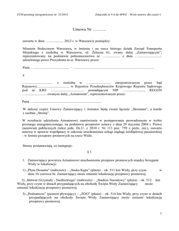 ZTM-przetarg nieograniczony nr 22/2012 Załącznik nr 4 A do SIWZ – Wzór umowy dla części I. Umowa Nr …......... zawarta w dniu …................ 2012 r. w Warszawie pomiędzy: Miastem Stołecznym Warszawa, w imieniu i na rzecz którego działa Zarząd Transportu Miejskiego z siedzibą w Warszawie, ul. Żelazna 61, zwany dalej „Zamawiającym”, reprezentowany na podstawie pełnomocnictwa nr …................ z dnia ….......................... udzielonego przez Prezydenta m.st. Warszawy przez: Pana …....................................... – …...................................................................................... a ….............................. z siedzibą w …....................... zarejestrowanym przez Sąd Rejonowy.................................... w Rejestrze Przedsiębiorców Krajowego Rejestru Sądowego pod nr KRS …................................. posiadającym NIP …...................., REGON …....................... zwanym dalej „Armatorem”, reprezentowanym przez: Pana …........................................................................... W dalszej części Umowy Zamawiający i Armator będą zwani łącznie „Stronami”, a każde z osobna „Stroną”. W rezultacie udzielenia Armatorowi zamówienia w postępowaniu prowadzonym w trybie przetargu nieograniczonego, na podstawie przepisów ustawy z dnia 29 stycznia 2004 r. Prawo zamówień publicznych (tekst jedn. Dz.U. z 2010 r. Nr 113 poz. 759 z późn. zm.), zawarto umowę w sprawie współpracy w zakresie uruchomienia usługi żeglugi śródlądowej pasażerskiej - w formie przepraw promowych na rzece Wiśle. Strony postanawiają, co następuje: §1 1. Zamawiający powierza Armatorowi uruchomienie przepraw promowych między brzegami Wisły w lokalizacji: 1) „Płyta Desantu” (nabrzeże) – „Saska Kępa” (plaża) – ok. 511 km Wisły, przy czym dniu 16 czerwca br. Zamawiający może zmienić lokalizację przeprawy promowej. w 2) „Bulwar Grzymały - Siedleckiego” (nabrzeże) – „Stadion Narodowy” (plaża) – ok. 512 km Wisły, przy czym w dniach przypadających na obchody Święta Wisły Zamawiający może zmienić lokalizację przeprawy promowej. 3) „Podzamcze” (pomost pływający) – „ZOO” (plaża) – ok. 514 km Wisły, przy czym w dniach przypadających na obchody Święta Wisły Zamawiający może zmienić lokalizację przeprawy promowej. 1 ZTM-przetarg nieograniczony nr 22/2012 Załącznik nr 4 A do SIWZ – Wzór umowy dla części I. 2. Rejsy odbywać się będą w okresie: a) 1 maja - 30 czerwca 2012 r. w soboty, niedziele i dni świąteczne (jako dzień świąteczny traktuje się również 2.05 i 4.05. 2012) - 30 rejsów dziennie, b) 1 lipca - 31 sierpnia 2012 r.: ▪ w dni robocze - 14 rejsów dziennie, ▪ w soboty, niedziele i dni świąteczne - 30 rejsów dziennie, c) za rejs uznaje się przeprawę promem z jednego brzegu Wisły na drugi i z powrotem. 3. Zamawiający w okresie trwania umowy zastrzega sobie możliwość dodatkowego zlecenia 360 rejsów. O terminach organizowanych rejsów Zamawiający powiadomi Armatora z siedmiodniowym wyprzedzeniem - zgodnie z Specyfikacją Istotnych Warunków Zamówienia. §2 Armator oświadcza, że: 1) każdy z promów: a) jest dopuszczony do pasażerskiej żeglugi śródlądowej bez ograniczeń w rejonie 3, b) posiada wszelkie wymagane przepisami prawa ubezpieczenia, c) posiada komplet środków bezpieczeństwa, w ilości zgodnej ze Świadectwem Zdolności Żeglugowej, d) zapewnia możliwość jednorazowego przewozu nie mniej niż 12 pasażerów wraz z bagażem osobistym, co Armator udokumentował poprzez złożenie: kserokopii Świadectwa Zdolności Żeglugowej stanowiącej załącznik nr 1 oraz polisy OC stanowiącej załącznik nr 2 do umowy. Powyższe załączniki muszą być ważne w czasie świadczenia usług objętych Umową. Aktualizacja załączników wymaga dostarczenia kserokopii Zamawiającemu – nie wymaga aneksu do Umowy. e) wyposażony jest w trap umożliwiający bezpieczne i łatwe wsiadanie/wysiadanie pasażerom, w tym osobom niepełnosprawnym poruszającym się na wózkach inwalidzkich oraz osobom niewidomym poruszającym się z psem przewodnikiem; 2) posiada stosowną wiedzę merytoryczną oraz kwalifikacje, a także możliwości techniczne w podjęciu działań niezbędnych do zrealizowania przedmiotu umowy; 3) członkowie załogi promów posiadają wymagane prawem zezwolenia i uprawnienia, zgodnie z Rozporządzeniem Ministra Infrastruktury z dnia 23 stycznia 2003 r. (Dz.U. Nr 50, poz. 427 z późn. zm.) w sprawie kwalifikacji zawodowych i składu załóg statków żeglugi śródlądowej. §3 1. Zamawiający zleca, a Armator zobowiązuje się do realizacji rejsów, o których mowa w § 1, po wyznaczonej trasie, według przekazanego przez Zamawiającego rozkładu kursowania promów. 2. W przypadku udokumentowanej awarii promu Zamawiający może zezwolić na wykonanie rejsu promem zastępczym, przy czym prom ten musi spełniać wszystkie kryteria określone w umowie. Ponadto Armator zobowiązany będzie do okazania dokumentów promu zastępczego, o których mowa w § 2, na każde żądanie Zamawiającego. 2 ZTM-przetarg nieograniczony nr 22/2012 Załącznik nr 4 A do SIWZ – Wzór umowy dla części I. §4 1. Armator ponosi odpowiedzialność za organizację i bezpieczeństwo zaokrętowania i wyokrętowania pasażerów na/z prom/u. 2. Armator odpowiada za szkody, jakie podróżujący poniósł wskutek przedwczesnego odpłynięcia, opóźnionego przypłynięcia lub odwołania rejsu promu. 3. W przypadku uszkodzenia lub utraty rzeczy przewożonych pod nadzorem podróżnego, Armator za rzeczy te ponosi odpowiedzialność tylko wówczas, jeżeli szkoda powstała z jego winy. §5 Armator zobowiązany jest do: 1) prowadzenia bezpłatnych rejsów dla pasażerów; 2) prowadzenia na bieżąco statystyki z ilości przewiezionych osób, za pomocą programu komputerowego, zwanego d