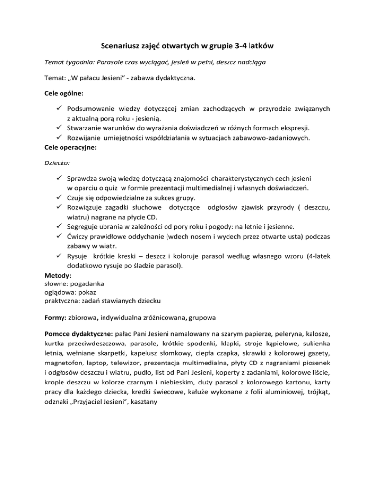 Scenariusz zajęć otwartych w grupie 3-4 latków Temat tygodnia: Parasole czas wyciągać, jesieo w pełni, deszcz nadciąga Temat: „W pałacu Jesieni” - zabawa dydaktyczna. Cele ogólne: Podsumowanie wiedzy dotyczącej zmian zachodzących w przyrodzie związanych z aktualną porą roku - jesienią. Stwarzanie warunków do wyrażania doświadczeo w różnych formach ekspresji. Rozwijanie umiejętności współdziałania w sytuacjach zabawowo-zadaniowych. Cele operacyjne: Dziecko: Sprawdza swoją wiedzę dotyczącą znajomości charakterystycznych cech jesieni w oparciu o quiz w formie prezentacji multimedialnej i własnych doświadczeo. Czuje się odpowiedzialne za sukces grupy. Rozwiązuje zagadki słuchowe dotyczące odgłosów zjawisk przyrody ( deszczu, wiatru) nagrane na płycie CD. Segreguje ubrania w zależności od pory roku i pogody: na letnie i jesienne. Ćwiczy prawidłowe oddychanie (wdech nosem i wydech przez otwarte usta) podczas zabawy w wiatr. Rysuje krótkie kreski – deszcz i koloruje parasol według własnego wzoru (4-latek dodatkowo rysuje po śladzie parasol). Metody: słowne: pogadanka oglądowa: pokaz praktyczna: zadao stawianych dziecku Formy: zbiorowa, indywidualna zróżnicowana, grupowa Pomoce dydaktyczne: pałac Pani Jesieni namalowany na szarym papierze, peleryna, kalosze, kurtka przeciwdeszczowa, parasole, krótkie spodenki, klapki, stroje kąpielowe, sukienka letnia, wełniane skarpetki, kapelusz słomkowy, ciepła czapka, skrawki z kolorowej gazety, magnetofon, laptop, telewizor, prezentacja multimedialna, płyty CD z nagraniami piosenek i odgłosów deszczu i wiatru, pudło, list od Pani Jesieni, koperty z zadaniami, kolorowe liście, krople deszczu w kolorze czarnym i niebieskim, duży parasol z kolorowego kartonu, karty pracy dla każdego dziecka, kredki świecowe, kałuże wykonane z folii aluminiowej, trójkąt, odznaki „Przyjaciel Jesieni”, kasztany Przebieg zajęd: 1. „Piosenka na powitanie” Nauczyciel śpiewa piosenkę i zaprasza dzieci do koła. Dzieci włączają się do wspólnego śpiewania i zabawy. 2. „List od Jesieni” Wprowadzenie w tematykę zajęcia. Odczytanie listu zaadresowanego do przedszkolaków. 3. „Listopadowa piosenka” – marsz przy piosence. Dzieci tworzą pociąg i maszerują przy piosence do pałacu Jesieni. W czasie refrenu na słowa „kap, kapu, kap” - zatrzymują się , rytmicznie wypowiadają słowa i jednocześnie wyklaskują rytm. Siadają na dywanie, nauczyciel odsłania pałac. Do pałacu przypięte są koperty z zadaniami, które w trakcie zajęcia będą po kolei odpinane. 4. „Zaczarowana garderoba” (koperta nr 1) Nauczyciel stawia przed dziedmi pudło (jesienna szafa), w którym znajdują się ubrania letnie i jesienne . Dzieci proponują zrobid porządek w szafie Pani Jesieni. „Porządki w szafie” – zabawa dydaktyczna. Nauczyciel dzieli dzieci na dwie grupy. Każda grupa siada w kole. W jednym kole znajduje się słooce, a w drugim chmura deszczowa. Na środku sali leżą ubrania potrzebne do zabawy. I grupa – wybór ubrao na jesienny spacer, uzasadnienie swojego wyboru. II grupa – wybór ubrao letnich, uzasadnienie swojego wyboru. 5. „Komnata wiatru” – (koperta nr 2) „Wiatr” - zagadka słuchowa. Nauczyciel włącza magnetofon z nagraniem szumu wiatru. Dzieci odgadują, że znajdują się w komnacie wiatru. „Podmuchy wiatru” – dwiczenia oddechowe. Dzieci zamienione w wiatr pracują w grupach przy stolikach. Każda grupa otrzymuje listki z kolorowej gazety. Zadaniem dzieci jest dmuchad z całej siły w listki, aby pospadały ze stolika. Po zabawie dzieci sprzątają po sobie, aby Pani Jesieo miała mniej pracy. 6. „Komnata deszczu”- (koperta nr 3) „Deszcz” - zagadka słuchowa. Nauczyciel włącza magnetofon z nagraniem odgłosów deszczu. Dzieci odgadują, że znajdują się w komnacie deszczu. „Kolorowy deszcz” – zabawa plastyczna przy muzyce. Nauczyciel mówi dzieciom, że Pani Jesieo ma już dośd szarości za oknem. W czasie śpiewania piosenki dzieci mają narysowad kredkami kolorowy deszcz i pokolorowad parasolki według własnego pomysłu. Nauczyciel nagradza prace „słoneczkiem”. „Omio kałuże”- zabawa ruchowa. Dzieci biegają omijając kałuże, gdy trójkąt cichnie – przyklękają i przyglądają się w kałuży (folia aluminiowa) robiąc różne miny. 7. „Komnata telewizyjna” – (koperta nr 4) „Co wiemy o jesieni?” – prezentacja multimedialna. Dzieci zajmują miejsce przed telewizorem. Nauczyciel rozdaje dzieciom po jednym listku (w trzech kolorach). Dzieci podzielone na grupy biorą udział w quizie. Podnoszą listek w górę, kiedy zdanie jest prawdziwe. Za każdą dobrą odpowiedź grupa otrzymuje kasztana. Nauczyciel podlicza kasztany i wyłania zwycięzców. Wszyscy biją brawa. 8. „Powrót do przedszkola” Dzieci ustawiają się w pociąg i wracają do przedszkola na paluszkach, aby nie przeszkadzad zwierzętom w przygotowaniach do zimy. 9. „Przyjaciel Jesieni” – podsumowanie zajęd. Nauczyciel wręcza dzieciom nagrodę - odznakę „Przyjaciela Jesieni”. Dziękuje za wspólną zabawę. Wyróżnia dzieci szczególnie aktywne w zajęciach. 10. Ewaluacja „Kropelka czarna czy błękitna” Na dywanie leżą kropelki deszczu- czarne i błękitne. Dzieci wybierają jedną, z którą utożsamiają swoje odczucia i przyklejają do dużego parasola. Opracowanie i prowadzenie: Beata Birycka