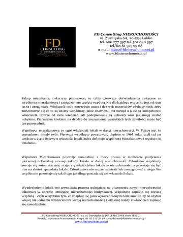 FD Consulting NIERUCHOMOŚCI ul. Zwycięska 6A, 20-554 Lublin tel. 606 277 397 tel. 501 040 597 tel/fax 81 525 29 68 e-mail: [email protected] www.fdnieruchomosci.pl Zakup mieszkania, zwłaszcza pierwszego, to także pierwsze doświadczenia związane ze wspólnotą mieszkaniową i zarządzaniem częścią wspólną. Nie dla każdego wszystko jest od razu jasne i zrozumiałe. Większość osób potrzebuje czasu i dobrych materiałów edukacyjnych, żeby zorientować się co to są koszty wspólnoty, jakie obowiązki ma zarząd a jakie są kompetencje właścicieli. Dobrze od razu wiedzieć, jak podejmowane są uchwały oraz jak mogą zostać uchylone. Pierwszym krokiem na drodze do zrozumienia wszystkich tych zawiłości może być ten przewodnik. Wspólnota mieszkaniowa to ogół właścicieli lokali w danej nieruchomości. W Polsce jest to stosunkowo młody twór. Pierwsze wspólnoty powstawały dopiero w 1995 roku, czyli tuż po wejściu w życie Ustawy o własności lokali, która definiuje Wspólnotę Mieszkaniową i reguluje jej działanie. Wspólnota Mieszkaniowa powstaje samoistnie, z mocy prawa, w momencie podpisania pierwszej notarialnej umowy zakupu lokalu w danej nieruchomości. Członkiem wspólnoty zostaje się automatycznie, stając się właścicielem lokalu w nieruchomości, a przestaje się być nim na skutek sprzedaży lokalu. Członkostwa nie można zawiesić lub zrezygnować z niego. We wspólnocie pozostaje się tak długo, jak długo posiada się akt własności lokalu. Wyodrębnienie lokali jest czynnością prawną polegającą na utworzeniu nowej nieruchomości lokalowej w obrębie istniejącej nieruchomości budynkowej. Wspólnota zajmuje się częścią wspólną – czyli wszystkim tym, co znajduje się poza wyodrębnionymi lokalami i służy do użytku więcej niż jednemu właścicielowi. Swoją nieruchomością (lokalem) każdy z właścicieli zajmuje się samodzielnie. FD Consulting NIERUCHOMOŚCI s.c. ul. Zwycięska 6a (GALERIA ZONE obok TESCO) Kontakt: Adrianna Franczewska- Krupa, tel. 81 525 29 68 [email protected] www.fdnieruchomosci.pl Wspólnota – ogół właścicieli lokali wyodrębnionych w ramach nieruchomości. Określenie nieruchomości (działka gruntu, budynki) znajduje się w księdze wieczystej. Wyodrębnienie lokali jest czynnością prawną polegającą na utworzeniu nowej nieruchomości (lokalowej) w obrębie istniejącej budynkowej. Wspólnota zajmuje się częścią wspólną – czyli wszystkim tym, co znajduje się poza wyodrębnionymi lokali i służy do użytku więcej niż jednemu właścicielowi. Swoją nieruchomością (lokalem) każdy z właścicieli zajmuje się samodzielnie. Koszty wspólnoty – są to środki wydawane na utrzymanie części wspólnych, kosztem części wspólnej nie są np. koszty mediów dostarczanych do lokali – wspólnota jest jedynie pośrednikiem pomiędzy odbiorcą (właścicielem lokalu) a dostawcą (MPWiK, LPEC). Te koszty rozliczane są bez wyniku – tj. na "0" – właściciel lokalu na koniec roku otrzymuje rozliczenie zaliczek do kosztów - ze zwrotem nadpłaty lub koniecznością dopłaty. Zarząd wspólnotą – tzw. duże wspólnoty (powyżej 7 lokali wyodrębnionych) zgodnie z ustawą określają sposób zarządzania – zarząd może składać się z osób fizycznych wybranych uchwałą przez właścicieli lub może być powierzony osobie prawnej (firmie) w formie notarialnej, z wpisem do księgi wieczystej. Zmiana sposobu zarządzania – może nastąpić w formie uchwały wspólnoty, protokołowanej notarialnie. Notariusz na podstawie uchwały podjętej większością udziałów formułuje wniosek i zmienia wpis w księdze wieczystej. Czynności zarządu/zarządcy zarządca podejmuje samodzielnie czynności tzw. zwykłego zarządu – czyli wszelkie jakie dotyczą bieżących czynności zabezpieczających prawidłowe funkcjonowanie nieruchomości – zawiera umowy dot. dostawy energii elektrycznej, cieplnej, wody, konserwacji , sprzątania itp. Poza zakresem zwykłego zarządu zarządca podejmuje te czynności, do których upoważniają go uchwały wspólnoty. Kompetencje właścicieli – to uchwalenie planu gospodarczego i wysokości opłat na utrzymanie nieruchomości wspólnej, zbycie/nabycie, podział/scalenie nieruchomości, określenie granic części wspólnej, ustalenie sposobu ewidencji pozaksięgowej, zmianę udziałów w nieruchomości, oraz wszelkie inne decyzje nie dotyczące bieżącego utrzymania nieruchomości. Wnioski ws. działalności wspólnoty, projekty uchwał – są składane zarządcy – który podejmuje decyzję o ich realizacji samodzielnie (jeśli dotyczą zakresu zwykłego zarządu) lub decyduje o przedstawieniu współwłaścicielom (jeśli przekraczają kompetencje zarządcy). W przypadku wniosku sygnowanego przez 10% właścicieli, zarządca musi zwołać zebranie i poddać wniosek do decyzji wspólnoty. Uchwały wspólnoty – zawsze muszą być podjęte większością udziałów właścicieli. Właściciele mogą w konkretnej sprawie przyjąć sposób głosowania 1 właściciel =1 głos – ale muszą o tym postanowić w trybie podstawowym – czyli większością udziałów. Ustawa przewiduje możliwość ustalenia zmiany trybu głosowania kwalifikowaną liczbą 20% udziałów – ale tylko w przypadkach błędów w sumie udziałów bądź istnienia udziałowca dominującego – posiadającego ponad połowę udziałów. FD Consulting NIERUCHOMOŚCI s.c. ul. Zwycięska 6a (GALERIA ZONE obok TESCO) Kontakt: Adrianna Franczewska- Krupa, tel. 81 525 29 68 [email protected] www.fdnieruchomosci.pl Zebranie wspólnoty – zwoływane jest przez zarządcę. O zebraniu zarządca musi zawiadomić właścicieli na 7 dni przed jego planowanym terminem. Zebranie jest prawomocne bez względu na liczbę uczestniczących właścicieli. Uchwały można podejmować głosami częściowo oddanymi na zebraniu, częściowo w drodze indywidualnego zbierania. Uchwały staj