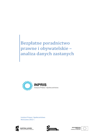 0 Bezpłatne poradnictwo prawne i obywatelskie – analiza danych zastanych Instytut Prawa i Społeczeństwa Warszawa 2012 r. 1 Spis treści Analiza Danych Zastanych - wnioski ........................................................................................................ 5 I. Poradnictwo prawne i obywatelskie – problem definicji – wnioski ............................................ 5 II. Przegląd literatury na temat dostępności i korzystania z pomocy prawnej, przygotowany – wnioski i rekomendacje .............................................................................................................. 6 III. Wnioski z badań ewaluacyjnych projektów poradnictwa realizowanych w ramach Programu Operacyjnego Kapitał Ludzki ...................................................................................................... 9 IV. Poradnictwo prawne i obywatelskie w dokumentach strategicznych – wnioski ...................... 10 V. Dotychczasowe projekty ustaw dotyczące systemowych rozwiązań poradnictwa prawnego – wnioski ...................................................................................................................................... 10 VI. Źródła finansowania poradnictwa – wnioski ............................................................................. 11 VII. Ekonomiczna analiza problematyki poradnictwa prawnego i obywatelskiego – wnioski ........ 12 VIII. System poradnictwa prawnego i obywatelskiego z perspektywy ekonomicznej – wnioski ..... 14 IX. Ubezpieczenia pomocy prawnej – wnioski ............................................................................... 18 X. Podmioty świadczące poradnictwo prawne - wnioski .............................................................. 18 XI. Analiza porównawcza zagranicznych modeli systemów pomocy prawnej - wnioski................ 20 XII. Analiza wybranych polskich, europejskich oraz międzynarodowych przepisów prawa dotyczących nieodpłatnej pomocy prawnej oraz standardów konstytucyjnych – wnioski ..... 22 XIII. Standardy w poradnictwie prawnym i obywatelskim – wnioski ............................................... 23 XIV. Polskie i zagraniczne instytucje wspierające poradnictwo prawne i obywatelskie – wnioski .. 24 XV. Odpowiedzialność cywilna – wnioski ........................................................................................ 25 XVI. Elementy równości płci w analizie danych zastanych ............................................................... 26 CZĘŚĆ I ................................................................................................................................................... 28 1. Autorzy, opis metody pracy oraz doboru materiałów .............................................................. 28 CZĘŚĆ II .................................................................................................................................................. 31 1. Poradnictwo prawne i obywatelskie – problem definicji .......................................................... 31 2. Przegląd literatury na temat dostępności i korzystania z pomocy prawnej, przygotowany na potrzeby projektu „Opracowanie kompleksowych i trwałych mechanizmów wsparcia dla poradnictwa prawnego i obywatelskiego w Polsce” ................................................................ 41 3. Badania ewaluacyjne w ramach programu „Tworzenie i wdrażanie programów z zakresu poradnictwa prawnego i obywatelskiego Programu Operacyjnego Kapitał Ludzki 2007 – 2013.” ..................................................................................................................................... 104 4. Wybrane krajowe i zagraniczne instytucje zajmujące się problematyką poradnictwa prawnego lub obywatelskiego ................................................................................................................. 113 a) International Legal Aid Group .............................................................................................. 113 b) The Global Network for Public Interest Law ........................................................................ 113 2 c) Open Society Justice Initiative ............................................................................................. 114 d) CEPEJ: The European Commission for the Efficiency of Justice ........................................... 115 e) Citizens Advice International ............................................................................................... 116 f) Uniwersytet w Tilburgu ........................................................................................................ 117 g) NAMATI – Innovations in Legal Empowerment ................................................................... 118 h) Fundacja Uniwersyteckich Poradni Prawnych ..................................................................... 119 i) Instytut Spraw Publicznych .................................................................................................. 120 j) Instytut Prawa i Społeczeństwa INPRIS................................................................................ 121 k) Związek Biur Porad Obywatelskich ...................................................................................... 122 l) Helsińska Fundacja Praw Człowieka .................................................................................... 123 m) Samorząd adwokacki i radców prawnych ............................................................................ 124 5. Krajowe podmioty udzielające porad i informacji prawnych i obywatelskich ........................ 127 a) Biuro obsługi interesantów w sądach powszechnych w aspekcie udzielania bezpłatnych porad prawnych ................................................................................................................... 127 b) Prokuratura w systemie bezpłatnego poradnictwa prawnego...