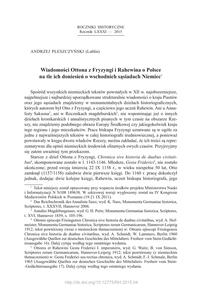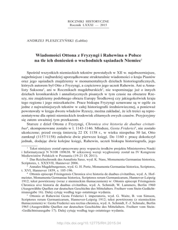 ROCZNIKI HISTORYCZNE Rocznik LXXXI — 2015 ANDRZEJ PLESZCZYŃSKI (Lublin) Wiadomości Ottona z Fryzyngi i Rahewina o Polsce na tle ich doniesień o wschodnich sąsiadach Niemiec1 Spośród wszystkich niemieckich tekstów powstałych w XII w. najobszerniejsze, najpełniejsze i najbardziej uporządkowane strukturalnie wiadomości o kraju Piastów oraz jego sąsiadach znajdziemy w monumentalnych dziełach historiograficznych, których autorem był Otto z Fryzyngi, a częściowo jego uczeń Rahewin. Ani u Annalisty Saksona2, ani w Rocznikach magdeburskich3, nie wspominając już o innych dziełach kronikarskich i annalistycznych pisanych w tym czasie na obszarze Rzeszy, nie znajdziemy podobnego obrazu Europy Środkowej czy jakiegokolwiek kraju tego regionu i jego mieszkańców. Prace biskupa Fryzyngi uznawane są w ogóle za jedne z najważniejszych tekstów w całej historiografii średniowiecznej, a ponieważ powstawały w kręgu dworu władców Rzeszy, można zakładać, że ich treści są reprezentatywne dla opinii niemieckich środowisk elitarnych owych czasów. Przyjrzyjmy się zatem uważniej tym przekazom. Starsze z dzieł Ottona z Fryzyngi, Chronica sive historia de duabus civitatibus4, skomponowane zostało w l. 1143-1146. Młodsze, Gesta Friderici5, nie zostało ukończone; przed swoją śmiercią 22 IX 1158 r., w wieku niespełna 50 lat, Otto zamknął (1157/1158) zaledwie dwie pierwsze księgi. Do 1160 r. pracę dokończył jednak, dodając dwie kolejne księgi, Rahewin, uczeń biskupa historiografa, jego Tekst niniejszy został opracowany przy wsparciu środków projektu Ministerstwa Nauki i Informatyzacji N N108 189638. W szkicowej wersji wygłoszony został na IV Kongresie Mediewistów Polskich w Poznaniu (19-21 IX 2011). 2 Das Reichschronik des Annalista Saxo, wyd. K. Nass, Monumenta Germaniae historica, Scriptores, t. XXXVII, Hannover 2006. 3 Annales Magdeburgenses, wyd. G. H. Pertz, Monumenta Germaniae historica, Scriptores, t. XVI, Hannover 1859, s. 105-196. 4 Ottonis episcopi Frisingensis Chronica sive historia de duabus civitatibus, wyd. A. Hofmeister, Monumenta Germaniae historica, Scriptores rerum Germanicarum, Hannover-Leipzig 1912; tekst powtórzony (wraz z niemieckim tłumaczeniem) w: Ottonis episcopi Frisingensis Chronica sive historia de duabus civitatibus, wyd. A. Schmidt, W. Lammers, Berlin 1960 (Ausgewählte Quellen zur deutschen Geschichte des Mittelalters. Freiherr vom Stein-Gedächtnisausgabe 16). Dalej cytuję według tego ostatniego wydania. 5 Ottonis et Rahewini Gesta Friderici I. imperatoris, wyd. G. Waitz, B. von Simson, Scriptores rerum Germanicarum, Hannover-Leipzig 1912; tekst powtórzony (z niemieckim tłumaczeniem) w: Gesta Frederici seu rectius chronica, wyd. A. Schmidt, F.-J. Schmale, Berlin 1965 (Ausgewählte Quellen zur deutschen Geschichte des Mittelalters. Freiherr vom Stein-Gedächtnisausgabe 17). Dalej cytuję według tego ostatniego wydania. 1 http://dx.doi.org/10.12775/RH.2015.04 88 Andrzej Pleszczyński kapelan, a zarazem sekretarz i powiernik6. Wspomniane dzieła zawierają mnóstwo najróżniejszych wątków i stanowią prawdziwą kopalnię najróżniejszych treści, mogących stać się przedmiotem badań. Nas będzie interesował jedynie drobny ich wycinek, a mianowicie sprawa obecności w tych tekstach Polski i krajów ościennych. Sposób traktowania tych ostatnich przez kronikarzy da nam mocniejsze podstawy do oceny poglądów Ottona z Fryzyngi i Rahewina na kraj Piastów i jego relacje z Rzeszą. Oba wymienione wyżej dzieła można uznać za pewną całość, reprezentującą przede wszystkim wizję historii i świata Ottona jako myśliciela oraz wybitnego arystokraty, w mniejszym zaś stopniu Rahewina, który w swoim pisarstwie zależny był od swojego poprzednika7. Wydaje się zatem uzasadnione połączenie rozważań o obu tekstach, oczywiście biorąc pod uwagę ich odrębności, wynikające z innego przesłania i odmiennej genezy, a także różnice w poglądach autorów, gdy tylko się pojawiają. Chociaż dawniej uważano, że prace Ottona powstały w kręgu dworu Staufów i wyrażały dokładnie wizję świata i nastroje panujące w otoczeniu Fryderyka Barbarossy, to jednak ostatnio udowodniono istnienie pewnej autonomii intelektualnej biskupa Fryzyngi i jego kontynuatora, podbudowanej wysokimi walorami środowiska tamtejszej szkoły katedralnej8. Nie ulega jednak wątpliwości, że oba wspomniane dzieła powstawały w jakimś związku z dworem cesarskim. Kronika albo historia dwóch państw to utwór przesiąknięty koncepcją św. Augustyna, pesymistyczny, widzący obecność i triumfy szatana w doczesności, chiliastyczny, gdyż lokuje tę współczesność u schyłku świata9. Utwór przekazał Fryderykowi I sam Rahewin na polecenie Ottona w 1157 r. Dzieło, nieco dystansujące się od instytucji cesarstwa, musiało znaleźć niezbyt przychylne przyjęcie u władcy i ludzi z jego otoczenia. Otto zdecydował się więc, jak się wydaje, w trybie niejako ekspresowym skomponować utwór na wskroś odmienny, jeśli chodzi o sposób prezentacji najwyższej intencjonalnie 6 Podstawowe informacje o autorze i jego dziele w hasłach encyklopedycznych: K. S c h n i t h, Otto von Freising, w: Lexikon des Mittelalters, t. VI, Stuttgart 2000, kol. 1581-1583; Otto von Freising, w: Medieval Germany. An Encyklopedia, wyd. J. M. Jeep, New York – London 2001, s. 594 n.; szerzej o autorze: H.-W. G o e t z, Das Geschichtsbild Ottos von Freising. Ein Beitrag zur historischen Vorstellungswelt und zur Geschichte des 12. Jahrhunderts, Köln 1984; R. D e u t i n g e r, Rahewin von Freising. Ein Gelehrter des 12. Jahrhunderts, Hannover 1996 (Schriften der MGH 47); M. G i e s e, Über die ‘Gesta Frederici‘ Ottos und Rahewins von Freising. Anmerkungen zur Editions- und Überlieferungsgeschichte, Mitteilungen des Instituts für Österreichische Geschichtsforschung 119, 2011, nr 3-4, s. 311-330. 7 R. D e u t i n g e r, Rahewin, s. 25 n.;