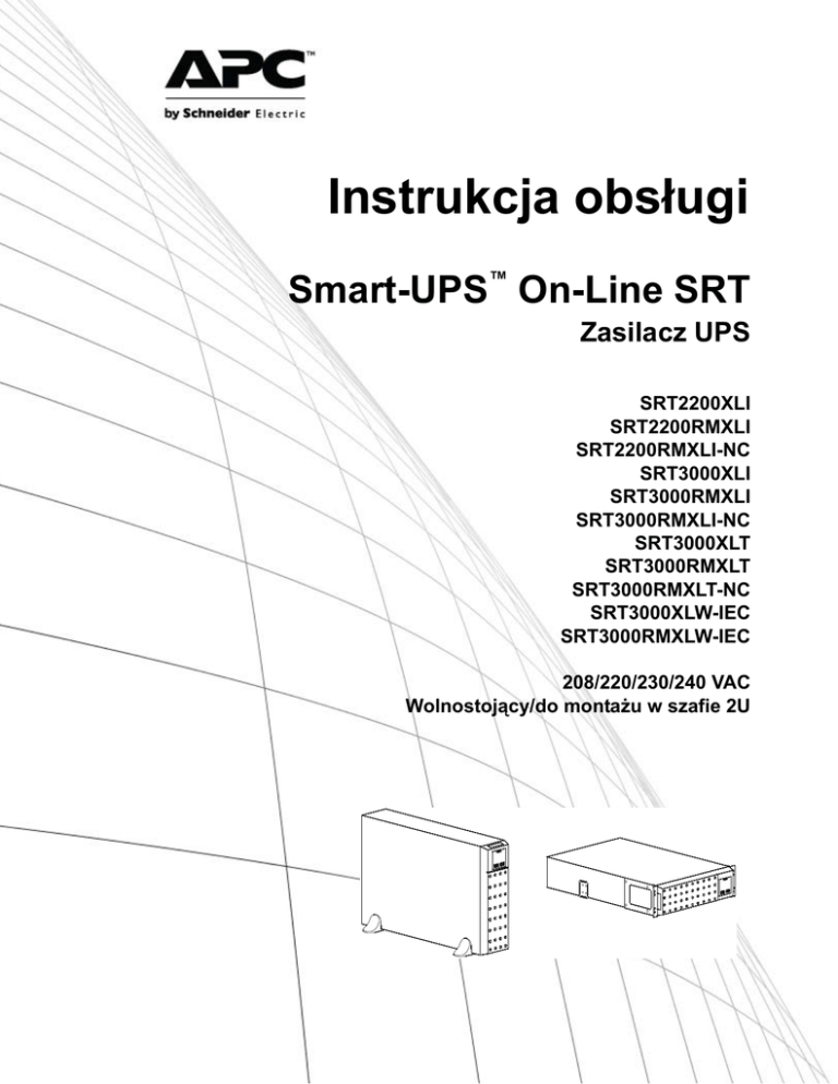 Instrukcja obsługi Smart-UPS™ On-Line SRT Zasilacz UPS SRT2200XLI SRT2200RMXLI SRT2200RMXLI-NC SRT3000XLI SRT3000RMXLI SRT3000RMXLI-NC SRT3000XLT SRT3000RMXLT SRT3000RMXLT-NC SRT3000XLW-IEC SRT3000RMXLW-IEC 208/220/230/240 VAC Wolnostojący/do montażu w szafie 2U Opis produktu Zasilacz Smart-UPS™ On-Line SRT firmy APC by Schneider Electric to zasilacz UPS (Uninterruptible Power Supply) o wysokiej wydajności. Zasilacz UPS zapewnia zabezpieczenie sprzętu elektronicznego przed spadkami, wzrostami i przerwami w dostawie napięcia zasilającego, zarówno nieznacznymi, jak i tymi o dużym nasileniu. Zasilacz UPS zapewnia także pracę podłączonego sprzętu na zasilaniu akumulatorowym, aż do przywrócenia akceptowalnego zasilania sieciowego lub do całkowitego rozładowania akumulatora. Instrukcja obsługi jest dostępna na dołączonym dysku CD z dokumentacją oraz w witrynie internetowej firmy APC by Schneider Electric pod adresem www.apc.com. Informacje ogólne Ważne komunikaty dotyczące bezpieczeństwa Przed rozpoczęciem instalacji, obsługi, czynności serwisowych lub konserwacyjnych zasilacza UPS należy przeczytać uważnie instrukcje w celu zapoznania się z urządzeniem. W niniejszym podręczniku lub na urządzeniu mogą występować poniższe specjalne komunikaty, ostrzegające przed potencjalnym niebezpieczeństwem lub zwracające uwagę na pewne informacje, które wyjaśniają lub upraszczają procedurę. Dodanie tego symbolu do etykiety bezpieczeństwa produktu Niebezpieczeństwo lub Ostrzeżenie wskazuje na występowanie zagrożenia związanego z elektrycznością, a nieprzestrzeganie instrukcji może spowodować obrażenia ciała. Dodanie tego symbolu do etykiety bezpieczeństwa produktu Ostrzeżenie lub Przestroga wskazuje na występowanie zagrożenia, które może prowadzić do obrażeń ciała lub uszkodzenia produktu w przypadku niestosowania się do zamieszczonych tu instrukcji. OSTRZEŻENIE OSTRZEŻENIE wskazuje na potencjalną sytuację zagrożenia, która w przypadku nieuniknięcia może spowodować śmierć lub poważne obrażenia ciała. PRZESTROGA PRZESTROGA wskazuje na potencjalną sytuację zagrożenia, która w przypadku nieuniknięcia może spowodować niewielkie lub średnie obrażenia ciała. UWAGA UWAGA służy do wskazywania praktyk niezwiązanych z obrażeniami fizycznymi. Symbol alertu bezpieczeństwa nie jest używany z tym słowem ostrzegawczym. Zasilacz Smart-UPS On-Line SRT2200/SRT3000 wolnostojący/o wymiarach 2U do montażu 1 Informacje ogólne i dotyczące bezpieczeństwa • Należy przestrzegać wszystkich krajowych i lokalnych przepisów dotyczących instalacji elektrycznych. • Całe okablowanie musi być wykonane przez wykwalifikowanego elektryka. • Zmiany oraz modyfikacje urządzenia nie zaakceptowane w sposób jednoznaczny przez APC mogą spowodować unieważnienie gwarancji. • Zasilacz jest przeznaczony do użytku wyłącznie w pomieszczeniach zamkniętych. • Nie wolno go narażać na bezpośrednie działanie światła słonecznego i jakichkolwiek cieczy ani używać w warunkach dużego zapylenia lub nadmiernej wilgotności. • Należy się upewnić, że otwory wentylacyjne zasilacza nie są zablokowane. Należy zapewnić odpowiednią wentylację. • W przypadku zasilaczy UPS z zainstalowanym fabrycznie kablem zasilającym, kabel ten należy podłączyć bezpośrednio do gniazda ściennego. Nie należy korzystać z filtrów przepięciowych ani przedłużaczy. • Typowa żywotność akumulatora wynosi od 2 do 5 lat. Mają na nią wpływ czynniki środowiskowe. Wysokie temperatury otoczenia, niska jakość zasilania sieciowego i częste, szybkie rozładowania skracają żywotność akumulatora. • Akumulator należy wymienić natychmiast, kiedy zasilacz UPS wskaże, że konieczna jest wymiana akumulatora. • Urządzenie jest ciężkie. Zawsze używaj bezpiecznych metod podnoszenia dostosowanych do ciężaru sprzętu. • Akumulatory są ciężkie. Przed montażem zasilacza UPS i zewnętrznego zestawu akumulatorów (XLBP) w szafie należy wyjąć akumulatory. • Zestawy XLBP należy zawsze instalować na dole konfiguracji montażu w szafie. Zasilacz UPS należy instalować nad zestawami XLBP. • W przypadku montażu w szafie urządzenia peryferyjne należy zawsze instalować nad zasilaczem UPS. • Dodatkowe informacje dotyczące bezpieczeństwa można znaleźć w instrukcji bezpieczeństwa dołączonej do urządzenia. Bezpieczne wyłączanie spod napięcia Zasilacz awaryjny zawiera wbudowane akumulatory stwarzające ryzyko porażenia prądem, nawet gdy urządzenie jest odłączone od sieci zasilającej. Przed rozpoczęciem wykonywania czynności instalacyjnych lub serwisowych urządzenia należy sprawdzić, czy: • Wyłącznik automatyczny obwodu wejściowego jest ustawiony w pozycji WYŁ. • Wyjęto wewnętrzne akumulatory zasilacza UPS. • Odłączono moduły akumulatorowe XLBP Bezpieczeństwo elektryczne • W przypadku modeli ze stałym połączeniem wejściowym podłączenia do obwodu zasilającego może dokonać wyłącznie wykwalifikowany elektryk. • Posiada odpowiednie uziemienie gniazda wejściowego w modelach z przewodem zasilającym przyłączanym wtyczką. • TYLKO modele na 230 V: W celu zachowania zgodności z dyrektywą EMC dla produktów sprzedawanych w Europie, przewody wyjściowe podłączone do zasilacza nie powinny przekraczać 10 metrów długości. 2 Zasilacz Smart-UPS On-Line SRT2200/SRT3000 wolnostojący/o wymiarach 2U do montażu Bezpieczne używanie akumulatora • Przed przystąpieniem do wymiany akumulatorów należy zdjąć biżuterię, tj. zegarek i pierścionki. W przypadku zwarcia styków materiałem przewodzącym generowany jest prąd o wysokim natężeniu, mogący wywołać poważne oparzenia. • Nie należy wrzucać akumulatorów do ognia. Akumulatory mogą eksplodować. • Nie należy otwierać lub uszkadzać akumulatorów. Znajdujący się wewnątrz elektrolit jest szkodliwy
