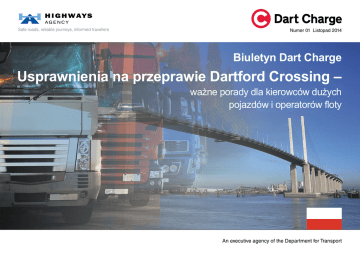 Safe roads, reliable journeys, informed travellers Numer 01 Listopad 2014 Biuletyn Dart Charge Usprawnienia na przeprawie Dartford Crossing – ważne porady dla kierowców dużych pojazdów i operatorów floty An executive agency of the Department for Transport W dniu 30 listopada 2014 roku nastąpią zmiany na przeprawie Dartford Crossing w Anglii, które będą miały wpływ na podróż. Wprowadzamy nowy sposób pobierania opłat za korzystanie z przeprawy. System Dart Charge pomoże zmniejszyć zatłoczenie i usprawnić płynność ruchu. M25 25 Enfield A10 27 6 Brentwood 28 4 A12 Basildon M25 A13 A12 A127 29 Dagenham A13 Dartford Crossing 30 Blackwall Tunnel LONDON Gravesend A2 A282 A20 3 Orpington Croydon te 8 M25 4 6 5 M25 Opłat będzie można dokonać na kilka sposobów. Najłatwiejszą i najtańszą opcją jest konto do przedpłat – pozwoli ono korzystać z rabatu za każdy przejazd. Operatorzy flot będą mogli ustanowić wspólne konto, aby wszystkie posiadane pojazdy były objęte rabatem. Przygotuj się na wprowadzenie Dart Charge i skonfiguruj konto do przedpłat już teraz przez Internet pod adresem www.gov.uk/dart-charge lub telefonicznie 0300 300 0120 (Wielka Brytania) lub +44 (0) 300 300 0120 (dla połączeń międzynarodowych). Tilbury A2 2 7 Począwszy od 30 listopada 2014, zamiast zatrzymywać się przy bramkach, można będzie zapłacić opłatę za przeprawę z góry lub do północy następnego dnia. Przeprawa Dartford Crossing (na 7 Chelmsford drodze A282) przecina Tamizę około 25 km na wschód od Londynu. Łączy autostradę M25 między 26 miejscowością Dartford wA12 hrabstwie M11 5 Kent a Thurrock w hrabstwie Essex. 06 A23 Zmiana sposobu pobierania opłat A21 1 Rochester 2 M2 M20 M26 2 2a 3 4 M20 Kiedy pojazd przejeżdża przez przeprawę, kamery i inne laserowe czytniki na podstawie tablic rejestracyjnych identyfikują dany pojazd, Jeżeli płatność nie zostanie dokonana do północy następnego dnia po przejeździe, kierowca lub firma zostanie obciążona opłatą karną. Bardzo poważnie traktujemy uchylanie się od płacenia i będziemy stosować skuteczne metody odzyskiwania długów, które były z powodzeniem wykorzystywane wcześniej na terenie Europy. Poprawa układu drogowego Pod koniec listopada 2014 roku rozpoczną się prace nad zmianą układu drogowego. Mają one charakter poważny i można spodziewać się, że będą miały wpływ na realizowane podróże. Roboty planowane są tak, aby zminimalizować utrudnienia i potrwają do wiosny 2015 roku. Na czas prowadzenia prac wprowadzone zostaną tymczasowe ograniczenia prędkości i układy drogowe, więc kierowcy powinni postępować zgodnie z instrukcjami pojawiającymi się na znakach. Układ drogowy będzie wymagał, aby kierowca znajdował się na właściwym pasie drogi dla danej wysokości i masy pojazdu, więc prosimy zwracać uwagę na nowe znaki i postępować zgodnie z instrukcjami. Jeśli kierowca znajdzie się na niewłaściwym pasie, zostanie zatrzymany i nie Sevenoaks © Crown copyright and database rights 2014 Ordnance Survey 100030649 Sposoby kontaktu Kiedy system Dart Charge zacznie działać, opłatę za pojedynczy przejazd będzie można uiścić internetowo, przez telefon, na poczcie lub w punktach Payzone. aby określić wysokość opłaty. Następnie system pobiera pieniądze z konta albo czeka na otrzymanie płatności. Przez Internet www.gov.uk/dart-charge Telefonicznie +44 (0)300 300 0120 Pisemnie Dart Charge Customer Service PO Box 842, Leeds LS1 9QF będzie mógł skorzystać z przeprawy, dopóki nie znajdzie się na właściwym pasie ruchu. Jeśli kierowca znajdzie się na niewłaściwym pasie, może zostać ukarany mandatem i otrzymać punkty karne. W najbliższym czasie podamy więcej informacji na temat tych zmian. Więcej informacji na temat systemu Dart Charge pod adresem www.gov.uk/highways/dartford Jaka wysokie będą opłaty? To zależy od klasy pojazdu i od faktu posiadania konta do przedpłat, które pozwoli otrzymać rabat za każdorazowy przejazd. Poniższa tabela przedstawia opłaty za korzystanie z przeprawy od dnia 30 listopada 2014 r. Kiedy zostania wprowadzony system Dart Charge? Dart Charge zostanie wprowadzony o godz. 6:00 w niedzielę 30 listopada 2014 r. Jak dokonać opłaty? Opłaty można dokonać online, przez telefon, w punktach z logo Payzone lub na poczcie. Opłaty w systemie Dart Charge można wnosić z góry lub do północy następnego dnia. od 30 listopada 2014 r. Klasa pojazdu Co się stanie w przypadku braku opłaty? A W przypadku braku wpłaty do północy następnego dnia otrzyma się karnę w wysokości 70 GBP. Mamy skuteczne metody egzekwowania mandatów, które obowiązują na terenie całej Europy. Nie. Dart Charge obejmuje jedynie korzystanie z przeprawy Dartford Crossing. Nadal należy wnosić inne opłaty, takie jak HGV Levy lub London Congestion Charge na dotychczasowych zasadach. Gotówka DART-Tag Bez konta Nie dotyczy Motocykle Konto Dart Charge Nie dotyczy 2,00 GBP 1,33 GBP 2,50 GBP 1,67 GBP C 2,50 GBP 2,19 GBP 3,00 GBP 2,63 GBP D 5,00 GBP 4,33 GBP 6,00 GBP 5,19 GBP B Czy Dart Charge pokrywa inne koszty i opłaty? Typ pojazdu* Samochody osobowe * Sposoby kontaktu Przez Internet www.gov.uk/dart-charge Telefonicznie +44 (0)300 300 0120 Pisemnie Dart Charge Customer Service PO Box 842, Leeds LS1 9QF Po co są te zmiany Przeprawa Dartford Crossing jest istotnym ogniwem transportu, z którego korzysta około 50 mln pojazdów rocznie. Zatrzymanie się w celu uiszczenia opłaty gotówką przy bramkach powoduje opóźnienia. Dzięki systemowi Dart Charge kierowcy będą płacić z góry lub do północy następnego dnia, co wyeliminuje konieczność zatrzymywania się i wnoszenia opłat przy bramkach. Pozwoli to zmniejszyć zatłoczenie i przyspieszyć podróż. Jak będziemy się komunikować Będziemy wydawać regularne biuletyny informacyjne na temat systemu Dart Charge oraz zmian w układzie drogowym przeprawy Dartford C