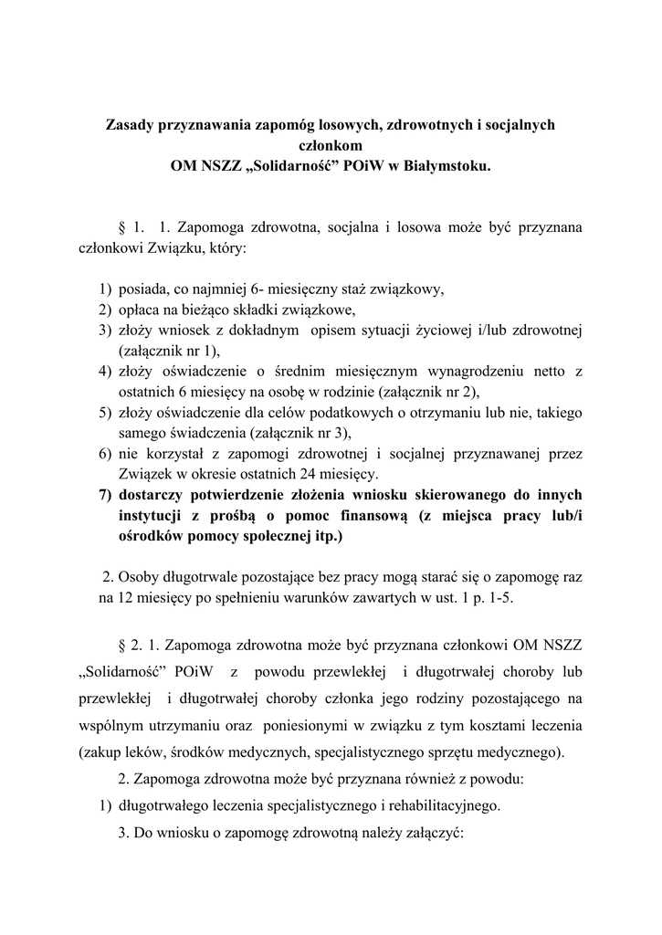 Zasady przyznawania zapomóg losowych, zdrowotnych i socjalnych członkom OM NSZZ „Solidarność” POiW w Białymstoku. § 1. 1. Zapomoga zdrowotna, socjalna i losowa może być przyznana członkowi Związku, który: 1) posiada, co najmniej 6- miesięczny staż związkowy, 2) opłaca na bieżąco składki związkowe, 3) złoży wniosek z dokładnym opisem sytuacji życiowej i/lub zdrowotnej (załącznik nr 1), 4) złoży oświadczenie o średnim miesięcznym wynagrodzeniu netto z ostatnich 6 miesięcy na osobę w rodzinie (załącznik nr 2), 5) złoży oświadczenie dla celów podatkowych o otrzymaniu lub nie, takiego samego świadczenia (załącznik nr 3), 6) nie korzystał z zapomogi zdrowotnej i socjalnej przyznawanej przez Związek w okresie ostatnich 24 miesięcy. 7) dostarczy potwierdzenie złożenia wniosku skierowanego do innych instytucji z prośbą o pomoc finansową (z miejsca pracy lub/i ośrodków pomocy społecznej itp.) 2. Osoby długotrwale pozostające bez pracy mogą starać się o zapomogę raz na 12 miesięcy po spełnieniu warunków zawartych w ust. 1 p. 1-5. § 2. 1. Zapomoga zdrowotna może być przyznana członkowi OM NSZZ „Solidarność” POiW przewlekłej z powodu przewlekłej i długotrwałej choroby lub i długotrwałej choroby członka jego rodziny pozostającego na wspólnym utrzymaniu oraz poniesionymi w związku z tym kosztami leczenia (zakup leków, środków medycznych, specjalistycznego sprzętu medycznego). 2. Zapomoga zdrowotna może być przyznana również z powodu: 1) długotrwałego leczenia specjalistycznego i rehabilitacyjnego. 3. Do wniosku o zapomogę zdrowotną należy załączyć: 1) zaświadczenie lekarskie o przewlekłej chorobie wystawione najpóźniej na 3 miesiące przed złożeniem wniosku, 2) imienne faktury lub rachunki za leki lub świadczenia medyczne. § 3. Zapomoga socjalna może być przyznana z powodu: 1) utraty pracy przez członka związku lub współmałżonka, 2) bardzo trudnej sytuacji życiowej i materialnej. § 4. Zapomoga losowa może być przyznana w związku z: 1) klęską żywiołową, kradzieżą, włamaniem, zniszczeniem domu lub mieszkania spowodowanym zalaniem wodą lub pożarem, nieszczęśliwym wypadkiem powodującym uszczerbek na zdrowiu, 2) do wniosku o zapomogę losową należy załączyć zaświadczenie o nagłym zdarzeniu z administracji, policji, straży pożarnej lub innych instytucji. § 5. Ustala się wysokość zapomóg. 1) zapomoga losowa do 1000 zł brutto, 2) zapomoga zdrowotna do 500 zł brutto, 3) zapomoga socjalna do 500 zł brutto. „ § 6. uchylony § 7. Z wnioskiem o zapomogę może wystąpić wyłącznie osoba zainteresowana. § 8. Wysokość przyznanego świadczenia pieniężnego uzależniona jest od: 1) przebiegu choroby oraz od okoliczności z tym związanych, wpływających na sytuację materialną osoby ubiegającej się o zapomogę (konieczność stosowania specjalnej diety i lekarstw, zapewnienia dodatkowej opieki choremu, itp.), 2) wysokości udokumentowanych, poniesionych kosztów leczenia (wydatki na lekarstwa, za pobyt w szpitalu, ośrodku rehabilitacyjnym, wydatki na zakup sprzętu rehabilitacyjnego, protez, środków opatrunkowych, koszty przejazdu do innej miejscowości ze względu na brak specjalistów w miejscu zamieszkania, itp.), 3) sytuacji materialnej rodziny (np. związanej z długotrwałym bezrobociem itp.) 4) wysokości środków finansowych zaplanowanych w budżecie Organizacj. WNIOSEK o przyznanie zapomogi zdrowotnej/socjalnej/losowej (niepotrzebne skreślić) ........................................................................................................... (wnioskodawca–imię i nazwisko) ............................................................................................................ (adres zamieszkania i nr telefonu) ……………………………………………………………………… ............................................................................................................. szkoła/placówka Uzasadnienie wniosku W załączeniu: ................................................ miejscowość i data ……………………………… podpis wnioskodawcy OŚWIADCZENIE Oświadczam, że średni dochód netto na osobę w rodzinie liczony z ostatnich 6 miesięcy wyniósł ……………………… zł. Liczba członków rodziny pozostających we wspólnym gospodarstwie domowym wynosi …………. osoby/osób. ………………………………………………… Podpis Na dochód składają się przychody wszystkich członków rodziny, bez względu na tytuł i źródło ich uzyskania. Do dochodu wlicza się wynagrodzenie z tytułu umowy o pracę, umowy zlecenia i o dzieło, wynagrodzenia za pracę dorywczą, świadczenia rodzinne i pielęgnacyjne, renty, emerytury, alimenty, zasiłki dla bezrobotnych, dochody z pozarolniczej działalności gospodarczej, dochody z gospodarstwa rolnego, świadczenia z pomocy społecznej (zasiłki stałe i okresowe), dochody z majątku rodziny ( czynsze najmu i dzierżawy). Za dochód netto uważa się sumę miesięcznych przychodów pomniejszoną o: miesięczne obciążenie podatkiem dochodowym od osób fizycznych; składki na ubezpieczenie zdrowotne określone w przepisach o powszechnym ubezpieczeniu w Narodowym Funduszu Zdrowia oraz ubezpieczenia społeczne określone w odrębnych przepisach; kwotę alimentów świadczonych na rzecz innych osób. Oświadczenie (wypełniają osoby, które nie otrzymały z innego źródła zapomogi losowej, socjalnej, zdrowotnej) Oświadczam, że na dzień ……………….. nie otrzymałam/em/ z innego źródła takiego samego świadczenia biorąc pod uwagę rok podatkowy.* …………………………………………………… Podpis W przypadku otrzymania zapomogi z innej instytucji należy wypełnić jedno z poniższych oświadczeń: Nr 1 – wypełniają osoby ubiegające się o zapomogę losową lub zdrowotną Nr 2 - wypełni