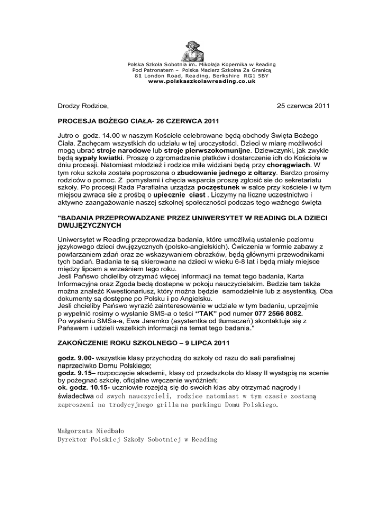 Polska Szkoła Sobotnia im. Mikołaja Kopernika w Reading Pod Patronatem – Polska Macierz Szkolna Za Granicą 81 London Road, Reading, Berkshire RG1 5BY www.polskaszkolawreading.co.uk Drodzy Rodzice, 25 czerwca 2011 PROCESJA BOŻEGO CIAŁA- 26 CZERWCA 2011 Jutro o godz. 14.00 w naszym Kościele celebrowane będą obchody Święta Bożego Ciała. Zachęcam wszystkich do udziału w tej uroczystości. Dzieci w miarę możliwości mogą ubrać stroje narodowe lub stroje pierwszokomunijne. Dziewczynki, jak zwykle będą sypały kwiatki. Proszę o zgromadzenie płatkόw i dostarczenie ich do Kościoła w dniu procesji. Natomiast młodzież i rodzice mile widziani będą przy chorągwiach. W tym roku szkoła została poproszona o zbudowanie jednego z ołtarzy. Bardzo prosimy rodziców o pomoc. Z pomysłami i chęcia wsparcia proszę zgłosić sie do sekretariatu szkoły. Po procesji Rada Parafialna urządza poczęstunek w salce przy kościele i w tym miejscu zwraca sie z prośbą o upiecznie ciast . Liczymy na liczne uczestnictwo i aktywne zaangażowanie naszej szkolnej społeczności podczas tego ważnego święta "BADANIA PRZEPROWADZANE PRZEZ UNIWERSYTET W READING DLA DZIECI DWUJĘZYCZNYCH Uniwersytet w Reading przeprowadza badania, które umożliwią ustalenie poziomu językowego dzieci dwujęzycznych (polsko-angielskich). Ćwiczenia w formie zabawy z powtarzaniem zdań oraz ze wskazywaniem obrazków, będą głównymi przewodnikami tych badań. Badania te są skierowane na dzieci w wieku 6-8 lat i będą miały miejsce między lipcem a wrześniem tego roku. Jesli Pańswo chcieliby otrzymać więcej informacji na temat tego badania, Karta Informacyjna oraz Zgoda bedą dostepne w pokoju nauczycielskim. Bedzie tam także można znaleźć Kwestionariusz, który można będzie samodzielnie lub z asystentką. Oba dokumenty są dostępne po Polsku i po Angielsku. Jesli chcieliby Pańswo wyrazić zainteresowanie w udziale w tym badaniu, uprzejmie p wypelnić rosimy o wysłanie SMS-a o teści “TAK” pod numer 077 2566 8082. Po wysłaniu SMSa-a, Ewa Jaremko (asystentka od tłumaczeń) skontaktuje się z Pańswem i udzieli wszelkich informacji na temat tego badania." ZAKOŃCZENIE ROKU SZKOLNEGO – 9 LIPCA 2011 godz. 9.00- wszystkie klasy przychodzą do szkoły od razu do sali parafialnej naprzeciwko Domu Polskiego; godz. 9.15– rozpoczęcie akademii, klasy od przedszkola do klasy II wystąpią na scenie by pożegnać szkołę, oficjalne wręczenie wyróżnień; ok. godz. 10.15- uczniowie rozejdą się do swoich klas aby otrzymać nagrody i świadectwa od swych nauczycieli, rodzice natomiast w tym czasie zostaną zaproszeni na tradycyjnego grilla na parkingu Domu Polskiego. Małgorzata Niedbało Dyrektor Polskiej Szkoły Sobotniej w Reading