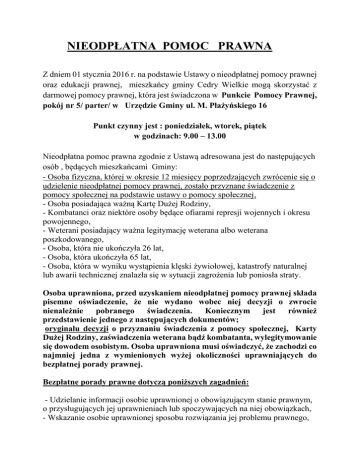 NIEODPŁATNA POMOC PRAWNA Z dniem 01 stycznia 2016 r. na podstawie Ustawy o nieodpłatnej pomocy prawnej oraz edukacji prawnej, mieszkańcy gminy Cedry Wielkie mogą skorzystać z darmowej pomocy prawnej, która jest świadczona w Punkcie Pomocy Prawnej, pokój nr 5/ parter/ w Urzędzie Gminy ul. M. Płażyńskiego 16 Punkt czynny jest : poniedziałek, wtorek, piątek w godzinach: 9.00 – 13.00 Nieodpłatna pomoc prawna zgodnie z Ustawą adresowana jest do następujących osób , będących mieszkańcami Gminy: - Osoba fizyczna, której w okresie 12 miesięcy poprzedzających zwrócenie się o udzielenie nieodpłatnej pomocy prawnej, zostało przyznane świadczenie z pomocy społecznej na podstawie ustawy o pomocy społecznej, - Osoba posiadająca ważną Kartę Dużej Rodziny, - Kombatanci oraz niektóre osoby będące ofiarami represji wojennych i okresu powojennego, - Weterani posiadający ważna legitymację weterana albo weterana poszkodowanego, - Osoba, która nie ukończyła 26 lat, - Osoba, która ukończyła 65 lat, - Osoba, która w wyniku wystąpienia klęski żywiołowej, katastrofy naturalnej lub awarii technicznej znalazła się w sytuacji zagrożenia lub poniosła straty. Osoba uprawniona, przed uzyskaniem nieodpłatnej pomocy prawnej składa pisemne oświadczenie, że nie wydano wobec niej decyzji o zwrocie nienależnie pobranego świadczenia. Koniecznym jest również przedstawienie jednego z następujących dokumentów; oryginału decyzji o przyznaniu świadczenia z pomocy społecznej, Karty Dużej Rodziny, zaświadczenia weterana bądź kombatanta, wylegitymowanie się dowodem osobistym. Osoba uprawniona musi oświadczyć, że zachodzi co najmniej jedna z wymienionych wyżej okoliczności uprawniających do bezpłatnej porady prawnej. Bezpłatne porady prawne dotyczą poniższych zagadnień: - Udzielanie informacji osobie uprawnionej o obowiązującym stanie prawnym, o przysługujących jej uprawnieniach lub spoczywających na niej obowiązkach, - Wskazanie osobie uprawnionej sposobu rozwiązania jej problemu prawnego, - Udzielenie pomocy w sporządzeniu pisma w sprawach wymienionych powyżej (nie dotyczy to pism procesowych w toczącym się postępowaniu przygotowawczym i sądowym lub pism w toczącym się postępowaniu sądowoadministracyjnym) - Sporządzenie projektu pism o zwolnienie od kosztów sądowych lub ustanowienie pełnomocnika z urzędu w postępowaniu sądowym lub ustanowienie adwokata, radcy prawnego, doradcy podatkowego lub rzecznika patentowego w postępowaniu sądowo-administracyjnym. Nieodpłatna pomoc prawna nie obejmuje spraw: - podatkowych związanych z prowadzeniem działalności gospodarczej - z zakresu prawa celnego, dewizowego i handlowego - związanych z prowadzeniem działalności gospodarczej, z wyjątkiem przygotowania do rozpoczęcia tej działalności.