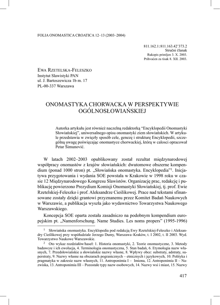 FOLIA ONOMASTICA CROATICA 12–13 (2003–2004) 811.162.1:811.163.42’373.2 Stručni članak Rukopis primljen 3. X. 2003. Prihvaćen za tisak 8. XII. 2003. EWA RZETELSKA-FELESZKO Instytut Slawistyki PAN ul. J. Bartoszewicza 1b m. 17 PL-00-337 Warszawa ONOMASTYKA CHORWACKA W PERSPEKTYWIE OGÓLNOSŁOWIAŃSKIEJ Autorka artykułu jest również naczelną redaktorką “Encyklopedii Onomastyki Słowiańskiej”, uniwersalnego opisu onomastyki ziem słowiańskich. W artykule przedstawia w zwięzły sposób cele, genezę i strukturę Encyklopedii, szczególną uwagę poświęcając onomastyce chorwackiej, którą w calosci opracował Petar Šimunović. W latach 2002–2003 opublikowany został rezultat międzynarodowej współpracy onomastów z krajów słowiańskich: dwutomowe obszerne kompendium (ponad 1000 stron) pt. „Słowiańska onomastyka. Encyklopedia”1. Inicjatywa przygotowania i wydania SOE powstała w Krakowie w 1998 roku w czasie 12 Międzynarodowego Kongresu Slawistów. Organizację prac, redakcję i publikację powierzono Prezydium Komisji Onomastyki Słowiańskiej, tj. prof. Ewie Rzetelskiej-Feleszko i prof. Aleksandrze Cieślikowej. Prace nad tekstami sfinansowane zostały dzięki grantowi przyznanemu przez Komitet Badań Naukowych w Warszawie, a publikacja wyszła jako wydawnictwo Towarzystwa Naukowego Warszawskiego. Koncepcja SOE oparta została zasadniczo na podobnym kompendium europejskim pt. „Namenforschung. Name Studies. Les noms propers” (1995-1996) 1 Słowiańska onomastyka. Encyklopedia pod redakcją Ewy Rzetelskiej-Feleszko i Aleksandry Cieślikowej przy współudziale Jerzego Dumy, Warszawa–Kraków, t. I 2002, t. II 2003. Wyd. Towarzystwo Naukowe Warszawskie. 2 Oto wykaz rozdziałów/haseł: 1. Historia onomastyki, 2. Teorie onomastyczne, 3. Metody badawcze i ich ewolucja, 4. Terminologia onomastyczna, 5. Stan badań, 6. Etymologia nazw własnych, 7. Przedsłowiańskie a słowiańskie nazwy własne, 8. Wpływy obce: substraty, adstraty, superstraty, 9. Nazwy własne na obszarach pogranicznych – etnicznych i językowych, 10. Polityka i pragmatyka w zakresie nazw własnych, 11. Antroponimia I – Imiona, 12. Antroponimia II – Nazwiska, 13. Antroponimia III – Pozostałe typy nazw osobowych, 14. Nazwy wsi i miast, 15. Nazwy 417 Ewa Rzetelska-Feleszko: Onomastyka chorwacka w perspektywie ogólnosłowiańskiej FOC 12–13 (2003–2004), 417–424 oraz na wydanej w 1998 r. syntezie polskiej onomastyki pt. Polskie nazwy własne. Encyklopedia pod redakcją E. Rzetelskiej-Feleszko. Encyklopedyczny charakter SOE polega na ogarnięciu całości problematyki onomastycznej. Przedstawiona została ona w 24 rozdziałach/hasłach głównych oraz w podrozdziałach/ podhasłach (1-8 zależnie od potrzeby)2. Tego typu „encyklopedie” mają już jednak pewną tradycję, chociaż nie jest to typowy, alfabetyczny porządek haseł. Do współpracy przy przygotowaniu tekstów pozyskano wybitnych onomastów z każdego kraju: z Chorwacji jest to Petar Šimunović, z Serbii – Zvezdana Pavlović i Milica Grković, ze Słowenii – Alenka Šivic-Dular (ze współpracownikami), z Macedonii Marija Korobar-Belčeva, z Bułgarii – Liljana Dimitrova-Todorova, z Polski – Aleksandra Cieślikowa, Maria Malec, Kazimierz Rymut, Ewa Rzetelska-Feleszko i inni, z Czech – Rudolf Šrámek, Miloslava Knappová, Libuše Olivová-Nezbedová, ze Słowacji – Vincent Blanár i Milan Majtán, z Łużyc (Niemcy) – Ernst Eichler, Inge Billy, Walter Wenzel i inni, z terenów połabskich (Niemcy) – Elżbieta Foster, z Rosji – Aleksandra Superanska, z Białorusi – Valjancina P. Lemcjugova, z Ukrainy – Jurij Karpenko, Pavlo Čučka i Vasyl V. Lučik. Większość wymienionych autorów to doświadczeni, wieloletni badacze nazw własnych, o szerokich choryzontach i sprecyzowanych koncepcjach teoretyczno-metodologicznych. W powstającym kompendium cenne okazało się zwłaszcza szerokie spojrzenie na różnorodność nazw własnych uwzględniające i ich interpretację etymologiczną i socjolingwistyczną, pokazanie ścisłych związków z historią i kulturą narodów, analiza najstarszych warstw nazewniczych, ale i nazw nowych, powstających współcześnie. W czasie wspólnych konferencji ustalono, że celem SOE będzie danie świadectwa o stanie obecnej wiedzy onomastycznej w każdym z krajów. Dotyczy to wszystkich kategorii nazw (antroponimii, toponimii, hydronimii, etc.). Przyjęto także, że autorzy uwzględnią w swych opracowaniach nie tylko nazwy własne o etymologii słowiańskiej, ale także nazwy różnego pochodzenia znane i używane na obszarze dzisiejszych krajów słowiańskich. Poszerzyło to znacznie problematykę SOE o nazwy pochodzące z niesłowiańskich substratów i różnego typy kontaktów słowiańsko-niesłowiańskich. Celem SOE stał się zatem: 1. Opis genetyczno-porównawczy słowiańskich nazw własnych polegający na wychwyceniu jednolitości lub różnic w słowiańskim nazewnictwie całego obszaru. Np. w zakresie antroponimii jest to charakterystyka imion dwuczłonowych, hipokorystyków, typologia nazwisk, rodzaje podstaw apelatywnych w nazwach osobowych, etc. W zakresie toponimii – związki z najstarszym osadnicterenowe (mikrotoponimia, anojkonimia), 16. Nazwy górskie (choronimia), 17. Nazwy wodne (hydronimia), 18. Nazwy miejskie (urbo-/urbanonimia), 19. Nazwy zwierząt (zoonimia), 20. Chrematonimia, 21. Nazwy własne a problematyka społeczna, 22. Nazwy własne w literaturze pięknej, 23. Nazwy własne a problematyka religijna, 24. Zmiany w nazewnictwie XX wieku. 418 Ewa Rzetelska-Feleszko: Onomastyka chorwacka w perspektywie ogólnosłowiańskiej FOC 12–13 (2003–2004), 417–424 twem Słowian, apelatywne podstawy nazw geograficznych, zróżnicowanie słowotwórcze nazw (lub brak zróżnicowania), etc. 2. Opis synchroniczno-porównawczy polegający na pokazaniu procesów powstawania nowych nazw, zwłaszcza chrematonimów; zachodzących równole