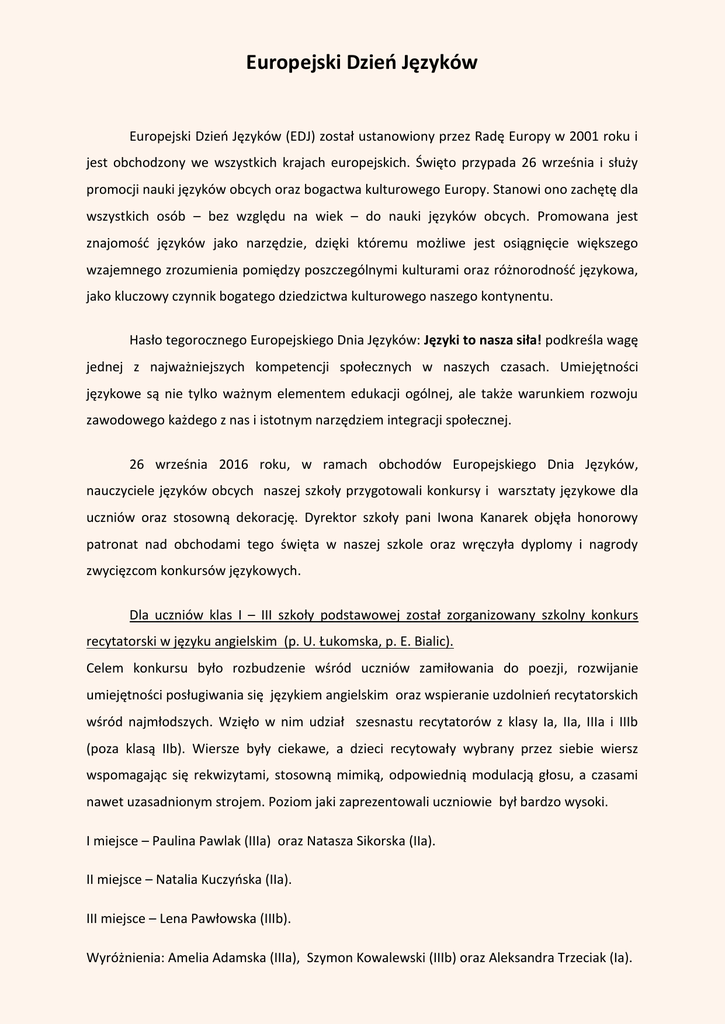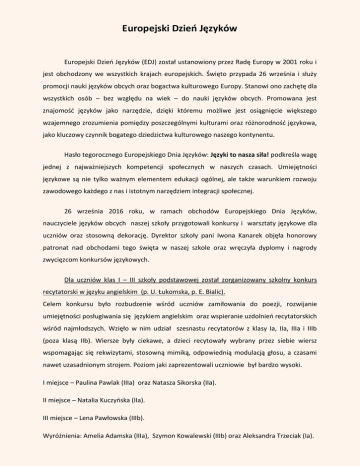 Europejski Dzień Języków Europejski Dzień Języków (EDJ) został ustanowiony przez Radę Europy w 2001 roku i jest obchodzony we wszystkich krajach europejskich. Święto przypada 26 września i służy promocji nauki języków obcych oraz bogactwa kulturowego Europy. Stanowi ono zachętę dla wszystkich osób – bez względu na wiek – do nauki języków obcych. Promowana jest znajomość języków jako narzędzie, dzięki któremu możliwe jest osiągnięcie większego wzajemnego zrozumienia pomiędzy poszczególnymi kulturami oraz różnorodność językowa, jako kluczowy czynnik bogatego dziedzictwa kulturowego naszego kontynentu. Hasło tegorocznego Europejskiego Dnia Języków: Języki to nasza siła! podkreśla wagę jednej z najważniejszych kompetencji społecznych w naszych czasach. Umiejętności językowe są nie tylko ważnym elementem edukacji ogólnej, ale także warunkiem rozwoju zawodowego każdego z nas i istotnym narzędziem integracji społecznej. 26 września 2016 roku, w ramach obchodów Europejskiego Dnia Języków, nauczyciele języków obcych naszej szkoły przygotowali konkursy i warsztaty językowe dla uczniów oraz stosowną dekorację. Dyrektor szkoły pani Iwona Kanarek objęła honorowy patronat nad obchodami tego święta w naszej szkole oraz wręczyła dyplomy i nagrody zwycięzcom konkursów językowych. Dla uczniów klas I – III szkoły podstawowej został zorganizowany szkolny konkurs recytatorski w języku angielskim (p. U. Łukomska, p. E. Bialic). Celem konkursu było rozbudzenie wśród uczniów zamiłowania do poezji, rozwijanie umiejętności posługiwania się językiem angielskim oraz wspieranie uzdolnień recytatorskich wśród najmłodszych. Wzięło w nim udział szesnastu recytatorów z klasy Ia, IIa, IIIa i IIIb (poza klasą IIb). Wiersze były ciekawe, a dzieci recytowały wybrany przez siebie wiersz wspomagając się rekwizytami, stosowną mimiką, odpowiednią modulacją głosu, a czasami nawet uzasadnionym strojem. Poziom jaki zaprezentowali uczniowie był bardzo wysoki. I miejsce – Paulina Pawlak (IIIa) oraz Natasza Sikorska (IIa). II miejsce – Natalia Kuczyńska (IIa). III miejsce – Lena Pawłowska (IIIb). Wyróżnienia: Amelia Adamska (IIIa), Szymon Kowalewski (IIIb) oraz Aleksandra Trzeciak (Ia). Dla uczniów klas IV – VI zostały zorganizowane warsztaty językowe z aplikacją Duolingo – popularna na świecie metoda nauki języków obcych, w formie zabawy, online ... (p. E. Bialic, p. U. Łukomska). Duolingo to platforma służąca uczniom do samodzielnej nauki języków obcych. Jest niezwykle popularna, ma już około 100 milionów użytkowników na całym świecie. Do tej grupy dołączyli nasi uczniowie. Po ściągnięciu darmowego programu na swoje telefony czy tablety i założeniu konta użytkownika rozpoczęli przygodę z Duolingo. Nowa forma nauki języka angielskiego z wykorzystaniem nowoczesnej technologii bardzo przypadła im do gustu. Mamy nadzieję, że Duolingo stanie się ich ulubioną aplikacją, a efekty będą szybko widoczne na lekcjach języka angielskiego. Dla uczniów klas II i III gimnazjum został zorganizowany szkolny turniej Scrabble – wersja niemieckojęzyczna (p. P. Wawrowski). Wzięło w nim udział 14 uczniów. Uczestnicy rozegrali po 2 pojedynki (po 45 minut każdy), a na ostateczny wynik składała się suma punktów z obu potyczek. Uczniowie klas drugich otrzymali na początku punktowy handicap (wyrównanie szans w starciu z uczniami klas trzecich). Nad prawidłowym przebiegiem czuwało 4 sędziów (wybrani uczniowie) oraz nauczyciel języka niemieckiego. Podczas zawodów panowała świetna atmosfera, a uczniowie osiągnęli wysokie wyniki. Na podium znaleźli się: Martyna Waligórska z kl. IIIa (265 pkt.), Gabriela Szylar z kl. IIa (252 pkt.) i Adam Kwiatkowski z kl. IIa (200 pkt.). Nagrodę specjalną za najlepiej punktowane słowo (odpowiednio wyłożone ‘YETI’ za 39 pkt.) zdobył uczeń kl. IIIa, Krzysztof Strzelecki. Rozgrywki pokazały, że… Deutsch macht Spaβ! Dla uczniów klas I – III gimnazjum został zorganizowany szkolny konkurs kulturoznawczy o Wielkiej Brytanii (p. A. Antosiewicz). U. Łukomska