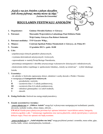 „Każdy z nas jest Aniołem z jednym skrzydłem. Jeśli chcemy pofrunąć, musimy mocno się objąć.” /Luciano De Crescendo/ REGULAMIN FESTIWALU ANIOŁÓW 1. Organizator: Gminny Ośrodek Kultury w Górzycy 2. Patronat: Marszałek Województwa Lubuskiego Pani Elżbieta Polak Wójt Gminy Górzyca Pan Robert Stolarski 3. Patronat medialny: TVP Gorzów Wlkp., 4. Miejsce: Centrum Spotkań Polsko-Niemieckich w Górzycy, ul. Polna 8/1 5. Termin: 12 grudnia 2013 r. godz. 10.00 6. Cele: - popularyzacja różnych gatunków plastycznych, - wymiana doświadczeń artystycznych i twórczych, - wprowadzanie w nastrój Świąt Bożego Narodzenia, - prezentacja umiejętności i dorobku artystycznego wykonawców dziecięcych i młodzieżowych, - dostrzeżenie dobra wspólnego w społeczności lokalnej „Anioły są wśród nas” – wybór lokalnego Anioła. 7. Uczestnicy: - do udziału w festiwalu zapraszamy dzieci, młodzież i osoby dorosłe z Polski i Niemiec w następujących kategoriach wiekowych: I – przedszkola i zerówki, II – uczniowie klas 1-3 szkoły podstawowej, III – uczniowie klas 4-6 szkoły podstawowej, IV – młodzież gimnazjalna i ze szkół średnich, V – dorośli. 8. Zasięg festiwalu: festiwal ma zasięg międzynarodowy. 9. Zasady uczestnictwa i terminy: - prace plastyczne pt. ,,Oblicze Anioła” mogą być wykonywane następującymi technikami: pastele, akwarela, techniki wodne, obraz olejny, ołówek… UWAGA! Każda praca plastyczna powinna być opisana imieniem i nazwiskiem autora, kategorią wiekową zgodnie z pkt. 7 niniejszego regulaminu oraz nazwą placówki, szkoły (przód pracy w prawym dolnym rogu). Prace nie opisane nie będą oceniane. - prace techniczne pt. ,,Anioł niejedno ma imię” mogą przybierać postaci: ceramika, masa solna, gips, rzeźba, batik, witraż, metaloplastyka, kordonek… UWAGA! Każda praca techniczna powinna być opisana imieniem i nazwiskiem autora, kategorią wiekową zgodnie z pkt. 7 niniejszego regulaminu oraz nazwą placówki, szkoły (kartka, kartonik itp., dobrze przymocowane do pracy). Prace nie opisane nie będą oceniane. Prace plastyczne i techniczne należy przesłać lub dostarczyć osobiście do Gminnego Ośrodka Kultury w Górzycy w terminie do dn. 3 grudnia 2013r. Oceny prac technicznych i plastycznych dokona Komisja powołana przez Dyrektora GOK w dn. 5 grudnia 2013r. Protokół z posiedzenia komisji konkursowych wraz z imienną listą zwycięzców zostanie zamieszczony na stronie internetowej Gminnego Ośrodka Kultury www.sport.kultura.gorzyca.pl w dn. 6 grudnia 2013r. - scenka rodzajowa o tematyce anielskiej – czas trwania 10 min., liczba występujących max 6 osób, - wymagane pisemne zgłoszenie wg załączonego wzoru; Karty zgłoszeń należy przesyłać na adres organizatora w terminie do dn. 3 grudnia 2013r. - piosenka o tematyce anielskiej – czas trwania max. 3 min., uczestnicy będą rywalizować w dwóch grupach: soliści i zespoły. (UWAGA! Uczestnicy przesyłają płytę CD z muzyką w formacie mp3 opisaną tytułem wykonywanej piosenki wraz z kartą zgłoszenia do dnia 03.12.2013r.) - wymagane pisemne zgłoszenie wg załączonego wzoru; - własna aranżacja (kompozycja), tekst oraz żywe instrumenty będą dodatkowo punktowane. 10. Nagrody: ocenie podlegać będą walory artystyczne, kreatywność i pomysł, estetyka wykonania. - podział nagród leży w gestii odpowiedniej komisji, - werdykt komisji jest ostateczny, - laureaci otrzymają nagrody rzeczowe oraz pamiątkowe dyplomy, które odbierają osobiście w dniu festiwalu, nie przewiduje się przesyłania nagród, - nagrodzone prace przechodzą na własność organizatora i zostaną wystawione w Centrum Spotkań Polsko-Niemieckich. 11. Sprawy organizacyjne: - zgłoszenie prac jest jednoznaczne z akceptacją niniejszego regulaminu, - w sprawach nie uregulowanych regulaminem decyduje organizator, - organizator przewiduje możliwość wzięcia udziału w ,,warsztatach anielskich” w dniu imprezy, - organizator zaprasza do ,,Cafe Aniołek”, - w trakcie festiwalu wystawa nagrodzonych prac, wizyta tajemniczego gościa, malowanie twarzy, anielska zumba, ogłoszenie wyników konkursu na lokalnego anioła. 12. Miejsce składania prac: Gminny Ośrodek Kultury ul. Polna 8/1 69-113 Górzyca. Z anielskim pozdrowieniem ORGANIZATOR www. lubuskie.pl