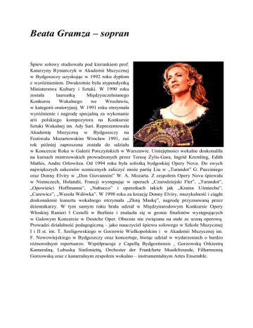 Beata Gramza – sopran Śpiew solowy studiowała pod kierunkiem prof. Katarzyny Rymarczyk w Akademii Muzycznej w Bydgoszczy uzyskując w 1992 roku dyplom z wyróżnieniem. Dwukrotnie była stypendystką Ministerstwa Kultury i Sztuki. W 1990 roku została laureatką Międzyuczelnianego Konkursu Wokalnego we Wrocławiu, w kategorii oratoryjnej. W 1991 roku otrzymała wyróżnienie i nagrodę specjalną za wykonanie arii polskiego kompozytora na Konkursie Sztuki Wokalnej im. Ady Sari. Reprezentowała Akademię Muzyczną w Bydgoszczy na Festiwalu Mozartowskim Wrocław 1991, zaś rok później zaproszona została do udziału w Koncercie Roku w Galerii Porczyńskich w Warszawie. Umiejętności wokalne doskonaliła na kursach mistrzowskich prowadzonych przez Teresę Żylis-Gara, Ingrid Kremling, Edith Mathis, Andre Orlowitza. Od 1994 roku była solistką bydgoskiej Opery Nova. Do swych największych sukcesów scenicznych zaliczyć może partię Liu w „Turandot” G. Pucciniego oraz Donny Elviry w „Don Giovannim” W. A. Mozarta. Z zespołem Opery Nova śpiewała w Niemczech, Holandii, Francji występując w operach „Czarodziejski Flet”, „Turandot”, „Opowieści Hoffmanna”, „Nabucco” i operetkach takich jak „Kraina Uśmiechu”, „Carewicz”, „Wesoła Wdówka”. W 1998 roku za kreację Donny Elviry, muzykalność i ciągłe doskonalenie kunsztu wokalnego otrzymała „Złotą Maskę”, nagrodę przyznawaną przez dziennikarzy. W tym samym roku brała udział w Międzynarodowym Konkursie Opery Włoskiej Ranieri I Cestelli w Berlinie i znalazła się w gronie finalistów występujących w Galowym Koncercie w Deutche Oper. Obecnie nie związana na stałe ze sceną operową. Prowadzi działalność pedagogiczną – jako nauczyciel śpiewu solowego w Szkole Muzycznej I i II st. im. T. Szeligowskiego w Gorzowie Wielkopolskim i w Akademii Muzycznej im. F. Nowowiejskiego w Bydgoszczy oraz koncertuje, biorąc udział w wydarzeniach o bardzo różnorodnym repertuarze. Współpracuje z Capellą Bydgostiensis , Gorzowską Orkiestrą Kameralną, Lubuską Sinfoniettą, Orchester der Frankfurte Musikfreunde, Filharmonią Gorzowską oraz z kameralnym zespołem wokalno – instrumentalnym Artes Ensemble.