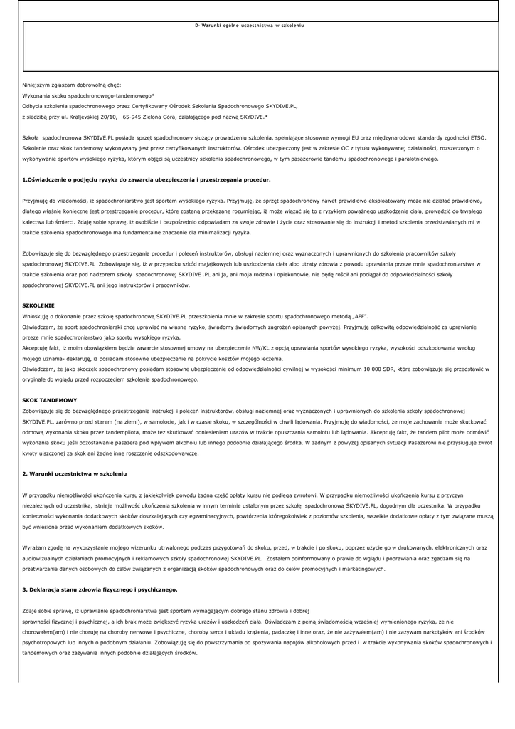 D- Warunki ogólne uczestnict w a w szkoleniu Niniejszym zgłaszam dobrowolną chęć: Wykonania skoku spadochronowego-tandemowego* Odbycia szkolenia spadochronowego przez Certyfikowany Ośrodek Szkolenia Spadochronowego SKYDIVE.PL, z siedzibą przy ul. Kraljevskiej 20/10, 65-945 Zielona Góra, działającego pod nazwą SKYDIVE.* Szkoła spadochronowa SKYDIVE.PL posiada sprzęt spadochronowy służący prowadzeniu szkolenia, spełniające stosowne wymogi EU oraz międzynarodowe standardy zgodności ETSO. Szkolenie oraz skok tandemowy wykonywany jest przez certyfikowanych instruktorów. Ośrodek ubezpieczony jest w zakresie OC z tytułu wykonywanej działalności, rozszerzonym o wykonywanie sportów wysokiego ryzyka, którym objęci są uczestnicy szkolenia spadochronowego, w tym pasażerowie tandemu spadochronowego i paralotniowego. 1.Oświadczenie o podjęciu ryzyka do zawarcia ubezpieczenia i przestrzegania procedur. Przyjmuję do wiadomości, iż spadochroniarstwo jest sportem wysokiego ryzyka. Przyjmuję, że sprzęt spadochronowy nawet prawidłowo eksploatowany może nie działać prawidłowo, dlatego właśnie konieczne jest przestrzeganie procedur, które zostaną przekazane rozumiejąc, iż może wiązać się to z ryzykiem poważnego uszkodzenia ciała, prowadzić do trwałego kalectwa lub śmierci. Zdaję sobie sprawę, iż osobiście i bezpośrednio odpowiadam za swoje zdrowie i życie oraz stosowanie się do instrukcji i metod szkolenia przedstawianych mi w trakcie szkolenia spadochronowego ma fundamentalne znaczenie dla minimalizacji ryzyka. Zobowiązuje się do bezwzględnego przestrzegania procedur i poleceń instruktorów, obsługi naziemnej oraz wyznaczonych i uprawnionych do szkolenia pracowników szkoły spadochronowej SKYDIVE.PL Zobowiązuje się, iż w przypadku szkód majątkowych lub uszkodzenia ciała albo utraty zdrowia z powodu uprawiania przeze mnie spadochroniarstwa w trakcie szkolenia oraz pod nadzorem szkoły spadochronowej SKYDIVE .PL ani ja, ani moja rodzina i opiekunowie, nie będę rościł ani pociągał do odpowiedzialności szkoły spadochronowej SKYDIVE.PL ani jego instruktorów i pracowników. SZKOLENIE Wnioskuję o dokonanie przez szkołę spadochronową SKYDIVE.PL przeszkolenia mnie w zakresie sportu spadochronowego metodą „AFF”. Oświadczam, że sport spadochroniarski chcę uprawiać na własne ryzyko, świadomy świadomych zagrożeń opisanych powyżej. Przyjmuję całkowitą odpowiedzialność za uprawianie przeze mnie spadochroniarstwo jako sportu wysokiego ryzyka. Akceptuję fakt, iż moim obowiązkiem będzie zawarcie stosownej umowy na ubezpieczenie NW/KL z opcją uprawiania sportów wysokiego ryzyka, wysokości odszkodowania według mojego uznania- deklaruję, iż posiadam stosowne ubezpieczenie na pokrycie kosztów mojego leczenia. Oświadczam, że jako skoczek spadochronowy posiadam stosowne ubezpieczenie od odpowiedzialności cywilnej w wysokości minimum 10 000 SDR, które zobowiązuje się przedstawić w oryginale do wglądu przed rozpoczęciem szkolenia spadochronowego. SKOK TANDEMOWY Zobowiązuje się do bezwzględnego przestrzegania instrukcji i poleceń instruktorów, obsługi naziemnej oraz wyznaczonych i uprawnionych do szkolenia szkoły spadochronowej SKYDIVE.PL, zarówno przed starem (na ziemi), w samolocie, jak i w czasie skoku, w szczególności w chwili lądowania. Przyjmuję do wiadomości, że moje zachowanie może skutkować odmową wykonania skoku przez tandempliota, może też skutkować odniesieniem urazów w trakcie opuszczania samolotu lub lądowania. Akceptuję fakt, że tandem pilot może odmówić wykonania skoku jeśli pozostawanie pasażera pod wpływem alkoholu lub innego podobnie działającego środka. W żadnym z powyżej opisanych sytuacji Pasażerowi nie przysługuje zwrot kwoty uiszczonej za skok ani żadne inne roszczenie odszkodowawcze. 2. Warunki uczestnictwa w szkoleniu W przypadku niemożliwości ukończenia kursu z jakiekolwiek powodu żadna część opłaty kursu nie podlega zwrotowi. W przypadku niemożliwości ukończenia kursu z przyczyn niezależnych od uczestnika, istnieje możliwość ukończenia szkolenia w innym terminie ustalonym przez szkołę spadochronową SKYDIVE.PL, dogodnym dla uczestnika. W przypadku konieczności wykonania dodatkowych skoków doszkalających czy egzaminacyjnych, powtórzenia któregokolwiek z poziomów szkolenia, wszelkie dodatkowe opłaty z tym związane muszą być wniesione przed wykonaniem dodatkowych skoków. Wyrażam zgodę na wykorzystanie mojego wizerunku utrwalonego podczas przygotowań do skoku, przed, w trakcie i po skoku, poprzez użycie go w drukowanych, elektronicznych oraz audiowizualnych działaniach promocyjnych i reklamowych szkoły spadochronowej SKYDIVE.PL. Zostałem poinformowany o prawie do wglądu i poprawiania oraz zgadzam się na przetwarzanie danych osobowych do celów związanych z organizacją skoków spadochronowych oraz do celów promocyjnych i marketingowych. 3. Deklaracja stanu zdrowia fizycznego i psychicznego. Zdaje sobie sprawę, iż uprawianie spadochroniarstwa jest sportem wymagającym dobrego stanu zdrowia i dobrej sprawności fizycznej i psychicznej, a ich brak może zwiększyć ryzyka urazów i uszkodzeń ciała. Oświadczam z pełną świadomością wcześniej wymienionego ryzyka, że nie chorowałem(am) i nie choruję na choroby nerwowe i psychiczne, choroby serca i układu krążenia, padaczkę i inne oraz, że nie zażywałem(am) i nie zażywam narkotyków ani środków psychotropowych lub innych o podobnym działaniu. Zobowiązuję się do powstrzymania od spożywania napojów alkoholowych przed i w trakcie wykonywania skoków spadochronowych i tandemowych oraz zażywania innych podobnie działających środków.