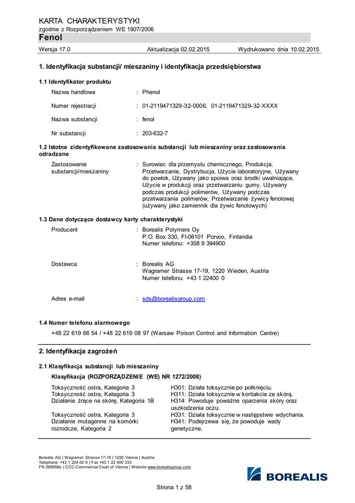 KARTA CHARAKTERYSTYKI zgodnie z Rozporządzeniem WE 1907/2006 Fenol Wersja 17.0 Aktualizacja 02.02.2015 Wydrukowano dnia 10.02.2015 1. Identyfikacja substancji/ mieszaniny i identyfikacja przedsiębiorstwa 1.1 Identyfikator produktu Nazwa handlowa : Phenol Numer rejestracji : 01-2119471329-32-0006, 01-2119471329-32-XXXX Nazwa substancji : fenol Nr substancji : 203-632-7 1.2 Istotne zidentyfikowane zastosowania substancji lub mieszaniny oraz zastosowania odradzane Zastosowanie substancji/mieszaniny : Surowiec dla przemysłu chemicznego, Produkcja, Przetwarzanie, Dystrybucja, Użycie laboratoryjne, Używany do powłok, Używany jako spoiwa oraz środki uwalniające, Użycie w produkcji oraz przetwarzaniu gumy, Używany podczas produkcji polimerów, Używany podczas przetwarzania polimerów, Przetwarzanie żywicy fenolowej (używany jako zamiennik dla żywic fenolowych) 1.3 Dane dotyczące dostawcy karty charakterystyki Producent : Borealis Polymers Oy P.O. Box 330, FI-06101 Porvoo, Finlandia Numer telefonu: +358 9 394900 Dostawca : Borealis AG Wagramer Strasse 17-19, 1220 Wieden, Austria Numer telefonu: +43 1 22400 0 Adres e-mail : [email protected] 1.4 Numer telefonu alarmowego +48 22 619 66 54 / +48 22 619 08 97 (Warsaw Poison Control and Information Centre) 2. Identyfikacja zagrożeń 2.1 Klasyfikacja substancji lub mieszaniny Klasyfikacja (ROZPORZĄDZENI E (WE) NR 1272/2008) Toksyczność ostra, Kategoria 3 Toksyczność ostra, Kategoria 3 Działanie żrące na skórę, Kategoria 1B Toksyczność ostra, Kategoria 3 Działanie mutagenne na komórki rozrodcze, Kategoria 2 H301: Działa toksycznie po połknięciu. H311: Działa toksycznie w kontakcie ze skórą. H314: Powoduje poważne oparzenia skóry oraz uszkodzenia oczu. H331: Działa toksycznie w następstwie wdychania. H341: Podejrzewa się, że powoduje wady genetyczne. Borealis AG | Wagramer Strasse 17-19 | 1220 Vienna | Austria Telephone +43 1 224 00 0 | Fax +43 1 22 400 333 FN 269858a | CCC Commercial Court of Vienna | Website www.borealisgroup.com Strona 1 z 58 KARTA CHARAKTERYSTYKI zgodnie z Rozporządzeniem WE 1907/2006 Fenol Wersja 17.0 Aktualizacja 02.02.2015 Działanie toksyczne na narządy docelowe - powtarzane narażenie, Kategoria 2 Przewlekła toksyczność dla środowiska wodnego, Kategoria 2 Wydrukowano dnia 10.02.2015 H373: Może powodować uszkodzenie narządów poprzez długotrwałe lub wielokrotne narażenie. H411: Działa toksycznie na organizmy wodne, powodując długotrwałe skutki. Klasyfikacja (67/548/EWG, 1999/45/WE) Mutagen kategorii 3 R68: Możliwe ryzyko powstania nieodwracalnych zmian w stanie zdrowia. R23/24/25: Działa toksycznie przez drogi oddechowe, w kontakcie ze skórą i po połknięciu. R34: Powoduje oparzenia. R48/20/21/22: Działa szkodliwie przez drogi oddechowe, w kontakcie ze skórą i po połknięciu; stwarza poważne zagrożenie zdrowia w następstwie długotrwałego narażenia. Produkt toksyczny Produkt żrący Produkt szkodliwy 2.2 Elementy oznakowania Oznakowanie (ROZPORZĄDZENIE (WE) NR 1272/2008) Piktogramy określające rodzaj zagrożenia : Hasło ostrzegawcze : Niebezpieczeństwo Zwroty wskazujące rodzaj zagrożenia : H301 H311 H314 Działa toksycznie po połknięciu. Działa toksycznie w kontakcie ze skórą. Powoduje poważne oparzenia skóry oraz uszkodzenia oczu. Działa toksycznie w następstwie wdychania. Podejrzewa się, że powoduje wady genetyczne. Może powodować uszkodzenie narządów poprzez długotrwałe lub wielokrotne narażenie. Działa toksycznie na organizmy wodne, powodując długotrwałe skutki. H331 H341 H373 H411 Zwroty wskazujące środki ostrożności : Zapobieganie: P260 P280 Nie wdychać pyłu. Stosować rękawice ochronne/ odzież ochronną/ ochronę oczu/ ochronę twarzy. Reagowanie: P303 + P361 + P353 W PRZYPADKU KONTATKU ZE SKÓRĄ (lub z włosami): Natychmiast zdjąć całą zanieczyszczoną odzież. Spłukać skórę pod strumieniem wody/prysznicem. P322 Środki szczególne (patrz dodatkowe oznakowanie na etykiecie). P305 + P351 + P338 W PRZYPADKU DOSTANIA SIĘ DO OCZU: Ostrożnie płukać wodą przez kilka minut. Wyjąć soczewki kontaktowe, jeżeli Borealis AG | Wagramer Strasse 17-19 | 1220 Vienna | Austria Telephone +43 1 224 00 0 | Fax +43 1 22 400 333 FN 269858a | CCC Commercial Court of Vienna | Website www.borealisgroup.com Strona 2 z 58 KARTA CHARAKTERYSTYKI zgodnie z Rozporządzeniem WE 1907/2006 Fenol Wersja 17.0 Aktualizacja 02.02.2015 P308 + P311 Wydrukowano dnia 10.02.2015 są i można je łatwo usunąć. Nadal płukać. W przypadku narażenia lub styczności: Skontaktować się z OŚRODKIEM ZATRUĆ lub z lekarzem. Niebezpieczne składniki muszą być wymienione na etykiecie: fenol 108-95-2 Dodatkowe oznakowanie: W razie kontaktu ze skórą natychmiast zmyć dużą ilością glikolu etylenowego ( jednorazową tkaniną) i dużą ilością wody. 2.3 Inne zagrożenia Może powodować śmierć w przypadku wchłaniania przez skórę. Może powodować nieodwracalne uszkodzenie oczu. Objawy mogą być opóźnione. Patrz rozdział 4. Pary mogą tworzyć z powietrzem mieszaniny wybuchowe. Z łatwością degraduje. 3. Skład/ informacja o składnikach 3.1 Substancje Nr CAS Nr EINECS / Nr ELINCS 108-95-2 203-632-7 Nazwa Chemiczna fenol Stężenie [%] <= 100 4. Środki pierwszej pomocy 4.1 Opis środków pierwszej pomocy Porady ogólne : Opracować plan udzielania pierwszej pomocy przed rozpoczęciem pracy z tym materiałem. Udzielający pierwszej pomocy powinien zapewnić sobie pomoc. Wyprowadzić osobę poszkodowaną na świeże powietrze. Pozostawić. Zdjąć zanieczyszczone ubranie i obuwie. Osobie nieprzytomnej zapewnić wygodną pozycję i zasięgnąć porady medycznej. Utrzymać dostępne: Butelka do przemywania oczu z czystą wodą i jednorazowa tkanina nasączona glikolem polietylenowym na stanowisku pracy i pojazdach. W przypadku awarii lub jeżeli źle się poczujesz, niezwłocznie zasięgnij porady lekarza - jeżeli to możliwe, poka
