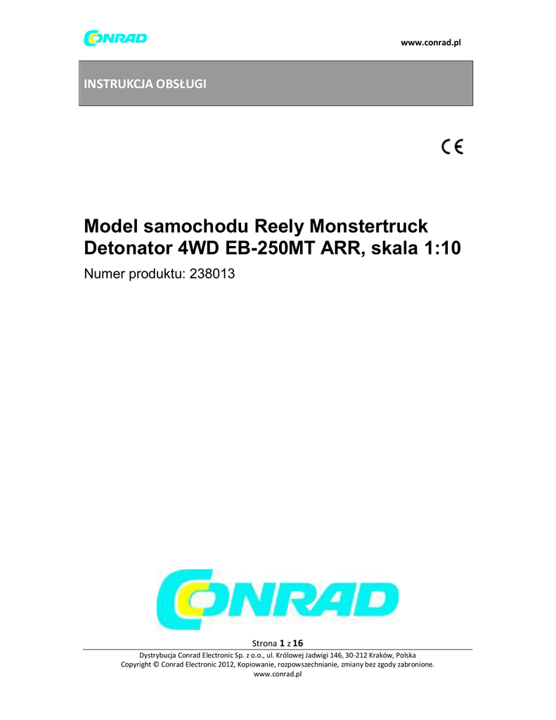 www.conrad.pl INSTRUKCJA OBSŁUGI Model samochodu Reely Monstertruck Detonator 4WD EB-250MT ARR, skala 1:10 Numer produktu: 238013 Strona 1 z 16 Dystrybucja Conrad Electronic Sp. z o.o., ul. Królowej Jadwigi 146, 30-212 Kraków, Polska Copyright © Conrad Electronic 2012, Kopiowanie, rozpowszechnianie, zmiany bez zgody zabronione. www.conrad.pl www.conrad.pl 1. Uruchomienie a) Instalacja wspomagania kierownicy W zestawie można znaleźć wspornik z tworzywa sztucznego w kształcie litery U (B), który może zostać użyty do zamocowania standardowego serwa (nie zawarte w zestawie, należy zamówić oddzielnie) w pojeździe. Najpierw przykręcić serwo (A) do plastikowego wspornika (B). Przymocować odpowiednią dźwignię serwa (C) do serwa. W tym celu serwo powinno być ustawione w centralnej pozycji. W innym wypadku pozycja dźwigni będzie musiała zostać ponownie zmieniona. Jak wskazano na ilustracji powyżej, dźwignia serwa (C) musi być umieszczona bardziej po zewnętrznej stronie. Następnie zagiąć drążek serwa (D) do dźwigni serwa (C). Jeśli odchylenie kierownicy okaże się później zbyt duże, pozycja drążka serwa być może będzie musiała zostać zmieniona w dźwigni serwa. Strona 2 z 16 Dystrybucja Conrad Electronic Sp. z o.o., ul. Królowej Jadwigi 146, 30-212 Kraków, Polska Copyright © Conrad Electronic 2012, Kopiowanie, rozpowszechnianie, zmiany bez zgody zabronione. www.conrad.pl www.conrad.pl Zamocować plastikowy wspornik z zamontowanym serwem do podwozia za pomocą 4 wpuszczonych śrub z łbami. Popchnąć drążek serwa przez otwór (E) wskazany na ilustracji powyżej. Przed przymocowaniem drążka serwa (D) za pomocą wkrętu dociskowego (F), serwo musi znajdować się w centralnej pozycji, a dźwignia serwa (C) musi zostać prawidłowo wepchnięta i mocno przykręcona. b) Instalacja regulatora prędkości i odbiornika Regulator prędkości powinien zostać umieszczony pomiędzy silnikiem i serwem układu kierowniczego, aby osiągnąć niski środek ciężkości pojazdu. Przymocować regulator prędkości do podwozia, np. za pomocą dwustronnej taśmy samoprzylepnej. Podłączyć dwa wyjściowe kable regulatora prędkości do silnika. Zapoznać się z instrukcją obsługi dla używanego regulatora prędkości. Odbiornik może zostać zainstalowany na górnej płycie podwozia przy użyciu dwustronnej taśmy samoprzylepnej. Połączyć serwo układu kierowniczego i kable regulatora prędkości do odpowiedniego kanału odbiornika; zachować prawidłową biegunowość w odbiorniku. Zamocować wszystkie kable używając opasek zaciskowych, aby były one odpowiednio umieszczone i by nie mogły dostać się do napędu. Aby uniknąć zakłóceń i problemów z odbiorem nie należy związywać razem kabli serwa lub anteny odbiornika z innymi przewodami. c) Instalacja kabla anteny odbiornika Całkowicie rozwinąć kabel anteny i ostrożnie go wygładzić. Strona 3 z 16 Dystrybucja Conrad Electronic Sp. z o.o., ul. Królowej Jadwigi 146, 30-212 Kraków, Polska Copyright © Conrad Electronic 2012, Kopiowanie, rozpowszechnianie, zmiany bez zgody zabronione. www.conrad.pl www.conrad.pl Następnie przełożyć kabel anteny przez mocowanie na pojeździe od dołu, a następnie przez dołączoną tubę anteny. Wpiąć tubę anteny do odpowiedniego uchwytu w pojeździe (zob. strzałkę na ilustracji powyżej). Pozwolić, aby jakikolwiek nadmiar kabla anteny wystawał luźno z końcówki tuby anteny. Zdjęcie uchwytu baterii pomaga łatwiej przewlec kabel anteny przez uchwyt. W tym celu należy odkręcić 4 śruby mocujące uchwyt baterii do podwozia. ! Należy upewnić się, że kabel anteny nie zwisa do napędu, ani nie dotyka wału cardana. Zazwyczaj wystarczy lekko dokręcić kabel lub zamocować w miejscu za pomocą opaski zaciskowej. Nigdy nie skracać kabla anteny! Nigdy nie zwijać kabla anteny! To znacząco zmniejszy zasięg! d) Przygotowanie karoserii W zależności od używanej karoserii odpowiednie przekładki muszą zostać zainstalowane w podwoziu pojazdu, a w nadwoziu muszą zostać wywiercone pasujące otwory. Te otwory mogą zostać wykonane za pomocą zwykłego wiertła spiralnego lub specjalnego wiertła do karoserii. Należy także pamiętać, aby wywiercić kolejny otwór dla tuby anteny po umieszczeniu kabla anteny dla odbiornika. Metalowe zaciski do zamocowania karoserii zostały dołączone do zestawu wraz z samochodem. e) Wkładanie baterii/akumulatorów do nadajnika Jeśli jeszcze nie zostało to zrobione, należy włożyć baterie lub całkowicie naładowane akumulatory do nadajnika. Zapoznać się z instrukcjami obsługi dla stosowanego systemu zdalnego sterowania. f) Uruchamianie nadajnika Włączyć nadajnik i ustawić funkcje kalibracji dla układu kierowniczego i prowadzenia pojazdu w pozycji centralnej. Jeśli nadajnik posiada funkcję Dual Rate, należy ją dezaktywować lub ustawić ją na nieograniczone odchylenie kierownicy. Należy także zapoznać się z instrukcjami systemu zdalnego sterowania. Strona 4 z 16 Dystrybucja Conrad Electronic Sp. z o.o., ul. Królowej Jadwigi 146, 30-212 Kraków, Polska Copyright © Conrad Electronic 2012, Kopiowanie, rozpowszechnianie, zmiany bez zgody zabronione. www.conrad.pl www.conrad.pl g) Wkładanie baterii napędowej do pojazdu ! Uwaga! Baterii napędowej nie należy na razie podłączać do regulatora prędkości! Najpierw należy uruchomić nadajnik. ! Ten pojazd może być używany jedynie z baterią napędową NiMH z 6 ogniwami (napięcie znamionowe baterii napędowej 7.2V) lub LiPo z dwoma ogniwami (napięcie znamionowe – 7.4 V). Przy stosowaniu baterii napędowej z większą ilością ogniw, istnieje ryzyko pożaru wynikłego z przegrzania silnika. Poza tym napęd pojazdu będzie przeciążony i zostanie uszkodzony (np. dyferencyjny). Utrata gwarancji! Ważne: jeśli użytkownik używa baterii napędowej LiPo, stosowany regulator prędkości musi posiadać rozpoznawanie podnapięcia z fu
