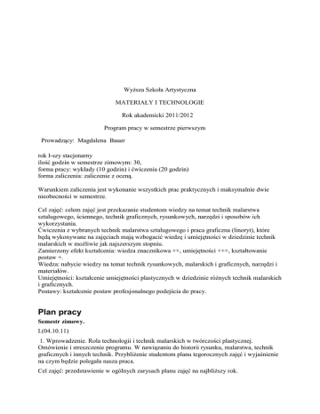 Wyższa Szkoła Artystyczna MATERIAŁY I TECHNOLOGIE Rok akademicki 2011/2012 Program pracy w semestrze pierwszym Prowadzący: Magdalena Bauer rok I-szy stacjonarny ilość godzin w semestrze zimowym: 30, forma pracy: wykłady (10 godzin) i ćwiczenia (20 godzin) forma zaliczenia: zaliczenie z oceną. Warunkiem zaliczenia jest wykonanie wszystkich prac praktycznych i maksymalnie dwie nieobecności w semestrze. Cel zajęć: celem zajęć jest przekazanie studentom wiedzy na temat technik malarstwa sztalugowego, ściennego, technik graficznych, rysunkowych, narzędzi i sposobów ich wykorzystania. Ćwiczenia z wybranych technik malarstwa sztalugowego i praca graficzna (linoryt), które będą wykonywane na zajęciach mają wzbogacić wiedzę i umiejętności w dziedzinie technik malarskich w możliwie jak najszerszym stopniu. Zamierzony efekt kształcenia: wiedza znacznikowa ++, umiejętności +++, kształtowanie postaw +. Wiedza: nabycie wiedzy na temat technik rysunkowych, malarskich i graficznych, narzędzi i materiałów. Umiejętności: kształcenie umiejętności plastycznych w dziedzinie różnych technik malarskich i graficznych. Postawy: kształcenie postaw profesjonalnego podejścia do pracy. Plan pracy Semestr zimowy. I.(04.10.11) 1. Wprowadzenie. Rola technologii i technik malarskich w twórczości plastycznej. Omówienie i streszczenie programu. W nawiązaniu do historii rysunku, malarstwa, technik graficznych i innych technik. Przybliżenie studentom planu tegorocznych zajęć i wyjaśnienie na czym będzie polegała nasza praca. Cel zajęć: przedstawienie w ogólnych zarysach planu zajęć na najbliższy rok. 2. Omówienie najczęściej spotykanych materiałów rysunkowych i malarskich i przedstawienie ich w kontekście historycznym: węgiel, sztyft metalowy, pióro, sangwina, ołówek, pastel, grafit, pędzle, tusz. (Wykład) Cel zajęć: omówienie właściwości i możliwości danego narzędzia. II.(11.10.11) 1. i 2. Podłoża rysunkowe – papier i historia papiernictwa. Produkcja papieru, cechy materiałów papierniczych, rodzaje papieru. (Wykład) III.(18.10.11) 1. i 2. Ćwiczenie 1. Kompozycja abstrakcyjna, geometryczna, w technice frotażu, format 21cm na 21cm, praca czarno-biała; potrzebne materiały: papier, ołówek. Cel ćwiczenia: pokazanie możliwości budowania kompozycji za pomocą faktury. IV.(25.10.11) 1.Różne sposoby preparowania powierzchni papieru i środki maskujące: płyn maskujący, taśma maskująca, pastel olejny, świeca. Papier i jego struktura, możliwość wzbogacenia rysunku poprzez samodzielne przygotowanie powierzchni papieru. 2. Ćwiczenie 2. Kompozycja abstrakcyjna, format 30cm na 30 cm, praca kolorowa; potrzebne materiały: papier akwarelowy, akwarele, pędzle. Cel ćwiczenia: Budowanie kompozycji za pomocą silnie zróżnicowanego podłoża. Wykorzystanie efektów uzyskanych różnymi narzędziami. V.(08.11.11) 1.i 2. Techniki malarskie: akwarela. Cechy charakterystyczna techniki: historia, pigmenty, podobrazia, techniki malowania, utrwalanie. (Wykład) VI. (15.11.11) 1.i 2. Ćwiczenie 3. Wykonanie kopii wybranego obrazu w technice akwarelowej; potrzebne materiały: reprodukcja wybranego obrazu malowanego w technice akwarelowej, kalka techniczna, ołówek, gruba igła. Cel ćwiczenia: Kopia wykonana za pomocą przeprószania przez kalkę wprowadza studentów w historyczne aspekty kopiowania, przybliża warsztat i sposób pracy dawnych mistrzów. VII.(22.11.11) 1. i 2. Dalszy ciąg ćwiczenia 3-go. Kopia wybranego obrazu w technice akwarelowej; potrzebne materiały: papier akwarelowy, cienki pędzelek, przeprócha wykonana na poprzednich zajęciach. VIII. (29.11.11) 1. i 2. Kontynuacja ćwiczenia 3-go. Kopia wybranego obrazu w technice akwarelowej; potrzebne materiały: reprodukcja wybranego obrazu, papier akwarelowy z naniesionym szkicem obrazu, farby akwarelowe, pędzle. IX.(06.12.11) 1. Materiały malarskie. Podobrazia, spoiwa, kleje, grunty. Przykładowe sposoby przygotowania gruntów, gruntowanie, przygotowanie płótna, rodzaje pędzli, fiksatywy, werniksy. (Wykład) 2.Materiały najczęściej używane w malarstwie: oleje i pokosty, sykatywy, żywice, balsamy, tłuszcze zwierzęce, woski, spoiwa organiczne (kleje roślinne, zwierzęce i syntetyczne), spoiwa nieorganiczne (pochodzenia mineralnego), rozpuszczalniki. (Wykład) X.(13.12.11) 1. i 2. Pigmenty. Ogólna charakterystyka najczęściej używanych pigmentów. Tło historyczne. Pozyskiwanie pigmentów ucieranie farb. Zmiany zachodzące przy łączeniu pigmentów. (Wykład) XI.(03.01.12) 1. i 2. Techniki malarskie w rozwoju historycznym, technologie i sposoby malowania. Pastel, gwasz, tempera.(Wykład) XII.(10.01.12) 1. i 2. Ćwiczenie 4. Wykonanie kopii obrazu w technice pasteli tłustej lub suchej. Zastosowanie odpowiedniego podłoża, sposoby kopiowania zależnie od wybranej techniki; potrzebne materiały: reprodukcja wybranego obrazu w technice pasteli, papier welurowy, kalka techniczna, pastele. Cel ćwiczenia: Poznanie w sposób praktyczny techniki malarstwa sztalugowego. XIII. (17.01.12) 1. Techniki malarskie: iluminatorstwo, malarstwo olejne, enkaustyka, akryl, techniki mieszane. (Wykład) 2. Techniki pozłotnicze: historia techniki, materiały, narzędzia, sposoby dekorowania, cyzelowanie, emalia, niello; technika złocenia na pulmencie, technika złocenia na mikstionie.(Wykład) XIV.(24.01.12) 1. i 2. Przegląd prac. Zaliczenie I-szego semestru. Semestr letni. I.(21.02.12) 1. i 2. Tempera na desce. Dokładne omówienie wybranej techniki malarskiej. II. (28.02.12) 1. i 2. Historia techniki temperowej, podobrazia i sposoby ich przygotowania, zaprawy narzędzia, spoiwa, farby, techniki malowania. III.(06.03.12) 1. i 2. Ćwiczenie 5. Realizacja malarska w technice temperowej. Kopia ikony na desce. Przygotowania deski, szlifowania, gruntowanie, technika malowania ikon; potrzebne materiały: zagruntowana deska, reprodukcja ikony, kalka techniczna, ołówek. Cel ćwiczenia