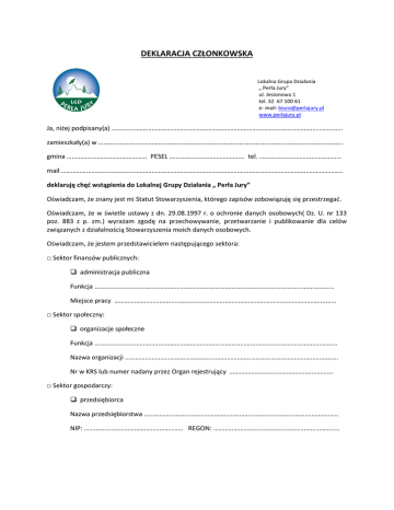 DEKLARACJA CZŁONKOWSKA Lokalna Grupa Działania „ Perła Jury” ul. Jesionowa 1 tel. 32 67 100 61 e- mail: [email protected] www.perlajury.pl Ja, niżej podpisany(a) ………………………………………………………………………………………………………………………… zamieszkały(a) w ……………………………………………………………………………………………………………………………….. gmina ………………………………………… PESEL ……………………………………… tel. ……….………………………………… mail …………………………………………………………………………………………….…………………………………………………….. deklaruję chęć wstąpienia do Lokalnej Grupy Działania „ Perła Jury” Oświadczam, że znany jest mi Statut Stowarzyszenia, którego zapisów zobowiązuję się przestrzegać. Oświadczam, że w świetle ustawy z dn. 29.08.1997 r. o ochronie danych osobowych( Dz. U. nr 133 poz. 883 z p. zm.) wyrażam zgodę na przechowywanie, przetwarzanie i publikowanie dla celów związanych z działalnością Stowarzyszenia moich danych osobowych. Oświadczam, że jestem przedstawicielem następującego sektora: □ Sektor finansów publicznych: administracja publiczna Funkcja ……………………………………………………………………………………………….………………….………… Miejsce pracy ……………………………………………………………………………………….……………………...….. □ Sektor społeczny: organizacje społeczne Funkcja ………………………………………………………………………………….…………………………………………… Nazwa organizacji …………………………………………………………………………………………………………….... Nr w KRS lub numer nadany przez Organ rejestrujący ……………………….……………………………. □ Sektor gospodarczy: przedsiębiorca Nazwa przedsiębiorstwa …………………………………………………………………………………………………….. NIP: ………………………………………………….. REGON: …………………………………………………….………….. rolnik Nazwa gospodarstwa rolnego ……………………………………………………………………….………………….. Nr identyfikacyjny nadany przez ARiMR (jeśli dotyczy) ………………………………………………….…… właściciel gospodarstwa agroturystycznego …………………………………………………………………… Nr identyfikacyjny nadany przez ARiMR (jeśli dotyczy) ………………………………………………………. mieszkaniec Deklaruję działanie na rzecz Stowarzyszenia w zakresie: ( np. prowadzenie wykładów, warsztatów na określony temat, udziału w organizacji imprez, tłumaczenia, pisanie artykułów, nocowanie gości, opieka nad gośćmi, transport, projektowanie/druk/ksero/dystrybucja materiałów reklamowych, prowadzenie strony internetowej, fotografia, wideo filmowanie, nagrywanie, kopiowanie materiałów, nagłaśnianie imprez, obsługa dźwiękowa/akustyczna/oświetleniowa, multimedia, prezentacje, grafika, plakaty, PR {współpraca mediami, serwisami internetowymi, organizacjami o podobnym lub zbliżonym charakterze, urzędami, etc.},konsultacje prawne, informatyczne, historyczno – etnograficzne, konsultacje z zakresu ochrony środowiska, ekonomiczne, inne konsultacje, użyczenie sali/lokalu na warsztaty/szkolenia, wyszukiwanie sponsorów, inne): …………………………………………………………………………………………………………………………………………………………… ……………………………………………………………………………………………………………………………………………………………. ……………………………………………………………. data i podpis Wyrażam zgodę na przechowywanie, przetwarzanie i publikowanie moich danych osobowych dla celów promocyjnych, marketingowych, reklamowych, informacyjnych w związku z prowadzoną działalnością Stowarzyszenia oraz przyszłych, wynikających z działalności Stowarzyszenia zgodnie z ustawą z dnia 29.08.1997r. o ochronie danych osobowych (Dz. U. 2014r. poz. 1182). Jednocześnie oświadczam, iż zobowiązuję się do aktualizowania moich danych osobowych bez zbędnej zwłoki od wystąpienia ww. zmian. Administratorem danych osobowych jest Stowarzyszenie LGD „Perła Jury”. ……………………………………………………………. data i podpis Wyrażam zgodę na otrzymywanie informacji o działalności LGD „Perła Jury” na adres email oraz przetwarzania tego adresu w bazie danych LGD „Perła Jury” zgodnie z ustawą z dnia 18.07.2002r o świadczeniu usług drogą elektroniczną (Dz. U. 2002 Nr 144 poz. 1204): □ tak □ nie ……………………………………………………………. data i podpis Zostałe(a)m poinformowany o prawie wglądu do moich danych osobowych oraz możliwości odstąpienia od każdej z ww. zgód w dowolnym czasie. ……………………………………………………………. data i podpis