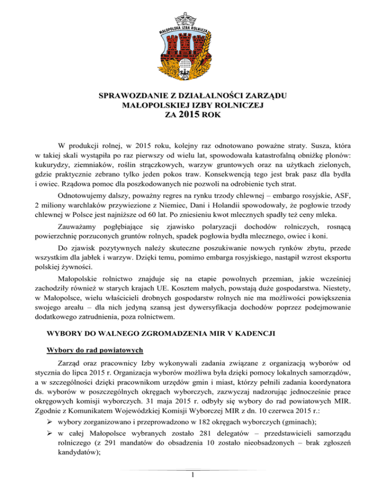 SPRAWOZDANIE Z DZIAŁALNOŚCI ZARZĄDU MAŁOPOLSKIEJ IZBY ROLNICZEJ ZA 2015 ROK W produkcji rolnej, w 2015 roku, kolejny raz odnotowano poważne straty. Susza, która w takiej skali wystąpiła po raz pierwszy od wielu lat, spowodowała katastrofalną obniżkę plonów: kukurydzy, ziemniaków, roślin strączkowych, warzyw gruntowych oraz na użytkach zielonych, gdzie praktycznie zebrano tylko jeden pokos traw. Konsekwencją tego jest brak pasz dla bydła i owiec. Rządowa pomoc dla poszkodowanych nie pozwoli na odrobienie tych strat. Odnotowujemy dalszy, poważny regres na rynku trzody chlewnej – embargo rosyjskie, ASF, 2 miliony warchlaków przywiezione z Niemiec, Dani i Holandii spowodowały, że pogłowie trzody chlewnej w Polsce jest najniższe od 60 lat. Po zniesieniu kwot mlecznych spadły też ceny mleka. Zauważamy pogłębiające się zjawisko polaryzacji dochodów rolniczych, rosnącą powierzchnię porzuconych gruntów rolnych, spadek pogłowia bydła mlecznego, owiec i koni. Do zjawisk pozytywnych należy skuteczne poszukiwanie nowych rynków zbytu, przede wszystkim dla jabłek i warzyw. Dzięki temu, pomimo embarga rosyjskiego, nastąpił wzrost eksportu polskiej żywności. Małopolskie rolnictwo znajduje się na etapie powolnych przemian, jakie wcześniej zachodziły również w starych krajach UE. Kosztem małych, powstają duże gospodarstwa. Niestety, w Małopolsce, wielu właścicieli drobnych gospodarstw rolnych nie ma możliwości powiększenia swojego areału – dla nich jedyną szansą jest dywersyfikacja dochodów poprzez podejmowanie dodatkowego zatrudnienia, poza rolnictwem. WYBORY DO WALNEGO ZGROMADZENIA MIR V KADENCJI Wybory do rad powiatowych Zarząd oraz pracownicy Izby wykonywali zadania związane z organizacją wyborów od stycznia do lipca 2015 r. Organizacja wyborów możliwa była dzięki pomocy lokalnych samorządów, a w szczególności dzięki pracownikom urzędów gmin i miast, którzy pełnili zadania koordynatora ds. wyborów w poszczególnych okręgach wyborczych, zazwyczaj nadzorując jednocześnie prace okręgowych komisji wyborczych. 31 maja 2015 r. odbyły się wybory do rad powiatowych MIR. Zgodnie z Komunikatem Wojewódzkiej Komisji Wyborczej MIR z dn. 10 czerwca 2015 r.: wybory zorganizowano i przeprowadzono w 182 okręgach wyborczych (gminach); w całej Małopolsce wybranych zostało 281 delegatów – przedstawicieli samorządu rolniczego (z 291 mandatów do obsadzenia 10 zostało nieobsadzonych – brak zgłoszeń kandydatów); 1 w okręgowych komisjach wyborczych zgłoszono 339 kandydatów, którzy uzyskali poparcie od 16 950 rolników (co stanowiło: 3,95% uprawnionych do głosowania; 11,86% małopolskich gospodarstw rolnych o powierzchni powyżej 1 ha); w 128 okręgach liczba zgłoszonych kandydatów była równa liczbie mandatów do obsadzenia; liczba osób/podmiotów uprawnionych do głosowania wynosiła 428 764; w wyborach udział wzięło 7 994 osób (frekwencja wyborcza wyniosła 1,86%), co stanowi 5,59% małopolskich gospodarstw rolnych o powierzchni powyżej 1 ha. Największą frekwencję odnotowano w gminach: Racławice (13,19%); Grybów Miasto (12,87%); Wietrzychowice (12,21%); Proszowice (12,17%); Kamionka Wielka (12,15%). Najmniejszą frekwencję odnotowano w następujących gminach: Kraków (0,17%); Kalwaria Zebrzydowska (0,17%); Czarny Dunajec (0,19%); Bochnia gmina (0,20%); Mszana Dolna gmina (0,25%). W okręgach wyborczych, w których kandydatów było więcej niż mandatów średnia frekwencja wynosiła 3,58%. Podsumowując wybory delegatów do rad powiatowych Wojewódzka Komisja Wyborcza MIR przekazała do KRIR swoje uwagi dot. koniecznych zmian w ordynacji wyborczej izb rolniczych i ustawy o izbach rolniczych, sugerując zmiany, które w przyszłości pozwoliłyby uniknąć błędów, niedomówień oraz wątpliwych interpretacji prawnych. Wybory do Walnego Zgromadzenia MIR W dniach 15, 16 i 17 czerwca 2015 r. odbyły się pierwsze posiedzenia Rad Powiatowych MIR. Podczas spotkań delegaci wybierali przewodniczącego Rady oraz Delegata do WZ MIR. Łącznie w 19 powiatach wybrano 38 osób – członków V kadencji WZ MIR. Wybory do samorządu rolniczego w woj. małopolskim zakończyły się w dniu 10 lipca 2015 r., podczas pierwszego posiedzenia Walnego Zgromadzenia MIR V kadencji. Zebrani delegaci wybrali wówczas przedstawicieli do pozostałych organów Izby: Zarządu, Komisji Rewizyjnej i Komisji Budżetowej, oraz Delegata do WZ KRIR. DZIAŁALNOŚĆ STATUTOWA WALNE ZGROMADZENIE W 2015 roku odbyły się 4 posiedzenia Walnego Zgromadzenia Małopolskiej Izby Rolniczej: 1) – 2 marca, 2) – 10 lipca, 3) – 8 września i 4) 10 – grudnia. W 2015 r. Walne Zgromadzenie IV kadencji MIR podjęło 6 uchwał, które dotyczyły: (Uchwały nr 57-62/WZ/2015, z dn. 2 marca 2015 r.): zatwierdzenia sprawozdania z działalności Zarządu Małopolskiej Izby Rolniczej za 2014 rok; wykonania budżetu Małopolskiej Izby Rolniczej za 2014 rok; zatwierdzenia sprawozdania z działalności Komisji Rewizyjnej za 2014 rok; udzielenia absolutorium Zarządowi Małopolskiej Izby Rolniczej za działalność w 2014 roku; ustalenia przynależności delegata z miasta Krakowa do składu Krakowskiej Rady Powiatowej; wyboru członków Wojewódzkiej Komisji Wyborczej do przeprowadzenia wyborów do Walnego Zgromadzenia Małopolskiej Izby Rolniczej na następną kadencję. 2 Walne Zgromadzenie V kadencji MIR podjęło łącznie 22 uchwały, które dotyczyły: (Uchwały nr 1-15/WZ/2015 z dn. 10 lipca 2015 r): wyborów członków poszczególnych organów i ciał statutowych MIR; nowelizacji uchwały budżetowej na 2015 rok. (Uchwały nr 16-18/WZ/2015 z dn. 10 lipca 2015 r): podniesienia kwoty na budowę budynku administracyjno-usługowego w Tarnowie; nowelizacji uchwały budżetowej na 2015 rok (dot. stawki zwrotu kosztów podróży dla delegatów MIR szacujących szkody); pomocy dla rolników poszkodowanych w efekcie suszy. (Uchwały nr 19-22/WZ/20