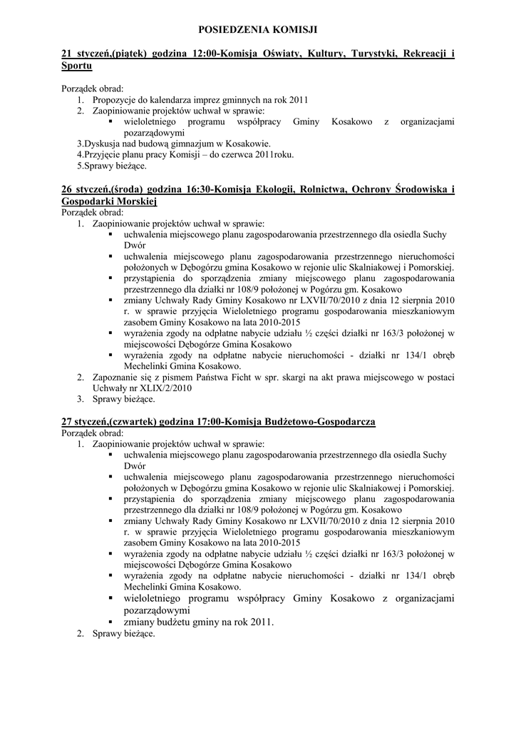 POSIEDZENIA KOMISJI 21 styczeń,(piątek) godzina 12:00-Komisja Oświaty, Kultury, Turystyki, Rekreacji i Sportu Porządek obrad: 1. Propozycje do kalendarza imprez gminnych na rok 2011 2. Zaopiniowanie projektów uchwał w sprawie: wieloletniego programu współpracy Gminy pozarządowymi 3.Dyskusja nad budową gimnazjum w Kosakowie. 4.Przyjęcie planu pracy Komisji – do czerwca 2011roku. 5.Sprawy bieżące. Kosakowo z organizacjami 26 styczeń,(środa) godzina 16:30-Komisja Ekologii, Rolnictwa, Ochrony Środowiska i Gospodarki Morskiej Porządek obrad: 1. Zaopiniowanie projektów uchwał w sprawie: uchwalenia miejscowego planu zagospodarowania przestrzennego dla osiedla Suchy Dwór uchwalenia miejscowego planu zagospodarowania przestrzennego nieruchomości położonych w Dębogórzu gmina Kosakowo w rejonie ulic Skalniakowej i Pomorskiej. przystąpienia do sporządzenia zmiany miejscowego planu zagospodarowania przestrzennego dla działki nr 108/9 położonej w Pogórzu gm. Kosakowo zmiany Uchwały Rady Gminy Kosakowo nr LXVII/70/2010 z dnia 12 sierpnia 2010 r. w sprawie przyjęcia Wieloletniego programu gospodarowania mieszkaniowym zasobem Gminy Kosakowo na lata 2010-2015 wyrażenia zgody na odpłatne nabycie udziału ½ części działki nr 163/3 położonej w miejscowości Dębogórze Gmina Kosakowo wyrażenia zgody na odpłatne nabycie nieruchomości - działki nr 134/1 obręb Mechelinki Gmina Kosakowo. 2. Zapoznanie się z pismem Państwa Ficht w spr. skargi na akt prawa miejscowego w postaci Uchwały nr XLIX/2/2010 3. Sprawy bieżące. 27 styczeń,(czwartek) godzina 17:00-Komisja Budżetowo-Gospodarcza Porządek obrad: 1. Zaopiniowanie projektów uchwał w sprawie: uchwalenia miejscowego planu zagospodarowania przestrzennego dla osiedla Suchy Dwór uchwalenia miejscowego planu zagospodarowania przestrzennego nieruchomości położonych w Dębogórzu gmina Kosakowo w rejonie ulic Skalniakowej i Pomorskiej. przystąpienia do sporządzenia zmiany miejscowego planu zagospodarowania przestrzennego dla działki nr 108/9 położonej w Pogórzu gm. Kosakowo zmiany Uchwały Rady Gminy Kosakowo nr LXVII/70/2010 z dnia 12 sierpnia 2010 r. w sprawie przyjęcia Wieloletniego programu gospodarowania mieszkaniowym zasobem Gminy Kosakowo na lata 2010-2015 wyrażenia zgody na odpłatne nabycie udziału ½ części działki nr 163/3 położonej w miejscowości Dębogórze Gmina Kosakowo wyrażenia zgody na odpłatne nabycie nieruchomości - działki nr 134/1 obręb Mechelinki Gmina Kosakowo. wieloletniego programu współpracy Gminy Kosakowo z organizacjami pozarządowymi zmiany budżetu gminy na rok 2011. 2. Sprawy bieżące. 28 styczeń,(piątek) godzina 17:00-Komisja Samorządu Terytorialnego i Zdrowia Porządek obrad: 1. Bezpieczeństwo w Gminie-zapoznanie się ze sprawozdaniami za rok 2010 z działalności Komisariatu Policji, Straży Gminnej i Ochotniczej Straży Pożarnej 2. Zapoznanie się z działalnością Gminnej Komisji Profilaktyki i Rozwiązywania Problemów Alkoholowych oraz Gminnego Programu Przeciwdziałaniu Narkomanii. 3. Zaopiniowanie projektów uchwał w sprawie: ustalenia zasad stosowanych przy nadawaniu nazw ulicom, placom i innym terenowym obiektom publicznym oraz drogom wewnętrznym na terenie gminy Kosakowo. wieloletniego programu pozarządowymi 4.Sprawy bieżące. współpracy Gminy Kosakowo z ] 31 styczeń,(poniedziałek) godzina 17:00-Wspólne posiedzenie Komisji Porządek obrad: 1. Dyskusja nad harmonogramem budowy i modernizacji dróg gminnych. organizacjami