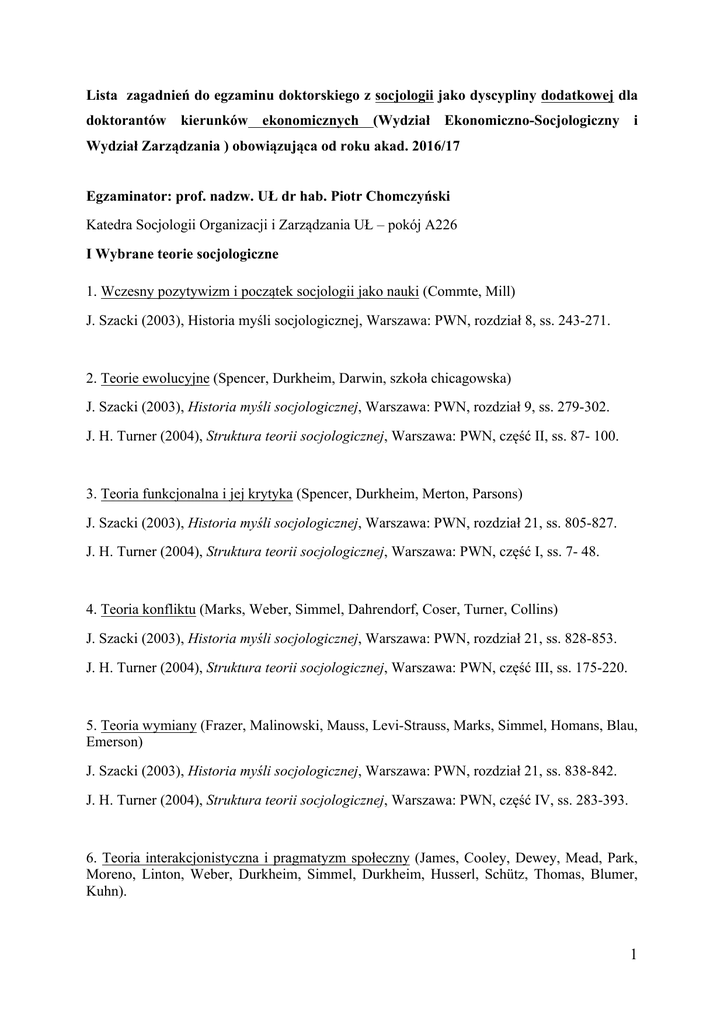 Lista zagadnień do egzaminu doktorskiego z socjologii jako dyscypliny dodatkowej dla doktorantów kierunków ekonomicznych (Wydział Ekonomiczno-Socjologiczny i Wydział Zarządzania ) obowiązująca od roku akad. 2016/17 Egzaminator: prof. nadzw. UŁ dr hab. Piotr Chomczyński Katedra Socjologii Organizacji i Zarządzania UŁ – pokój A226 I Wybrane teorie socjologiczne 1. Wczesny pozytywizm i początek socjologii jako nauki (Commte, Mill) J. Szacki (2003), Historia myśli socjologicznej, Warszawa: PWN, rozdział 8, ss. 243-271. 2. Teorie ewolucyjne (Spencer, Durkheim, Darwin, szkoła chicagowska) J. Szacki (2003), Historia myśli socjologicznej, Warszawa: PWN, rozdział 9, ss. 279-302. J. H. Turner (2004), Struktura teorii socjologicznej, Warszawa: PWN, część II, ss. 87- 100. 3. Teoria funkcjonalna i jej krytyka (Spencer, Durkheim, Merton, Parsons) J. Szacki (2003), Historia myśli socjologicznej, Warszawa: PWN, rozdział 21, ss. 805-827. J. H. Turner (2004), Struktura teorii socjologicznej, Warszawa: PWN, część I, ss. 7- 48. 4. Teoria konfliktu (Marks, Weber, Simmel, Dahrendorf, Coser, Turner, Collins) J. Szacki (2003), Historia myśli socjologicznej, Warszawa: PWN, rozdział 21, ss. 828-853. J. H. Turner (2004), Struktura teorii socjologicznej, Warszawa: PWN, część III, ss. 175-220. 5. Teoria wymiany (Frazer, Malinowski, Mauss, Levi-Strauss, Marks, Simmel, Homans, Blau, Emerson) J. Szacki (2003), Historia myśli socjologicznej, Warszawa: PWN, rozdział 21, ss. 838-842. J. H. Turner (2004), Struktura teorii socjologicznej, Warszawa: PWN, część IV, ss. 283-393. 6. Teoria interakcjonistyczna i pragmatyzm społeczny (James, Cooley, Dewey, Mead, Park, Moreno, Linton, Weber, Durkheim, Simmel, Durkheim, Husserl, Schütz, Thomas, Blumer, Kuhn). 1 J. Szacki (2003), Historia myśli socjologicznej, Warszawa: PWN, rozdział 13, ss. 447-492, rozdział 15, ss. 543-591. J. H. Turner (2004), Struktura teorii socjologicznej, Warszawa: PWN, część V, ss. 395-431. 7. Amerykańska socjologia opisowa (szkoła chicagowska, Park) J. Szacki (2003), Historia myśli socjologicznej, Warszawa: PWN, rozdział 16, ss. 593-626. 8. Teorie jaźni, tożsamości i roli (Stryker, McCall, Simmons, Turner) J. H. Turner (2004), Struktura teorii socjologicznej, Warszawa: PWN, część V, ss. 435-455. 9. Podejście dramaturgiczne (Goffman) J. Szacki (2003), Historia myśli socjologicznej, Warszawa: PWN, rozdział 21, ss. 844-849. J. H. Turner (2004), Struktura teorii socjologicznej, Warszawa: PWN, część V, ss. 456-479. 10. Teorie emocji w interakcji (Hochschild, Shott, Heise, Stryker, Collins, Kemper, Ridgeway, Berger, Markovsky, Lawler, Hammond, Turner, Scheff) J. H. Turner (2004), Struktura teorii socjologicznej, Warszawa: PWN, część V, ss. 495-526. 11. Teoria strukturalistyczna (Marks, Durkheim, Simmel) J. H. Turner (2004), Struktura teorii socjologicznej, Warszawa: PWN, część VI, ss. 545-556. 12. Teoria strukturacji (Giddens) J. Szacki (2003), Historia myśli socjologicznej, Warszawa: PWN, rozdział 22, ss. 880-888. J. H. Turner (2004), Struktura teorii socjologicznej, Warszawa: PWN, część VI, ss. 571-584. 13. Polska socjologia humanistyczna (Znaniecki) J. Szacki (2003), Historia myśli socjologicznej, Warszawa: PWN, rozdział 19, ss. 880-888. 14. Współczesna myśl socjologiczna (Bourdieu, Focault, Habermas) J. Szacki (2003), Historia myśli socjologicznej, Warszawa: PWN, rozdział, 22, ss. 889-910, 921-934. 2 II. Metody i techniki badań socjologicznych 1) Badania ilościowe a badania jakościowe- podstawowe techniki i narzędzia badawcze 2) Rola badań sondażowych w demokracji 3) Sposoby doboru jednostek do badań 4) Różne rodzaje wywiadów w socjologii 5) Badania wizualne 6) Wykorzystanie źródeł zastanych 7) Obserwacja (jawna, ukryta, uczestniczącą, nieuczestnicząca) jako metoda badawcza; dylematy natury etycznej 8) Wykorzystanie źródeł zastanych Zalecana, podstawowa literatura: 1. Babbie E., Badania społeczne w praktyce, Warszawa 2006. 2. Konecki K.T., 2000, Studia z metodologii badań jakościowych: teoria ugruntowana, PWN, Warszawa. 3. Walczak-Duraj, Socjologia dla ekonomistów, Warszawa, PWE, 2010. 4. Chomczyński P. „Wybrane problemy etyczne w badaniach. Obserwacja uczestnicząca ukryta.” Przegląd Socjologii Jakościowej, tom II, nr 1, 2006, s. 68-87. 5. Hammersley M., Atkinson, P., Metody badań terenowych, tłum. S. Dymczyk, Poznań: Zysk i S-ka, 2000. 6. Konecki K. Chomczyński P. Słownik socjologii jakościowej, Warszawa: Difin, hasła: antropologia wizualna/socjologia wizualna, etnografia organizacji, etnografia socjologiczna, metodologia teorii ugruntowanej, metody wizualne, obserwacja, obserwacja uczestnicząca, studium przypadku, wywiad narracyjny, wywiad swobodny, zogniskowany wywiad grupowy. 3