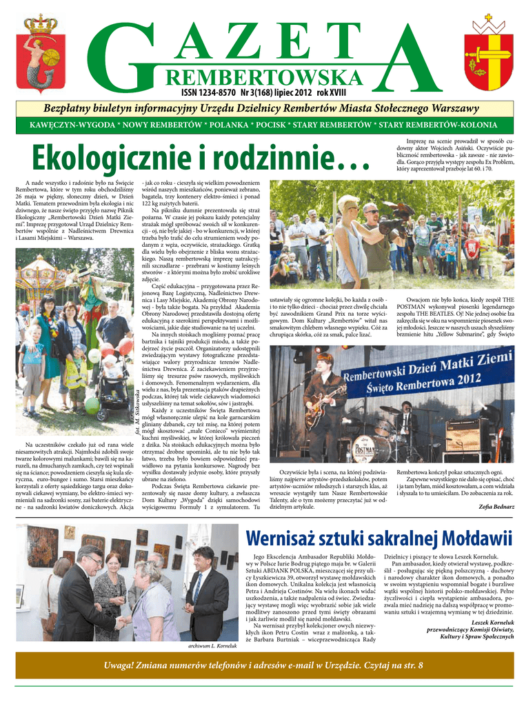 ISSN 1234-8570 Nr 3(168) lipiec 2012 rok XVIII KAWĘCZYN-WYGODA * NOWY REMBERTÓW * POLANKA * POCISK * STARY REMBERTÓW * STARY REMBERTÓW-KOLONIA Ekologicznie i rodzinnie… A nade wszystko i radośnie było na Święcie Rembertowa, które w tym roku obchodziliśmy 26 maja w piękny, słoneczny dzień, w Dzień Matki. Tematem przewodnim była ekologia i nic dziwnego, że nasze święto przyjęło nazwę Piknik Ekologiczny „Rembertowski Dzień Matki Ziemi”. Imprezę przygotował Urząd Dzielnicy Rembertów wspólnie z Nadleśnictwem Drewnica i Lasami Miejskimi – Warszawa. Na uczestników czekało już od rana wiele niesamowitych atrakcji. Najmłodsi zdobili swoje twarze kolorowymi malunkami; bawili się na karuzeli, na dmuchanych zamkach, czy też wspinali się na ściance; powodzeniem cieszyła się kula sferyczna, euro-bungee i sumo. Starsi mieszkańcy korzystali z oferty sąsiedzkiego targu oraz dokonywali ciekawej wymiany, bo elektro-śmieci wymieniali na sadzonki sosny, zaś baterie elektryczne - na sadzonki kwiatów doniczkowych. Akcja - jak co roku - cieszyła się wielkim powodzeniem wśród naszych mieszkańców, ponieważ zebrano, bagatela, trzy kontenery elektro-śmieci i ponad 122 kg zużytych baterii. Na pikniku dumnie prezentowała się straż pożarna. W czasie jej pokazu każdy potencjalny strażak mógł spróbować swoich sił w konkurencji - oj, nie byle jakiej - bo w konkurencji, w której trzeba było trafić do celu strumieniem wody podanym z węża, oczywiście, strażackiego. Gratką dla wielu było obejrzenie z bliska wozu strażackiego. Naszą rembertowską imprezę uatrakcyjnili szczudlarze - przebrani w kostiumy leśnych stworów - z którymi można było zrobić urokliwe zdjęcie. Część edukacyjna – przygotowana przez Rejonową Bazę Logistyczną, Nadleśnictwo Drewnica i Lasy Miejskie, Akademię Obrony Narodowej - była także bogata. Na przykład Akademia Obrony Narodowej przedstawiła dostojną ofertę edukacyjną z szerokimi perspektywami i możliwościami, jakie daje studiowanie na tej uczelni. Na innych stoiskach mogliśmy poznać pracę bartnika i tajniki produkcji miodu, a także podejrzeć życie pszczół. Organizatorzy udostępnili zwiedzającym wystawy fotograficzne przedstawiające walory przyrodnicze terenów Nadleśnictwa Drewnica. Z zaciekawieniem przyjrzeliśmy się tresurze psów rasowych, myśliwskich i domowych. Fenomenalnym wydarzeniem, dla wielu z nas, była prezentacja ptaków drapieżnych podczas, której tak wiele ciekawych wiadomości usłyszeliśmy na temat sokołów, sów i jastrzębi. Każdy z uczestników Święta Rembertowa mógł własnoręcznie ulepić na kole garncarskim gliniany dzbanek, czy też misę, na której potem mógł skosztować „małe Conieco” wyśmienitej kuchni myśliwskiej, w której królowała pieczeń z dzika. Na stoiskach edukacyjnych można było otrzymać drobne upominki, ale tu nie było tak łatwo, trzeba było bowiem odpowiedzieć prawidłowo na pytania konkursowe. Nagrody bez wysiłku dostawały jedynie osoby, które przyszły ubrane na zielono. Podczas Święta Rembertowa ciekawie prezentowały się nasze domy kultury, a zwłaszcza Dom Kultury „Wygoda” dzięki samochodowi wyścigowemu Formuły 1 z symulatorem. Tu Imprezę na scenie prowadził w sposób cudowny aktor Wojciech Asiński. Oczywiście publiczność rembertowska - jak zawsze - nie zawiodła. Gorąco przyjęła występy zespołu Ex Problem, który zaprezentował przeboje lat 60. i 70. ustawiały się ogromne kolejki, bo każda z osób i to nie tylko dzieci - chociaż przez chwilę chciała być zawodnikiem Grand Prix na torze wyścigowym. Dom Kultury „Rembertów” witał nas smakowitym chlebem własnego wypieku. Cóż za chrupiąca skórka, cóż za smak, palce lizać. Owacjom nie było końca, kiedy zespół THE POSTMAN wykonywał piosenki legendarnego zespołu THE BEATLES. Oj! Nie jednej osobie łza zakręciła się w oku na wspomnienie piosenek swojej młodości. Jeszcze w naszych uszach słyszeliśmy brzmienie hitu „Yellow Submarine”, gdy Święto Oczywiście była i scena, na której podziwialiśmy najpierw artystów-przedszkolaków, potem artystów-uczniów młodszych i starszych klas, aż wreszcie wystąpiły tam Nasze Rembertowskie Talenty, ale o tym możemy przeczytać już w oddzielnym artykule. Rembertowa kończył pokaz sztucznych ogni. Zapewne wszystkiego nie dało się opisać, choć i ja tam byłam, miód kosztowałam, a com widziała i słyszała to tu umieściłam. Do zobaczenia za rok. Zofia Bednarz Wernisaż sztuki sakralnej Mołdawii Jego Ekscelencja Ambasador Republiki Mołdowy w Polsce Iurie Bodrug piątego maja br. w Galerii Sztuki ABDANK POLSKA, mieszczącej się przy ulicy Łyszkiewicza 39, otworzył wystawę mołdawskich ikon domowych. Unikalna kolekcja jest własnością Petra i Andrieja Costinów. Na wielu ikonach widać uszkodzenia, a także nadpalenia od świec. Zwiedzający wystawę mogli więc wyobrazić sobie jak wiele modlitwy zanoszono przed tymi święty obrazami i jak żarliwie modlił się naród mołdawski. Na wernisaż przybył kolekcjoner owych niezwykłych ikon Petru Costin wraz z małżonką, a także Barbara Burtniak – wiceprzewodnicząca Rady Dzielnicy i piszący te słowa Leszek Korneluk. Pan ambasador, kiedy otwierał wystawę, podkreślił - posługując się piękną polszczyzną - duchowy i narodowy charakter ikon domowych, a ponadto w swoim wystąpieniu wspomniał bogate i burzliwe wątki wspólnej historii polsko-mołdawskiej. Pełne życzliwości i ciepła wystąpienie ambasadora, pozwala mieć nadzieję na dalszą współpracę w promowaniu sztuki i wzajemną wymianę w tej dziedzinie. Uwaga! Zmiana numerów telefonów i adresów e-mail w Urzędzie. Czytaj na str. 8 Leszek Korneluk przewodniczący Komisji Oświaty, Kultury i Spraw Społecznych WIEŚCI Z RATUSZA Z PRAC ZARZĄDU DZIELNICY W okresie od 23 marca br. do 30 czerwca br. odbyło się 14 posiedzeń zar