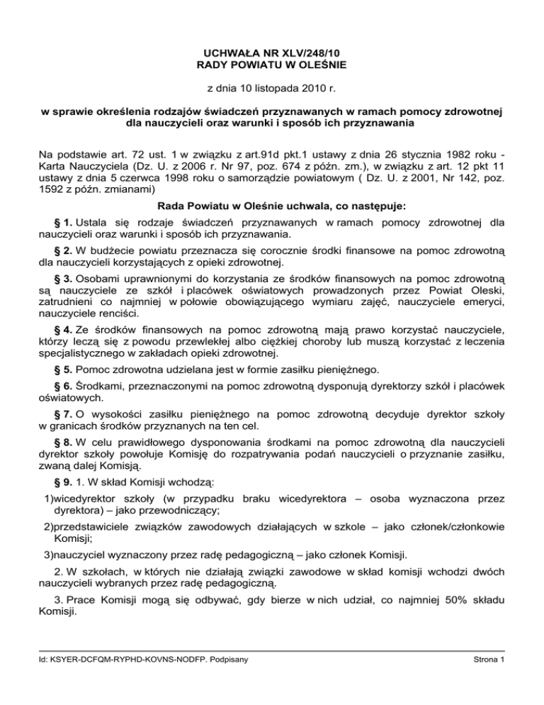 UCHWAŁA NR XLV/248/10 RADY POWIATU W OLEŚNIE z dnia 10 listopada 2010 r. w sprawie określenia rodzajów świadczeń przyznawanych w ramach pomocy zdrowotnej dla nauczycieli oraz warunki i sposób ich przyznawania Na podstawie art. 72 ust. 1 w związku z art.91d pkt.1 ustawy z dnia 26 stycznia 1982 roku Karta Nauczyciela (Dz. U. z 2006 r. Nr 97, poz. 674 z późn. zm.), w związku z art. 12 pkt 11 ustawy z dnia 5 czerwca 1998 roku o samorządzie powiatowym ( Dz. U. z 2001, Nr 142, poz. 1592 z późn. zmianami) Rada Powiatu w Oleśnie uchwala, co następuje: § 1. Ustala się rodzaje świadczeń przyznawanych w ramach pomocy zdrowotnej dla nauczycieli oraz warunki i sposób ich przyznawania. § 2. W budżecie powiatu przeznacza się corocznie środki finansowe na pomoc zdrowotną dla nauczycieli korzystających z opieki zdrowotnej. § 3. Osobami uprawnionymi do korzystania ze środków finansowych na pomoc zdrowotną są nauczyciele ze szkół i placówek oświatowych prowadzonych przez Powiat Oleski, zatrudnieni co najmniej w połowie obowiązującego wymiaru zajęć, nauczyciele emeryci, nauczyciele renciści. § 4. Ze środków finansowych na pomoc zdrowotną mają prawo korzystać nauczyciele, którzy leczą się z powodu przewlekłej albo ciężkiej choroby lub muszą korzystać z leczenia specjalistycznego w zakładach opieki zdrowotnej. § 5. Pomoc zdrowotna udzielana jest w formie zasiłku pieniężnego. § 6. Środkami, przeznaczonymi na pomoc zdrowotną dysponują dyrektorzy szkół i placówek oświatowych. § 7. O wysokości zasiłku pieniężnego na pomoc zdrowotną decyduje dyrektor szkoły w granicach środków przyznanych na ten cel. § 8. W celu prawidłowego dysponowania środkami na pomoc zdrowotną dla nauczycieli dyrektor szkoły powołuje Komisję do rozpatrywania podań nauczycieli o przyznanie zasiłku, zwaną dalej Komisją. § 9. 1. W skład Komisji wchodzą: 1)wicedyrektor szkoły (w przypadku braku wicedyrektora – osoba wyznaczona przez dyrektora) – jako przewodniczący; 2)przedstawiciele związków zawodowych działających w szkole – jako członek/członkowie Komisji; 3)nauczyciel wyznaczony przez radę pedagogiczną – jako członek Komisji. 2. W szkołach, w których nie działają związki zawodowe w skład komisji wchodzi dwóch nauczycieli wybranych przez radę pedagogiczną. 3. Prace Komisji mogą się odbywać, gdy bierze w nich udział, co najmniej 50% składu Komisji. Id: KSYER-DCFQM-RYPHD-KOVNS-NODFP. Podpisany Strona 1 § 10. 1. Podanie o przyznanie zasiłku pieniężnego na pomoc zdrowotną, poparte zaświadczeniem lekarskim, zainteresowani nauczyciele składają do dyrektora szkoły, który przekazuje je do rozpatrzenia Komisji. Do podania nauczyciel załącza oświadczenie o wysokości dochodów (brutto) ze wszystkich źródeł, z trzech miesięcy poprzedzających ubieganie się o zasiłek pieniężny. 2. Nauczyciel emeryt lub rencista, którego jedynym dochodem jest emerytura lub renta, może dołączyć zamiast oświadczenia, o którym mowa w ust. 1, potwierdzoną za zgodność z oryginałem kserokopię aktualnej decyzji o wysokości przyznanej emerytury lub renty. § 11. 1. Przy rozpatrywaniu podań Komisja bierze pod uwagę wysokość poniesionych przez nauczyciela kosztów leczenia oraz całokształt okoliczności wpływających na sytuację materialną, np. choroba przewlekła, konieczność dalszego leczenia w domu, stosowanie specjalnej diety, zapewnienie dodatkowej opieki dla chorego, zakup drogich lekarstw itp. 2. Komisja sporządza i uzasadnia swoją opinię. protokół z posiedzenia, w którym odpowiednio dokumentuje 3. Zaopiniowane podania wraz z protokołem Komisja niezwłocznie przekazuje dyrektorowi szkoły do zatwierdzenia. § 12. Z podaniem o przyznanie zasiłku pieniężnego może wystąpić nauczyciel lub jego opiekun, jeżeli nauczyciel nie jest zdolny osobiście do podejmowania czynności w tym zakresie. § 13. Z inicjatywą o przyznanie zasiłku pieniężnego dla nauczyciela mogą wystąpić również: przedstawiciele związków zawodowych, przedstawiciele rad pedagogicznych lub dyrektor szkoły (placówki). § 14. Pomoc zdrowotna może być udzielana nie częściej niż raz w roku. W wyjątkowych przypadkach dyrektor, po zasięgnięciu opinii Komisji, może postanowić inaczej. § 15. Obsługę finansową środków na pomoc zdrowotną dla nauczycieli prowadzi księgowość szkoły (placówki). § 16. Wykonanie uchwały powierza się Zarządowi Powiatu w Oleśnie. § 17. Uchwała wchodzi w życie po upływie 14 dni od ogłoszenia w Dzienniku Urzędowym Województwa Opolskiego i ma zastosowanie od 1 stycznia 2011 roku. Przewodniczący Rady Antoni Polak Id: KSYER-DCFQM-RYPHD-KOVNS-NODFP. Podpisany Strona 2