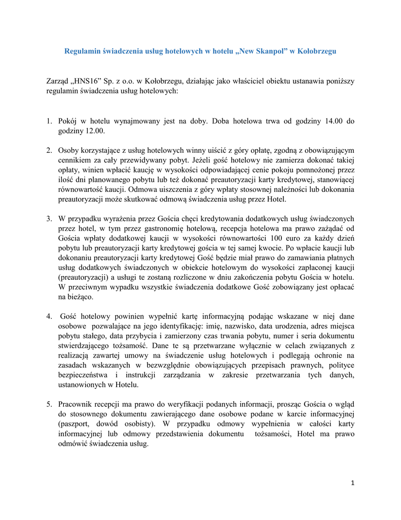 Regulamin świadczenia usług hotelowych w hotelu „New Skanpol” w Kołobrzegu Zarząd „HNS16” Sp. z o.o. w Kołobrzegu, działając jako właściciel obiektu ustanawia poniższy regulamin świadczenia usług hotelowych: 1. Pokój w hotelu wynajmowany jest na doby. Doba hotelowa trwa od godziny 14.00 do godziny 12.00. 2. Osoby korzystające z usług hotelowych winny uiścić z góry opłatę, zgodną z obowiązującym cennikiem za cały przewidywany pobyt. Jeżeli gość hotelowy nie zamierza dokonać takiej opłaty, winien wpłacić kaucję w wysokości odpowiadającej cenie pokoju pomnożonej przez ilość dni planowanego pobytu lub też dokonać preautoryzacji karty kredytowej, stanowiącej równowartość kaucji. Odmowa uiszczenia z góry wpłaty stosownej należności lub dokonania preautoryzacji może skutkować odmową świadczenia usług przez Hotel. 3. W przypadku wyrażenia przez Gościa chęci kredytowania dodatkowych usług świadczonych przez hotel, w tym przez gastronomię hotelową, recepcja hotelowa ma prawo zażądać od Gościa wpłaty dodatkowej kaucji w wysokości równowartości 100 euro za każdy dzień pobytu lub preautoryzacji karty kredytowej gościa w tej samej kwocie. Po wpłacie kaucji lub dokonaniu preautoryzacji karty kredytowej Gość będzie miał prawo do zamawiania płatnych usług dodatkowych świadczonych w obiekcie hotelowym do wysokości zapłaconej kaucji (preautoryzacji) a usługi te zostaną rozliczone w dniu zakończenia pobytu Gościa w hotelu. W przeciwnym wypadku wszystkie świadczenia dodatkowe Gość zobowiązany jest opłacać na bieżąco. 4. Gość hotelowy powinien wypełnić kartę informacyjną podając wskazane w niej dane osobowe pozwalające na jego identyfikację: imię, nazwisko, data urodzenia, adres miejsca pobytu stałego, data przybycia i zamierzony czas trwania pobytu, numer i seria dokumentu stwierdzającego tożsamość. Dane te są przetwarzane wyłącznie w celach związanych z realizacją zawartej umowy na świadczenie usług hotelowych i podlegają ochronie na zasadach wskazanych w bezwzględnie obowiązujących przepisach prawnych, polityce bezpieczeństwa i instrukcji zarządzania w zakresie przetwarzania tych danych, ustanowionych w Hotelu. 5. Pracownik recepcji ma prawo do weryfikacji podanych informacji, prosząc Gościa o wgląd do stosownego dokumentu zawierającego dane osobowe podane w karcie informacyjnej (paszport, dowód osobisty). W przypadku odmowy wypełnienia w całości karty informacyjnej lub odmowy przedstawienia dokumentu tożsamości, Hotel ma prawo odmówić świadczenia usług. 1 6. Wcześniejsze rezerwacje pokoi hotelowych mogą być dokonywane przy pomocy portali internetowych mających w ofercie usługi Hotelu, bezpośrednio w recepcji hotelowej, pisemnie , w tym także przy użyciu poczty elektronicznej kierowanej na adresy dostępne na stronie internetowej Hotelu: www.newskanpol.pl lub telefonicznie, a także za pomocą systemu rezerwacji dostępnego na wyżej wskazanej stronie internetowej. 7. W przypadku rezerwacji dokonywanych za pośrednictwem zewnętrznych portali internetowych, mają zastosowanie zamieszczone na ich stronach zasady i regulaminy dokonywania tych rezerwacji. 8. W przypadku rezerwacji dokonywanych bez pośrednictwa podmiotów trzecich, rezerwację uważa się za dokonaną skutecznie z chwilą potwierdzenia jej przez Hotel i uiszczenia przedpłaty stanowiącej 30% ceny za cały okres rezerwowanej usługi hotelowej. Przedpłata winna zostać dokonana najpóźniej w ciągu 7 dni od dnia otrzymania potwierdzenia rezerwacji, chyba, że wyraźnie zastrzeżono krótszy termin. Po bezskutecznym upływie tego terminu lub wpłacie kwoty niższej niż wskazana, Hotel ma prawo uznać rezerwację za niedokonaną i zwrócić wpłacone środki. 9. Uiszczona w trybie wskazanym powyżej przedpłata, z zastrzeżeniem przepisów poniższych, ulega zaliczeniu na poczet ceny usługi hotelowej. 10. Gość hotelowy ma prawo do bezkosztowej anulacji dokonanej rezerwacji i zwrotu całej przedpłaty, jeżeli oświadczenie w tej mierze złoży na piśmie najpóźniej na 7 dni przed rozpoczęciem pierwszej doby zarezerwowanego pobytu. 11. Jeżeli oświadczenie o anulowaniu rezerwacji, o jakim mowa w punkcie poprzedzającym, zostanie złożone później niż w terminie w nim wskazanym, ale najpóźniej na 48 godzin przed rozpoczęciem pierwszej doby zarezerwowanego pobytu, rezerwacja ulega anulowaniu, a Gość otrzymuje zwrot 50% wpłaconej przedpłaty. 12. W przypadku, gdy Gość anuluje rezerwację później niż na 48 godzin przed rozpoczęciem pierwszej doby zarezerwowanego pobytu, rezerwacja wygasa, a Gościowi nie przysługuje roszczenie o zwrot przedpłaty. 13. Jeżeli Gość, nie składając oświadczenia o anulowaniu rezerwacji, nie zarejestruje się w Hotelu do godziny 18:00 w pierwszej dobie rezerwowanego pobytu, a wartość uiszczonej przedpłaty jest niższa od ceny jednej doby pobytu w pokoju zarezerwowanym przez Gościa, rezerwacja wygasa, a Gościowi nie przysługuje roszczenie o zwrot przedpłaty. 14. Jeżeli Gość, nie składając oświadczenia o anulowaniu rezerwacji, nie zarejestruje się w Hotelu w ciągu pierwszej doby pobytu a wartość uiszczonej przedpłaty jest wyższa od ceny 2 jednej doby pobytu w pokoju zarezerwowanym przez Gościa, rezerwacja wygasa z upływem pierwszej doby, a Gościowi nie przysługuje roszczenie o zwrot przedpłaty. 15. Opiekunem i doradcą naszych Gości jest recepcja hotelowa. 16. Osoby odwiedzające naszych Gości proszone są o opuszczenie pokoi hotelowych przed godziną 22.00. 17. Cisza nocna trwa od godziny 22.00 do godziny 7.00. 18. Gość hotelowy nie może przekazywać pokoju osobom trzecim, nawet jeśli nie upłynęła doba, za którą uiścił należną opłatę za pobyt. 19. Jeśli Gość nie określił czasu pobytu najmując pokój przyjmuje się, że pokój został wynajęty na jedną dobę. Życzenie przedłużenia pobytu poza ok