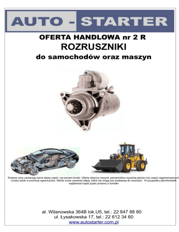 OFERTA HANDLOWA nr 2 R ROZRUSZNIKI do samochodów oraz maszyn Podane ceny zawierają zwrot starej część i są cenami brutto. Oferta dotyczy nowych zamienników wysokiej jakości lub części regenerowanych. Liczba sztuk w promocji ograniczona. Oferta może zawierać błędy, które nie mogą być podstawą do roszczeń. W przypadku jakichkolwiek wątpliwości bądź pytań prosimy o kontakt al. Wilanowska 364B lok.U5, tel.: 22 847 88 80 ul. Łysakowska 17, tel.: 22 612 34 60 www.autostarter.com.pl Firma AUTO-STARTER działa na rynku od ponad 15 lat. Zajmujemy się sprzedażą i regeneracją alternatorów, rozruszników, a także części. Współpracujemy z wieloma autoryzowanymi stacjami obsługi samochodów osobowych, ciężarowych, serwisami maszyn oraz warsztatami elektromechaniki pojazdowej. W stałym asortymencie posiadamy: ● alternatory (nowe i regenerowane), ● rozruszniki (nowe i regenerowane), ● części (nowe i regenerowane) do wszystkich typów samochodów osobowych, ciężarowych, maszyn, wózków widłowych itp. Dysponujemy profesjonalnym sprzętem diagnostycznym, którym możemy w każdej chwili przeprowadzić diagnostykę większości regulatorów i prostowników. Do Państwa dyspozycji pozostaje wyszkolony personel, który zawsze służy fachową poradą oraz doświadczeniem. Dla klientów będących w ciągłej współpracy oferujemy rabaty! al. Wilanowska 364B lok. U5 pon – pt: 9.00 – 17.00 sob: 9.00 – 13.00 tel/fax: 22 847 88 80 kom: 0 501-723-402 [email protected] ul. Łysakowska 17 pon – pt: 9.00 – 17.00 sobota – informacja telefoniczna: 0 510 169 620 tel: 22 612 34 60 [email protected] www.autostarter.com.pl O E R TA S PE C JALNA nr 2 R 12V / 2.30 kW / ilość zębów: 9 Producenci oryginału: Bosch, Iskra Nr oryginalne: 0001223016, 0986019820, 113181, 1183365, 4300006, 1181751, 1182384, 1183404, 11.131.223, AZE4566, IS1073, 11.131.948, AZE6554, 11.131.983, AZE4213, 11.131.860, AZE4187, 11.131.458, AZE6509, 18951, 01223016, 2908534 500 zł BRUTTO B 13181 KDH 12 V / 2.2 kW / ilość zębów: 9 Producenci oryginału: Bosch, Magnetti Marelli Nr oryginalne: 12411287788, 12411288166, 12411289520, 12411466345, 12412242231, 12412242619, 12412242702, 12412242703, 12412244344, 12412446570, 12414371646, 0001218009, 0001218026, 0001218134, 0001218171, BMW 2.4 Diesel 1983-1991, Land Rover 2.5 Diesel 1994-2012, Opel 2.5 TD 1994-1996 CS 378 BMW, Land Rover, Opel 310 zł BRUTTO 12 V / 1.00 kW / ilość zębów: 9, 10 Producenci oryginału: Bosch, Iskra, Valeo Nr oryginalne: 0001112019, 0001112029, 0001112041, 0986013850, 0986013851, 110584, DRS3108, DRS3545, DRS3689, 534054B, 534054C, 11.130.328, 11.130.398, 11.130.529, 11.130.556, 11.130.965, AZE1502, AZE1507, AZE1521, AZE1523, AZE1212, IS0529 Citroen 1.6, 1.4, 1.0, 1.1, 1991-,Peugeot 1.0, 1.1, BRUTTO CS 581 1.4, 1.6 1991-, Citroen, Fiat Fiorino, Peugeot 200 zł 12 V / 1.40 kW / ilość zębów: 10, 11, 12 Citroen, Fiat, Hyundai, Lancia, Peugeot Producenci oryginału: Bosch, Iskra, Mitshubishi, Valeo Nr oryginalne: 0001108183, 0001108400, 0986013240, 0986018310, 111070, DRS3117, DRS3617, DRS8310, 1342792080, 71716562, 71716563, 71716565, 71719600, 71719608, 71719609, 71728811, 71782363, 9625382680, 11.131.232, IS1075, AZE2151, LRS751, M0T20871, M0T80082, M0T86081, M1T30081, M1T80081, M1T80082, M1T80381, M1T80481, 018008, 5802EQ Citroen 1.8, 2.0, 1998-, Fiat 2.0 TD 2003-, Lancia 2.0, 2.2 JTD 2002-, Peugeot 1.9, 2.0, 2.2 1994CS 594 330 zł BRUTTO 12 V / 2.20 kW / ilość zębów: 10 Ford, Mazda Producenci oryginału: Bosch, Iskra, Valeo Nr oryginalne: 0001218105, 0001218128, 0001218728, 0986015090, 112290, DRS3676, DRS3778, DRS5090, 1058429, 1061267, 1073093, 1118336, 1126987, 1229425, 91AB-11000HA, 91AB-11000HB, 91AX-11000HA, 91AX-11000HB, 97BB-11000B3D, 97BB-11000BB, 97BB-11000BC, 97BB-11000BD, 98AB-11000AC, 98AB-11000AD, 98AB-11000AD1, Ford Escort, Fiesta, Focus 1.8 TD Mazda 121 – 1.8 D 1996-2002 CS 613 AUTO-STARTER www.autostarter.com.pl Strona 1 O F E R TA S PE C JALNA nr 2 R 330 zł BRUTTO 12 V / 1.10 kW / ilość zębów: 9, 10 Producenci oryginału: Bosch, Iskra, Valeo Nr oryginalne: 0001107047, 0986016400, 0986016401, 0986018590, 0986018591, 9000082067, 111251, DRS3107, DRS3119, DRS3263, DRS3268, DRS3623, IS9403, 11.139.403, AZD3514, LRS997, LRT194, 943251454, 943251489, M3T42581, 01016401, 7700100647, 7700352049, 7700796488, 7700853827, 7700854955, 7700865719, 7700871057, 7701351390, Renault Clio, Kangoo, Laguna 1.2, 1.4, 1.7, 1.8, 1988-2002, Volvo 460, 480 1.7, 1.8, 2.0 1991-1996 CS 681 Renault, Volvo 165 zł BRUTTO 12 V / 0.8 kW / ilość zębów: 9, 10 Producenci oryginału: Bosch, Magnetti Marelli, Valeo Nr oryginalne: 0001113006, 0001116005, 0986017030, 0986017031, F000AL0319, 111422, DRS3274, DRS3555, 46231531, 46429594, 46518059, 55196400, 77722459, 7772459, 7785449, 7796598, LRS2095, LRS2104, LRS989, LRT198, 63101002, 63102007, 63222838, 63222888, 63222889, 63222890, 63222936, Fiat Brava, Marea, Punto 1.1, 1.2, 1993-2001, Lancia 1.1, 1.2 1995- Fiat, Lancia 300 zł BRUTTO CS 796 12 V / 1.80 kW / ilość zębów: 10 11 Producenci oryginału: Bosch, Iskra Nr oryginalne: 0001124005, 0001124006, 0001125001, 0001125002, 0001125011, 0001125031, 0001125032, 0986016990, 113387, DRS6990, 11.131.056, AZE2625, IS1042, LRT133, 9141.414, 943251225, 01125001, 458041, D7RS131, D7RS31, 02B9110230, 02B911023D, Seat 1.9 TD, D, 1993-1999 VW Caravelle, Eurovan, Multivan, Transporter, 1.9, 2.4, 2.5, 2.8 1995CS 801 Seat, VW Chavrolet, Daewoo, Isuzu, Opel 12 V / 1.10 kW / ilość zębów: 9 Producenci oryginału: Bosch, Iskra, Valeo Nr oryginalne: 0001107034, 0001107045, 0001107056, 0001107100, 0001107101, 0986016880, 0986017920, B001110097, F005M00001, F005M00004, 0001107108, 111848, 96430345, 96208785, 96450663, DRS6880, DRS7920, 11.131.010, AZE2113, IS1024, 8920641810, 17770, 6724, LRS2084, LRT107, LRT190, 943251334 Chavrolet Lacetti 1.8 2004-, Opel 1.8, 2.0, 2.2 1994-, Vauxhall 1.6, 1.8, 2.0, 2.2, 2.4 1993CS 87