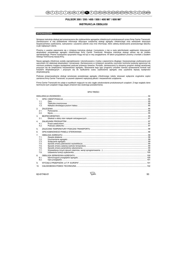 PULSOR 300 / 350 / 400 / 500 / 400 Mt° / 600 Mt° INSTRUKCJA OBSŁUGI WPROWADZENIE Niniejsza instrukcja obsługi jest przeznaczona dla użytkowników agregatów chłodniczych produkowanych przez firmę Carrier Transicold. Zamieszczono w niej podstawowe informacje dotyczące codziennej obsługi agregatu chłodniczego oraz wskazówki dotyczące bezpieczeństwa użytkowania, wykrywania i usuwania usterek oraz inne informacje, które ułatwią dostarczanie przewożonego ładunku w jak najlepszym stanie. Prosimy o uważne zapoznanie się z niniejszą instrukcją obsługi i korzystanie z niej w razie jakichkolwiek wątpliwości dotyczących eksploatacji posiadanego agregatu chłodniczego firmy Carrier Transicold. Niniejsza instrukcja obsługi odnosi się do modelu standardowego. Pewne rozwiązanie opcjonalne mogą nie być w niej uwzględnione. W takich przypadkach prosimy o kontakt z Działem Obsługi Technicznej naszej firmy. Nasze agregaty chłodnicze zostały zaprojektowane i skonstruowane z myślą o zapewnieniu długiego i bezawaryjnego użytkowania pod warunkiem ich właściwej eksploatacji i konserwacji. Zamieszczone w niniejszym poradniku czynności kontrolne pozwolą ograniczyć do minimum problemy mogące występować podczas przewozu towarów. Ponadto, zamieszczony tu obszerny program obsługi serwisowej przyczyni się do zwiększenia niezawodności agregatu. Stosowanie tego typu programu umożliwi również sprawowanie kontroli nad kosztami eksploatacyjnym i przyczyni się do wydłużenia czasu użytkowania agregatu oraz uzyskania lepszej wydajności eksploatacyjnej. Podczas przeprowadzania obsługi serwisowej posiadanego agregatu chłodniczego należy stosować wyłącznie oryginalne części zamienne firmy Carrier Transicold, co pozwoli zapewnić najwyższą jakość i niezawodność urządzenia. Firma Carrier Transicold nie ustaje w wysiłkach mających na celu ciągłe udoskonalanie produkowanych urządzeń. Z tego względu dane techniczne tych urządzeń mogą ulegać zmianom bez osobnego powiadomienia. SPIS TREŚCI 2. ZALECENIA .................................................................................................................................................................................... 95 2.1. Parkowanie........................................................................................................................................................................... 95 2.2. Mycie .................................................................................................................................................................................... 95 3. BEZPIECZEŃSTWO ....................................................................................................................................................................... 95 3.1. Dbałość o dobry stan nalepek ostrzegawczych .................................................................................................................... 97 4. ZAŁADUNEK PRODUKTÓW .......................................................................................................................................................... 97 4.1. Przed załadunkiem ............................................................................................................................................................... 97 4.2. Podczas załadunku .............................................................................................................................................................. 97 5. ZALECANE TEMPERATURY PODCZAS TRANSPORTU ............................................................................................................. 98 6. OPIS KABINOWEGO PANELU STEROWANIA ............................................................................................................................. 98 7. OBSŁUGA AGREGATU .................................................................................................................................................................. 98 7.1. Zasada działania .................................................................................................................................................................. 98 7.2. Uruchamianie agregatu ........................................................................................................................................................ 99 7.3. Wyłączanie agregatu ............................................................................................................................................................ 99 7.4. Sposób zmiany jaskrawości wyświetlacza............................................................................................................................ 99 7.5. Sposób zmiany zadanej wartości temperatury ..................................................................................................................... 99 7.6. Sposób zmiany parametrów odszraniania ............................................................................................................................ 99 7.7. Wyświetlanie innych danych (alarmów, wersji oprogramowania…) ..................................................................................... 99 7.8. Ustawienie funkcji użytkownika .......................................................................................................................................... 100 8. OBSŁUGA SERWISOWA AGREGATU ........................................................................................................................................ 100 8.1. Harmonogram przeglądów agregatu .................................................................................................................................. 100 8.2. Opis przeglądów..............................................................................................................................................