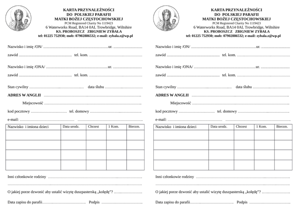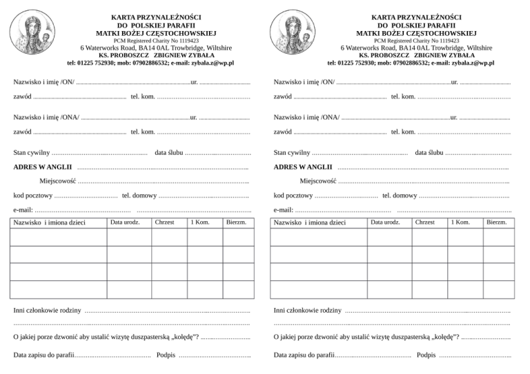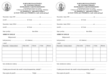 KARTA PRZYNALEŻNOŚCI DO POLSKIEJ PARAFII MATKI BOŻEJ CZĘSTOCHOWSKIEJ KARTA PRZYNALEŻNOŚCI DO POLSKIEJ PARAFII MATKI BOŻEJ CZĘSTOCHOWSKIEJ PCM Registered Charity No 1119423 PCM Registered Charity No 1119423 6 Waterworks Road, BA14 0AL Trowbridge, Wiltshire 6 Waterworks Road, BA14 0AL Trowbridge, Wiltshire KS. PROBOSZCZ ZBIGNIEW ZYBAŁA tel: 01225 752930; mob: 07902886532; e-mail: [email protected] KS. PROBOSZCZ ZBIGNIEW ZYBAŁA tel: 01225 752930; mob: 07902886532; e-mail: [email protected] Nazwisko i imię /ON/ ................................................................................. ur. .................................... Nazwisko i imię /ON/ ................................................................................. ur. .................................... zawód .................................................................. tel. kom. …….…………………….……………… zawód .................................................................. tel. kom. …….…………………….……………… Nazwisko i imię /ONA/ .............................................................................ur. .................................... Nazwisko i imię /ONA/ .............................................................................ur. .................................... zawód .................................................................. tel. kom. …….…………………….……………… zawód .................................................................. tel. kom. …….…………………….……………… Stan cywilny ………………………...……………….… Stan cywilny ………………………...……………….… data ślubu ……………..….…………… data ślubu ……………..….…………… ADRES W ANGLII ….………………………………..………………………………………….. ADRES W ANGLII ….………………………………..………………………………………….. Miejscowość ….………………………………..………………………………………….. Miejscowość ….………………………………..………………………………………….. kod pocztowy …………………….……… tel. domowy ………………………...………………. kod pocztowy …………………….……… tel. domowy ………………………...………………. e-mail: …………………………………………… ……………………………………………………. e-mail: …………………………………………… ……………………………………………………. Nazwisko i imiona dzieci Data urodz. Chrzest 1 Kom. Bierzm. Nazwisko i imiona dzieci Data urodz. Chrzest 1 Kom. Bierzm. Inni członkowie rodziny ………………………………………………………...……….…………. Inni członkowie rodziny ………………………………………………………...……….…………. …………………………………..……………………………………………………...……….…………. …………………………………..……………………………………………………...……….…………. O jakiej porze dzwonić aby ustalić wizytę duszpasterską „kolędę”? ..…...……………….. O jakiej porze dzwonić aby ustalić wizytę duszpasterską „kolędę”? ..…...……………….. Data zapisu do parafii……….…………………………. Podpis ………….…………………….. Data zapisu do parafii……….…………………………. Podpis ………….……………………..