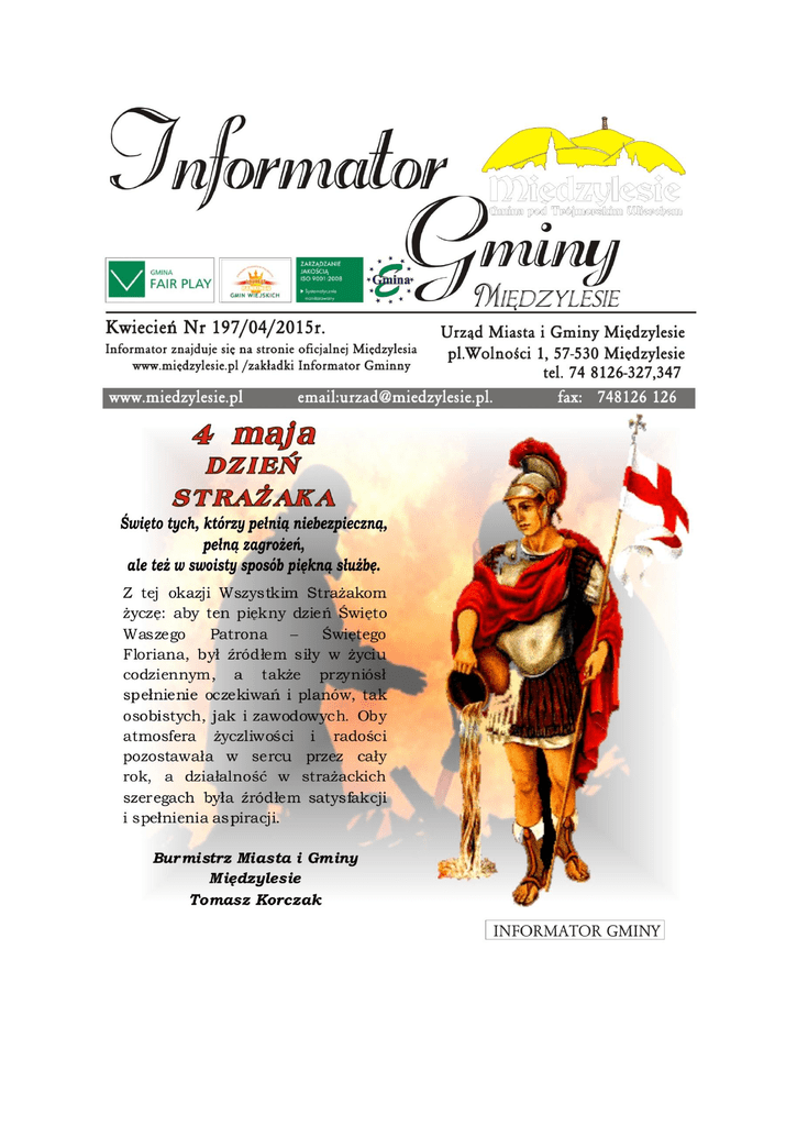 ROZMOWA Z ANNĄ KRONENBERGER KIEROWNICZKĄ OŚRODKA POMOCY SPOŁECZNEJ W MIĘDZYLESIU Jak wiemy od dnia 13 kwietnia 2015r. siedziba ośrodka została przeniesiona do budynku dworca PKP w Międzylesiu, czym pokierowana była ta decyzja ? Siedziba ośrodka wcześniej mieściła się w zabytkowym „Domku Tkaczy” w Międzylesiu. Pomieszczenia tam były niskie, ciemne i nie dawały możliwości podjęcia niektórych działań w celu usprawnienia pracy ośrodka. Aby poprawić warunki pracy pracowników, a także możliwości obsługi klientów – dzięki pomocy burmistrza i po długich negocjacjach z zarządem budynków kolejowych – udało nam się podpisać umowę na wynajem pomieszczeń w budynku dworca PKP. Wynegocjowane przez burmistrza warunki wynajmu są na tyle korzystne, że koszty utrzymania ośrodka pozostaną na dotychczasowym poziomie. Co zmieni się w pracy ośrodka w związku z powyższymi zmianami ? Największą zmianą dla mieszkańców jest sama zmiana usytuowania ośrodka, ale dla nas najistotniejszą zmianą jest przeniesienie wypłaty świadczeń pieniężnych z Urzędu Pocztowego w Międzylesiu do kasy ośrodka, ponieważ pomieszczenia tu są dostosowane do obsługi kasowej. I w tym miejscu chciałabym wszystkim korzystającym z pomocy finansowej ośrodka przypomnieć, że od miesiąca kwietnia świadczenia będą wypłacane w nowej siedzibie ośrodka w dniach 16-17 oraz 21-22 dnia miesiąca w godzinach od 10.00 do 14.30. Jednocześnie pragnę poinformować, że zmianie ulega również numeru telefonu na 74 814 87 64. Zmiana siedziby wiąże się z koniecznością zaangażowania pewnych sił fizycznych, jak pani sobie z tym poradziła wiedząc, że w ośrodku nie ma zatrudnionych mężczyzn ? Moja załoga – same kobiety – wykazały się nie lada siłą. A tak poważnie jesteśmy bardzo wdzięczne osobom, które nam pomagały przy przeprowadzce. Pomieszczenia malowały nam i sprzątały osoby korzystające z pomocy społecznej w ramach wolontariatu. Meble i sprzęty pomagały nieodpłatnie przewozić osoby prywatne a w noszeniu pomagali również korzystający z pomocy oraz pracownicy skierowani do prac interwencyjnych do UMiG oraz ZGKiM. Tu dziękujemy wszystkim za okazaną pomoc i współpracę pomiędzy instytucjami. Jak na dzień dzisiejszy wygląda liczba osób korzystających z pomocy, czy zauważa się tendencję wzrostową czy malejącą ? Liczba osób korzystających ze świadczeń pomocy społecznej w stosunku do lat ubiegłych spada. Jest to uwarunkowane tym, że wiele osób podjęło pracę zarobkową w przygranicznych miejscowościach w Czechach, ale i w ramach prac społecznie użytecznych czy prac interwencyjnych organizowanych przez UMiG w Międzylesiu i ZGKiM w Międzylesiu. Mamy też nadzieję, że kilkadziesiąt osób z terenu naszej gminy znajdzie zatrudnienie w nowobudowanym zakładzie w Międzylesiu. Cieszy nas fakt, że osoby do tej pory korzystające z systemu pomocy społecznej „uwalniają się” od niej, ponieważ ośrodek nie ma na celu stałego utrzymywania rodzin w ich trudnej sytuacji. Nie jesteśmy też w stanie zaspokoić wszystkich potrzeb finansowych zgłaszających się osób, ponieważ obowiązują nas przepisy wielu ustaw oraz kryterium dochodowe, które ogranicza możliwości udzielania pomocy. Ośrodek ma jedynie wspomagać osoby czy rodziny w przezwyciężaniu trudnych sytuacji życiowych, których nie są one w stanie pokonać, wykorzystując własne uprawnienia, zasoby i możliwości. Jak w roku bieżącym wygląda pozyskiwanie środków zewnętrznych na działania OPS i jakie działania są planowane ? W roku bieżącym nie będziemy realizować z pewnością projektu systemowego współfinansowanego z Unii Europejskiej, który był w roku ubiegłym, ponieważ na ten rok nie są one przewidziane, być może ruszy nabór wniosków pod koniec roku, a wówczas złożymy wniosek o dofinansowanie. Obecnie złożyliśmy do Wojewody Dolnośląskiego wniosek dotyczący zapotrzebowania na „Program asystent rodziny i koordynator rodzinnej pieczy zastępczej na rok 2015”. Gmina od stycznia tego roku ma obowiązek zatrudniać asystenta rodziny i obecnie mamy już zatrudnionego asystenta rodziny, na razie na pół etatu. Pracuje on z pięcioma rodzinami, co do których pracownicy socjalni wystąpili o przydzielenie asystenta. Jeśli uda nam się pozyskać dofinansowanie wówczas obejmiemy tą formą pomocy większą liczbę rodzin. Został złożony również wniosek o dofinansowanie projektu w ramach Programu Osłonowego „Wspieranie jednostek samorządu terytorialnego w tworzeniu systemu przeciwdziałania przemocy w rodzinie”, przy czym jest to projekt konkursowy i trzeba spełnić szereg wymogów, aby pozyskać środki. Oczywiście w grudniu planujemy kolejną „Paczkę dla najmłodszych” oraz „Wigilię dla samotnych” we współpracy z kilkoma instytucjami działającymi na terenie gminy. Na koniec może kilka słów od siebie… Jeszcze raz dziękuję wszystkim za pomoc przy przeniesieniu siedziby ośrodka. Mam też nadzieję, że dzięki zmianie wizerunku biur ośrodka zmieni się również postrzeganie przez mieszkańców samych pracowników ośrodka, że nie jesteśmy po to, aby szkodzić, ale pomagać. Dziękuje W dniu 18.04.2015r. zmarła Pani Irena Zielińska, wieloletni pracownik oświaty - nauczyciel, dyrektor oraz inspektor w gminie Międzylesie. Pogrzeb odbędzie się 23.04.2015r. o godz. 12.00 w Dolicach koło Stargardu Strzecińskiego. Wyraz głębokiego współczucia dla najbliższych składają Burmistrz Miasta i Gminy Międzylesie Tomasz Korczak i dyrektor Zespołu Szkół w Międzylesiu RyszardWBodnar dniu 18.04.2015r. zmarła Pani Irena Zielińska, wieloletni pracownik oświaty - nauczyciel, dyrektor oraz inspektor w gminie Międzylesie. Uhonorowana Medalem „ZASŁUŻONY DLA MIASTA I GMINY MIĘDZYLESIE” Pogrzeb odbędzie się 23.04.2015r. o godz. 12.00 w Dolicach koło Stargardu Szczecińskiego