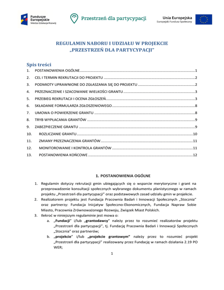 REGULAMIN NABORU I UDZIAŁU W PROJEKCIE „PRZESTRZEŃ DLA PARTYCYPACJI” Spis treści 1. POSTANOWIENIA OGÓLNE...............................................................................................................1 2. CEL I TERMIN REKRUTACJI DO PROJEKTU ........................................................................................2 3. PODMIOTY UPRAWNIONE DO ZGŁASZANIA SIĘ DO PROJEKTU .......................................................2 4. PRZEZNACZENIE I SZACOWANIE WIELKOŚCI GRANTU .....................................................................3 5. PRZEBIEG REKRUTACJI I OCENA ZGŁOSZEŃ......................................................................................3 6. SKŁADANIE FORMULARZA ZGŁOSZENIOWEGO ................................................................................8 7. UMOWA O POWIERZENIE GRANTU .................................................................................................8 8. TRYB WYPŁACANIA GRANTÓW ........................................................................................................9 9. ZABEZPIECZENIE GRANTU ................................................................................................................9 10. ROZLICZANIE GRANTU ................................................................................................................10 11. ZMIANY PRZEZNACZENIA GRANTÓW .........................................................................................11 12. MONITOROWANIE I KONTROLA GRANTÓW ..............................................................................11 13. POSTANOWIENIA KOŃCOWE .....................................................................................................12 1. POSTANOWIENIA OGÓLNE 1. Regulamin dotyczy rekrutacji gmin ubiegających się o wsparcie merytoryczne i grant na przeprowadzenie konsultacji społecznych wybranego dokumentu planistycznego w ramach projektu „Przestrzeń dla partycypacji” oraz podstawowych zasad udziału gmin w projekcie. 2. Realizatorem projektu jest Fundacja Pracownia Badań i Innowacji Społecznych „Stocznia” oraz partnerzy: Fundacja Inicjatyw Społeczno-Ekonomicznych, Fundacja Napraw Sobie Miasto, Pracownia Zrównoważonego Rozwoju, Związek Miast Polskich. 3. Ilekroć w niniejszym regulaminie jest mowa o: a. „Fundacji” i/lub „grantodawcy” należy przez to rozumieć realizatorów projektu „Przestrzeń dla partycypacji”, tj. Fundację Pracownia Badań i Innowacji Społecznych „Stocznia” oraz partnerów; b. „projekcie” i/lub „projekcie grantowym” należy przez to rozumieć projekt „Przestrzeń dla partycypacji” realizowany przez Fundację w ramach działania 2.19 PO WER; 1 c. „grantobiorcy” należy przez to rozumieć gminę, która ubiega się o wsparcie merytoryczne i grant na realizację procesu konsultacji w ramach projektu „Przestrzeń dla partycypacji”, a w przypadku pomyślnego przejścia przez proces rekrutacji – realizuje konsultacje społeczne wybranego dokumentu planistycznego; d. „dokumencie planistycznym”, należy przez to rozumieć: 1. studium uwarunkowań i kierunków zagospodarowania przestrzennego gminy oraz 2. miejscowy plan zagospodarowania przestrzennego, w tym także miejscowy plan rewitalizacji; e. „Indywidualnym Planie Konsultacji” i/lub „IPK” należy przez to rozumieć dokument, określający zakres planowanych konsultacji, wypracowywany we współpracy z grantodawcą i stanowiący podstawę realizowanego procesu; f. „konsultacjach społecznych”, należy przez to rozumieć konsultacje społeczne wybranego przez gminę dokumentu planistycznego; g. „zespole wspierającym” i/lub „zespole”, należy przez to rozumieć eksperta ds. planowania przestrzennego oraz eksperta ds. konsultacji społecznych, którzy wspierają gminę merytorycznie w prowadzeniu konsultacji; h. „stronie projektu”, należy przez to rozumieć stronę zawierającą informacje na temat projektu „Przestrzeń dla partycypacji”, znajdującą się pod adresem: http://partycypacjaobywatelska.pl/przestrzen; i. „Ustawie”, należy przez to rozumieć ustawę z dn. 27 marca 2003 r. o planowaniu i zagospodarowaniu przestrzennym; j. „Instytucji Zarządzającej”, należy przez to rozumieć Ministerstwo Rozwoju będące operatorem działania 2.19 PO WER. 2. CEL I TERMIN REKRUTACJI DO PROJEKTU 1. Celem rekrutacji jest wyłonienie gmin, które najpierw otrzymają wsparcie merytoryczne na etapie przygotowania i zaplanowania procesu konsultacji społecznych, a następnie powierzony im zostanie grant na przeprowadzenie ww. konsultacji społecznych. 2. Grantobiorcy zostaną wyłonieni w sposób przejrzysty, w drodze otwartego naboru, z zachowaniem zasady bezstronności. 3. Rekrutacja przeprowadzana jest w terminie od 1 do 30 września 2016 roku. 4. Grantodawca, w uzasadnionych przypadkach, może przedłużyć termin naboru. Informacje o ewentualnym przedłużeniu naboru są publikowane na stronie projektu. 5. Po zakończeniu naboru, o którym mowa w pkt. 3, grantodawca przewiduje prowadzenie naboru w trybie ciągłym, a także kolejnego naboru na początku 2017 roku. Informacje na ten temat będą zamieszczone na stronie projektu. 3. PODMIOTY UPRAWNIONE DO ZGŁASZANIA SIĘ DO PROJEKTU 1. W ramach rekrutacji zostanie wyłonionych do 13 gmin spełniających warunki udziału 2 w projekcie, o których mowa w rozdz. 3 i 5. 2. Do udziału w projekcie mogą się zgłosić gminy z terenu całej Polski. 3. Do udziału w projekcie mogą się zgłosić: a) gminy wiejskie, b) gminy miejskie, c) gminy miejsko-wiejskie. 4. PRZEZNACZENIE I SZACOWANIE WIELKOŚCI GRANTU 1. Granty przyznawane w ramach projektu mogą być przeznaczone wyłącznie na realizację procesu konsultacji społecznych dokumentów planistycznych, tj. na realizację I oraz II etapu konsultacji dokumentu planistycznego. I etap konsultacji obejmuje okres pomiędzy przyjęciem przez gminę uch