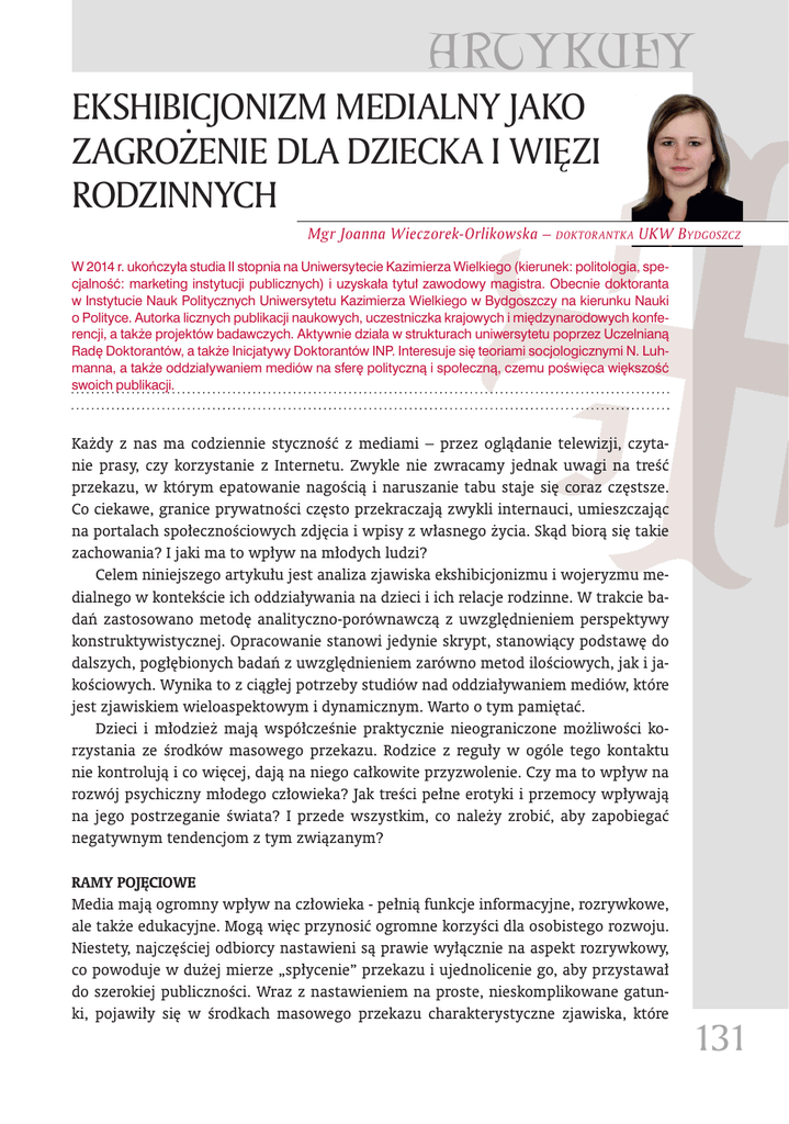 ARTYKUŁY EKSHIBICJONIZM MEDIALNY JAKO ZAGROŻENIE DLA DZIECKA I WIĘZI RODZINNYCH Mgr Joanna Wieczorek-Orlikowska – doktorantk a UKW B ydgoszcz W 2014 r. ukończyła studia II stopnia na Uniwersytecie Kazimierza Wielkiego (kierunek: politologia, specjalność: marketing instytucji publicznych) i uzyskała tytuł zawodowy magistra. Obecnie doktoranta w Instytucie Nauk Politycznych Uniwersytetu Kazimierza Wielkiego w Bydgoszczy na kierunku Nauki o Polityce. Autorka licznych publikacji naukowych, uczestniczka krajowych i międzynarodowych konferencji, a także projektów badawczych. Aktywnie działa w strukturach uniwersytetu poprzez Uczelnianą Radę Doktorantów, a także Inicjatywy Doktorantów INP. Interesuje się teoriami socjologicznymi N. Luhmanna, a także oddziaływaniem mediów na sferę polityczną i społeczną, czemu poświęca większość swoich publikacji. Każdy z nas ma codziennie styczność z mediami – przez oglądanie telewizji, czytanie prasy, czy korzystanie z Internetu. Zwykle nie zwracamy jednak uwagi na treść przekazu, w którym epatowanie nagością i naruszanie tabu staje się coraz częstsze. Co ciekawe, granice prywatności często przekraczają zwykli internauci, umieszczając na portalach społecznościowych zdjęcia i wpisy z własnego życia. Skąd biorą się takie zachowania? I jaki ma to wpływ na młodych ludzi? Celem niniejszego artykułu jest analiza zjawiska ekshibicjonizmu i wojeryzmu medialnego w kontekście ich oddziaływania na dzieci i ich relacje rodzinne. W trakcie badań zastosowano metodę analityczno-porównawczą z uwzględnieniem perspektywy konstruktywistycznej. Opracowanie stanowi jedynie skrypt, stanowiący podstawę do dalszych, pogłębionych badań z uwzględnieniem zarówno metod ilościowych, jak i jakościowych. Wynika to z ciągłej potrzeby studiów nad oddziaływaniem mediów, które jest zjawiskiem wieloaspektowym i dynamicznym. Warto o tym pamiętać. Dzieci i młodzież mają współcześnie praktycznie nieograniczone możliwości korzystania ze środków masowego przekazu. Rodzice z reguły w ogóle tego kontaktu nie kontrolują i co więcej, dają na niego całkowite przyzwolenie. Czy ma to wpływ na rozwój psychiczny młodego człowieka? Jak treści pełne erotyki i przemocy wpływają na jego postrzeganie świata? I przede wszystkim, co należy zrobić, aby zapobiegać negatywnym tendencjom z tym związanym? RAMY POJĘCIOWE Media mają ogromny wpływ na człowieka - pełnią funkcje informacyjne, rozrywkowe, ale także edukacyjne. Mogą więc przynosić ogromne korzyści dla osobistego rozwoju. Niestety, najczęściej odbiorcy nastawieni są prawie wyłącznie na aspekt rozrywkowy, co powoduje w dużej mierze „spłycenie” przekazu i ujednolicenie go, aby przystawał do szerokiej publiczności. Wraz z nastawieniem na proste, nieskomplikowane gatunki, pojawiły się w środkach masowego przekazu charakterystyczne zjawiska, które 131 ARTICLES w krótkim czasie całkowicie je zdominowały: ekshibicjonizm i wojeryzm medialny. Ich oddziaływanie na masy doprowadziło do powstania swoistej kultury obrazu, nastawionej na wszystko to, co bawi i szokuje. Należy więc bliżej przyjrzeć się tym pojęciom, aby określić skalę ich wpływu na najmłodszych odbiorców, a także ich relacje z rodziną. Ekshibicjonizm medialny to zjawisko trudne do zdefiniowania. Jest to specyficzne zachowanie, polegające na upublicznianiu nagości, bądź elementów prywatnego życia, aby zdobyć popularność. Coraz większe zainteresowanie ze strony masowej publiczności spowodowało pojawienie się takich gatunków, jak reality show, czy talk show, a także seriali paradokumentalnych. Gwałtowny rozwój kultury konsumpcyjnej doprowadził do sytuacji, w której dla zdobycia odbiorców należy pokazać to, co dawniej było skrywane1. Należy przy tym jednocześnie pamiętać, że osoby występujące w mediach obnażają się nie tylko w sensie fizycznym, ale także psychicznym. Odmianą tego pojęcia jest ekskribicjonizm, czyli zjawisko tworzenia i prowadzenia blogów w sieci, pełniących funkcję pamiętnika2. Dlaczego niektóre osoby chcą być pokazywane w mediach? Kieruje nimi przede wszystkim potrzeba sukcesu i chęć bycia sławnym. Media dają możliwość szybkiej kariery, wyrwania się z anonimowości. Intymne cechy życia stały się atrakcyjnym towarem, w wyniku chęci oglądania autentycznych rzeczy3. Człowiek pragnie w mediach znaleźć własne potrzeby i zainteresowania, móc się z nimi identyfikować. Natura narcystyczna powoduje u niektórych chęć eksponowania siebie w mediach, zapewnienia popularności. Istnieje więc ścisły związek między widzem, a osobą oglądaną4. Z ekshibicjonizmem medialnym ściśle związane jest zjawisko wojeryzmu (tzw. podglądactwo), które dotyczy praktycznie każdego widza, czy czytelnika prasy. Jego istotą jest obserwacja rzeczywistości kreowanej przez media i wzmacnianie relacji z odbiorcą, który ma poczucie kontroli przedstawianych zdarzeń5. W polskiej nauce niestety niewielu badaczy podejmuje kwestię wojeryzmu, co powoduje znaczne trudności w jego zdefiniowaniu. Warto jednak zauważyć, że termin ten wywodzi się z psychoanalityki, na oznaczenie formy zaspokojenia seksualnego, poprzez podglądanie nagich osób6. Już Zygmunt Freud podkreślał, że człowiek ma naturalną skłonność do obserwacji innych (z ukrycia), a wynika to z jego rozwoju psychicznego. Nic więc dziwnego, że próbuje zaspokoić tę potrzebę poprzez media. W Encyklopedii kina pod redakcją T. Lubelskiego występuje bardzo ciekawe stwierdzenie, że: teoretycy filmowej szkoły psychoanalitycznej rozpoznają podstawowy mechanizm percepcji filmowej, jako voyeurystyczny, nadając tym samym erotyczny charakter przyjemnościom płynącym z oglądania filmu. Widz filmowy – voyeur jest anonimową postacią, ukrytą w ciemności i może być bezkarnym 1 2 3 4 5 6 132 M. Krzpiet, Fenomen ekshibicjonizm