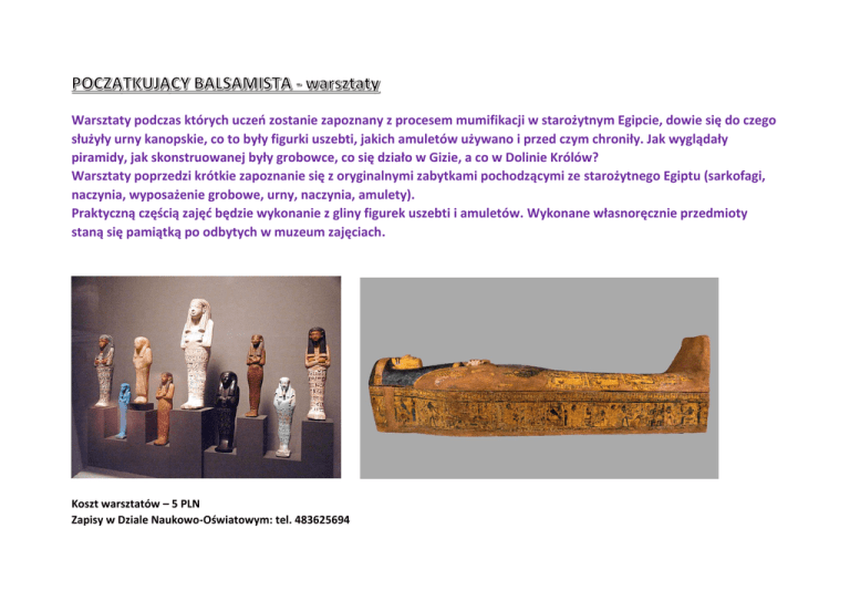 Warsztaty podczas których uczeń zostanie zapoznany z procesem mumifikacji w starożytnym Egipcie, dowie się do czego służyły urny kanopskie, co to były figurki uszebti, jakich amuletów używano i przed czym chroniły. Jak wyglądały piramidy, jak skonstruowanej były grobowce, co się działo w Gizie, a co w Dolinie Królów? Warsztaty poprzedzi krótkie zapoznanie się z oryginalnymi zabytkami pochodzącymi ze starożytnego Egiptu (sarkofagi, naczynia, wyposażenie grobowe, urny, naczynia, amulety). Praktyczną częścią zajęć będzie wykonanie z gliny figurek uszebti i amuletów. Wykonane własnoręcznie przedmioty staną się pamiątką po odbytych w muzeum zajęciach. Koszt warsztatów – 5 PLN Zapisy w Dziale Naukowo-Oświatowym: tel. 483625694