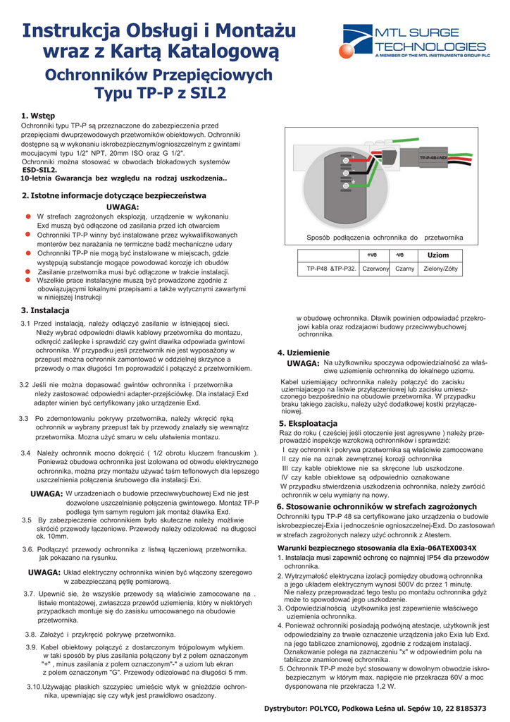 Instrukcja Obsługi i Montażu wraz z Kartą Katalogową Ochronników Przepięciowych Typu TP-P z SIL2 1. Wstęp Ochronniki typu TP-P są przeznaczone do zabezpieczenia przed przepięciami dwuprzewodowych przetworników obiektowych. Ochronniki dostępne są w wykonaniu iskrobezpiecznym/ognioszczelnym z gwintami mocujacymi typu 1/2" NPT, 20mm ISO oraz G 1/2". Ochronniki można stosować w obwodach blokadowych systemów ESD-SIL2. 10-letnia Gwarancja bez względu na rodzaj uszkodzenia.. 2. Istotne informacje dotyczące bezpieczeństwa UWAGA: O O O O O W strefach zagrożonych eksplozją, urządzenie w wykonaniu Exd muszą być odłączone od zasilania przed ich otwarciem Ochronniki TP-P winny być instalowane przez wykwalifikowanych monterów bez narażania ne termiczne badź mechaniczne udary Ochronniki TP-P nie mogą być instalowane w miejscach, gdzie występują substancje mogące powodować korozję ich obudów Zasilanie przetwornika musi być odłączone w trakcie instalacji. Wszelkie prace instalacyjne muszą być prowadzone zgodnie z obowiązującymi lokalnymi przepisami a także wytycznymi zawartymi w niniejszej Instrukcji Sposób podłączenia ochronnika do przetwornika +ve -ve Uziom TP-P48& &TP-P32. Czarny óZ Zielony/Zółty TP-P48 TP-P32 Czerwony Czarny 3. Instalacja 3.1 Przed instalacją, należy odłączyć zasilanie w istniejącej sieci. Nleży wybrać odpowiedni dławik kablowy przetwornika do montazu, odkręcić zaślepke i sprawdzić czy gwint dławika odpowiada gwintowi ochronnika. W przypadku jesli przetwornik nie jest wyposażony w przepust można ochronnik zamontować w oddzielnej skrzynce a przewody o max długości 1m poprowadzić i połączyć z przetwornikiem. 3.2 Jeśli nie można dopasować gwintów ochronnika i przetwornika nleży zastosować odpowiedni adapter-przejściówkę. Dla instalacji Exd adapter winien być certyfikowany jako urządzenie Exd. 3.3 Po zdemontowaniu pokrywy przetwornika, należy wkręcić ręką ochronnik w wybrany przepust tak by przewody znalazły się wewnątrz przetwornika. Mozna użyć smaru w celu ułatwienia montazu. 3.4 Należy ochronnik mocno dokręcić ( 1/2 obrotu kluczem francuskim ). Ponieważ obudowa ochronnika jest izolowana od obwodu elektrycznego ochronnika, można przy montażu używać taśm teflonowych dla lepszego uszczelnienia połączenia śrubowego dla instalacji Exi. UWAGA: W urzadzeniach o budowie przeciwwybuchowej Exd nie jest w obudowę ochronnika. Dławik powinien odpowiadać przekrojowi kabla oraz rodzajaowi budowy przeciwwybuchowej ochronnika. 4. Uziemienie UWAGA: Na użytkowniku spoczywa odpowiedzialność za właściwe uziemienie ochronnika do lokalnego uziomu. Kabel uziemiający ochronnika należy połączyć do zacisku uziemiajacego na listwie przyłączeniowej lub zacisku umieszczonego bezpośrednio na obudowie przetwornika. W przypadku braku takiego zacisku, należy użyć dodatkowej kostki przyłączeniowej. 5. Eksploatacja Raz do roku ( cześciej jeśli otoczenie jest agresywne ) należy przeprowadzić inspekcje wzrokową ochronników i sprawdzić: I czy ochronnik i pokrywa przetwornika są właściwie zamocowane II czy nie na oznak zewnętrznej korozji ochronnika III czy kable obiektowe nie sa skręcone lub uszkodzone. IV czy kable obiektowe są odpowiednio oznakowane W przypadku stwierdzenia uszkodzenia ochronnika, należy zwrócić ochronnik w celu wymiany na nowy. dozwolone uszczelnianie połączenia gwintowego. Montaż TP-P podlega tym samym regułom jak montaż dławika Exd. 3.5 By zabezpieczenie ochronnikiem było skuteczne należy możliwie skrócić przewody łączeniowe. Przewody należy odizolować na długosci ok. 10mm. 6. Stosowanie ochronników w strefach zagrożonych 3.6. Podłączyć przewody ochronnika z listwą łączeniową przetwornika. jak pokazano na rysunku. Warunki bezpiecznego stosowania dla Exia-06ATEX0034X 1. Instalacja musi zapewnić ochronę co najmniej IP54 dla przewodów ochronnika. 2. Wytrzymałość elektryczna izolacji pomiędzy obudową ochronnika a jego układem elektrycznym wynosi 500V dc przez 1 minutę. Nie nalezy przeprowadzać tego testu po montażu ochronnika gdyż może to spowodować jego uszkodzenie. 3. Odpowiedzialnością użytkownika jest zapewnienie właściwego uziemienia ochronnika. 4. Ponieważ ochronniki posiadają podwójną atestacje, użytkownik jest odpowiedzialny za trwałe oznaczenie urządzenia jako Exia lub Exd. na jego tabliczce znamionowej, zgodnie z rodzajem instalacji. Oznakowanie polega na zaznaczeniu "x" w odpowiednim polu na tabliczce znamionowej ochronnika. 5. Ochronnik TP-P może być stosowany w dowolnym obwodzie iskrobezpiecznym w którym max. napięcie nie przekracza 60V a moc dysponowana nie przekracza 1,2 W. UWAGA: Układ elektryczny ochronnika winien być włączony szeregowo w zabezpieczaną pętlę pomiarową. 3.7. Upewnić sie, że wszyskie przewody są właściwie zamocowane na . listwie montażowej, zwłaszcza przewód uziemienia, który w niektórych przypadkach montuje się do zasisku umocowanego na obudowie przetwornika. 3.8. Założyć i przykręcić pokrywę przetwornika. 3.9. Kabel obiektowy połączyć z dostarczonym trójpolowym wtykiem. w taki sposób by plus zasilania połączony był z polem oznaczonym "+" , minus zasilania z polem oznaczonym"-" a uziom lub ekran z polem oznaczonym "G". Przewody odizolować na długości 5 mm. 3.10.Używając płaskich szczypiec umieścic wtyk w gnieżdzie ochronnika, upewniając się czy wtyk jest prawidłowo osadzony. Ochronniki typu TP-P 48 sa certyfikowane jako urządzenia o budowie iskrobezpieczej-Exia i jednocześnie ognioszczelnej-Exd. Do zastosowań w strefach zagrożonych nalezy użyć ochronnik z Atestem. Dystrybutor: POLYCO, Podkowa Leśna ul. Sępów 10, 22 8185373 DANE TECHNICZNE dane w temperaturze 25C Warunki bezpiecznego stosowania dla Exi-06ATEX0035X 1. Kable obiektowe muszą być zabezpieczone przed możwiwością wyciągnięcia z ochronnika i zakończone odpo