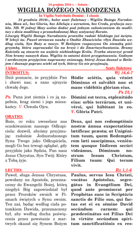 24 grudnia 2016 r. – Sobota - WIGILIA BOŻEGO NARODZENIA In Vigilia Nativitatis Domini - I classis 24 grudnia 2016r., kolor szat: fioletowy - Wigilia Bożego Narodzenia, Msza wł., bez Gloria, bez Alleluja z wersetem, bez Credo, prefacja zwykła. NB. W jednej Mszy wolno dodać pod jednym zakończeniem do modlitwy z dnia modlitwę z przeszkodzonej Mszy wotywnej Rorate. Liturgię Wigilii Bożego Narodzenia przenika radość bliskiego już święta. W lekcji św. Paweł streszcza naukę o Osobie Zbawiciela: «Syn Dawida według ciała, Syn Boży w mocy». W Betlejem rozpoczyna On ziemską pielgrzymkę, która zaprowadzi Go na krzyż i do Zmartwychwstania. Bramy Kościoła są otwarte na wejście niebieskiego Króla. Trzeba otworzyć przed Nim bramy naszych dusz. Wigilia to ostatni dzień przygotowania. Godnym i serdecznym przyjęciem naprawmy zniewagę, której Jezus doznał w Betlejem i doznaje poprzez wieki od tych, którzy Go nie przyjmują. 1 klasy Szaty fioletowe INTROITUS: Wj 16,6-7 Dziś poznacie, że przyjdzie Pan Hódie sciétis, quia véniet i zbawi nas; a rano ujrzycie Dóminus et salvábit nos: et chwałę Jego. mane vidébitis glóriam eius. Ps 23,1 Ps. Pana jest ziemia i co ją na- Dómini est terra, etplenitúdo pełnia, krąg ziemi i jego miesz- eius: orbis terrárum, et unikańcy. V. Chwała Ojcu. vérsi, qui hábitant in eo. V. Glória Patri. ORATIO: Boże, co roku uweselasz nas Deus, qui nos redemptiónis oczekiwaniem naszego Odkupi- nostræ ánnua exspectatióne ciela: dozwól, abyśmy przyjmu- lætíficas: præsta; ut Unigénijąc radośnie Jednorodzonego tum tuum, quem RedemptóSyna Twego jako Odkupiciela, rem læti suscípimus, veniénmogli Go bez trwogi oglądać, gdy tem quoque Iúdicem secúri przyjdzie jako Sędzia, Pan nasz videámus, Dóminum noJezus Chrystus, Syn Twój: Który strum Iesum Christum, z Tobą żyje. Fílium tuum: Qui tecum vivit. LECTIO: Rz 1,1-6 Paweł, sługa Jezusa Chrystusa, Paulus, servus Iesu Christi, powołany na Apostoła, przezna- vocátus Apóstolus, segreczony do Ewangelii Bożej, którą gátus in Evangélium Dei, niegdyś Bóg zapowiedział był quod ante promíserat per przez Proroków swoich w Pi- Prophétas suos in Scriptúris smach świętych o Synu swoim. sanctis de Fílio suo, qui facTen zaś, będąc według ciała po- tus est ei ex sémine David tomkiem Dawida, przeznaczony secúndum carnem: qui był, aby według ducha poświę- prædestinátus est Fílius Dei cenia przez powstanie z mar- in virtúte secúndum spíritwych okazał się Synem Bożym tum sanctificatiónis ex res- w mocy, Jezusem Chrystusem, Panem naszym. Przez Niego otrzymaliśmy łaskę i apostolstwo, abyśmy dla imienia Jego skłaniali ku posłuszeństwu wierze wszystkie narody. Wśród nich jesteście i wy, powołani Jezusa Chrystusa, Pana naszego. GRADUALE: Dziś poznacie, że przyjdzie Pan i zbawi nas; a rano ujrzycie chwałę Jego. V. Pasterzu Izraela, posłuchaj: Ty, co jak trzodę wiedziesz ród Józefa. Zabłyśnij, który siedzisz na Cherubach, przed Efraimem, Beniaminem, Manassesem. EVANGELIUM: Gdy poślubiona była Matka Jezusa; Maryja, Józefowi, pierwej, niźli się zeszli, okazało się, że poczęła z Ducha Świętego. A Józef, mąż Jej, będąc sprawiedliwym i nie chcąc Jej zniesławiać, zamierzał Ją potajemnie opuścić. A gdy nad tym przemyśliwał, oto Anioł Pański ukazał mu się we śnie, mówiąc: «Józefie, synu Dawidów, nie bój się przyjąć Maryi, małżonki swojej, albowiem, co się w Niej poczęło, z Ducha Świętego jest. A porodzi syna i nazwiesz imię Jego Jezus, albowiem On wybawi lud swój od grzechów jego». urrectióne mortuórum Iesu Christi, Dómini nostri: per quem accépimus grátiam, et apostolátum ad oboediéndum fídei in ómnibus géntibus pro nómine eius, in quibus estis et vos vocáti Iesu Christi, Dómini nostri. Wj16,6-7 Hódie sciétis, quia véniet Dóminus et salvábit nos: et mane vidébitis glóriam eius. Ps 79,2-3 V. Qui regis Israël, inténde: qui dedúcis, velut ovem, Ioseph: qui sedes super Chérubim, appáre coram Ephraim, Béniamin, et Manásse. Mt 1,18-21 Cum esset desponsáta Mater Iesu Maria Ioseph, ántequam convenírent, inventa est in útero habens de Spiritu Sancto. Ioseph autem, vir eius, cum esset iustus et nollet eam tradúcere, vóluit occúlte dimíttere eam. Hæc autem eo cogitánte, ecce, Angelus Dómini appáruit in somnis ei, dicens: Ioseph, fili David, noli timére accípere Maríam cóniugem tuam: quod enim in ea natum est, de Spíritu Sancto est. Páriet autem fílium, et vocábis nomen eius Iesum: ipse enim salvum fáciet pópulum suum a peccátis eórum. Ps 23,7 Tóllite portas, principes, vestras: et elevámini, portæ æternáles, et introíbit Rex glóriæ. OFFERTORIUM: Bramy, podnieście swe szczyty i rozstąpcie się, prastare podwoje, aby mógł wkroczyć Król chwały. SECRETA: Obchodząc wigilię chwalebnych Da nobis, quaesumus, narodzin Twojego Syna, prosimy omnípotens Deus: ut, sicut Cię, wszechmogący Boże, abyśmy z radością odebrali Jego wiekuiste dary: Który z Tobą żyje. PRAEFATIO COMMUNIS: Prawdziwie godnie jest to i sprawiedliwie, słusznie i zbawiennie, byśmy zawsze i wszędzie dzięki Tobie czynili, Panie święty, Ojcze wszechmogący, wiekuisty Boże. Przez Chrystusa Pana naszego. Przez Niego Majestat twój wychwalają Aniołowie, wielbią Panowania, ze drżeniem czczą Mocarstwa. A wspólnie z nimi w radosnym uniesieniu sławią Niebiosa, Moce niebieskie, i błogosławione Serafiny. Dozwól, błagamy, aby i nasze głosy przyłączyły się do nich i ze czcią uniżoną wymawiały: COMMUNIO: Objawi się chwała Pańska i ujrzy wszelkie ciało zbawienie Boga naszego. POSTCOMMUNIO: Prosimy Cię, Panie, niech odnowi nasze życie obchód narodzin Jednorodzonego Syna Twojego, którego niebieska tajemnica nas karmi i poi. Przez tegoż Pana. adoránda Fílii tui natalítia prævenímus, sic eius múnera capiámus sempitérna gaudéntes: Qui tecu