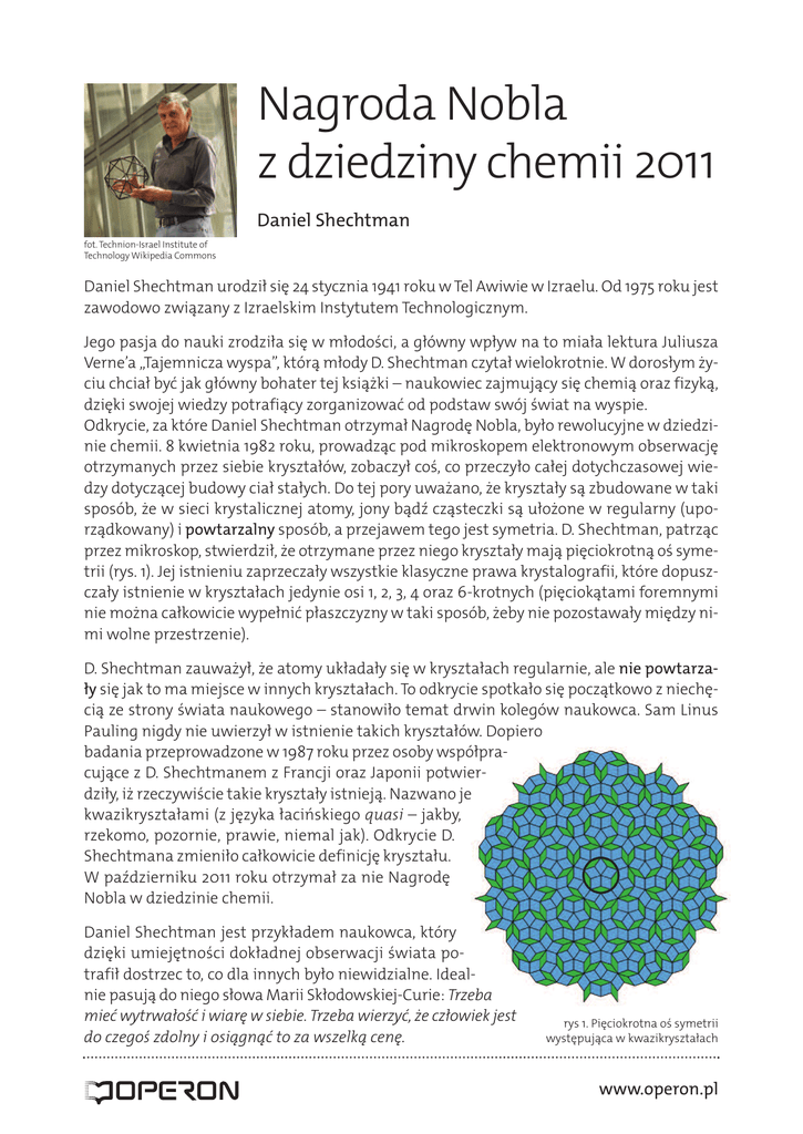 Nagroda Nobla z dziedziny chemii 2011 Daniel Shechtman fot. Technion-Israel Institute of Technology Wikipedia Commons Daniel Shechtman urodził się 24 stycznia 1941 roku w Tel Awiwie w Izraelu. Od 1975 roku jest zawodowo związany z Izraelskim Instytutem Technologicznym. Jego pasja do nauki zrodziła się w młodości, a główny wpływ na to miała lektura Juliusza Verne’a „Tajemnicza wyspa”, którą młody D. Shechtman czytał wielokrotnie. W dorosłym życiu chciał być jak główny bohater tej książki – naukowiec zajmujący się chemią oraz fizyką, dzięki swojej wiedzy potrafiący zorganizować od podstaw swój świat na wyspie. Odkrycie, za które Daniel Shechtman otrzymał Nagrodę Nobla, było rewolucyjne w dziedzinie chemii. 8 kwietnia 1982 roku, prowadząc pod mikroskopem elektronowym obserwację otrzymanych przez siebie kryształów, zobaczył coś, co przeczyło całej dotychczasowej wiedzy dotyczącej budowy ciał stałych. Do tej pory uważano, że kryształy są zbudowane w taki sposób, że w sieci krystalicznej atomy, jony bądź cząsteczki są ułożone w regularny (uporządkowany) i powtarzalny sposób, a przejawem tego jest symetria. D. Shechtman, patrząc przez mikroskop, stwierdził, że otrzymane przez niego kryształy mają pięciokrotną oś symetrii (rys. 1). Jej istnieniu zaprzeczały wszystkie klasyczne prawa krystalografii, które dopuszczały istnienie w kryształach jedynie osi 1, 2, 3, 4 oraz 6-krotnych (pięciokątami foremnymi nie można całkowicie wypełnić płaszczyzny w taki sposób, żeby nie pozostawały między nimi wolne przestrzenie). D. Shechtman zauważył, że atomy układały się w kryształach regularnie, ale nie powtarzały się jak to ma miejsce w innych kryształach. To odkrycie spotkało się początkowo z niechęcią ze strony świata naukowego – stanowiło temat drwin kolegów naukowca. Sam Linus Pauling nigdy nie uwierzył w istnienie takich kryształów. Dopiero badania przeprowadzone w 1987 roku przez osoby współpracujące z D. Shechtmanem z Francji oraz Japonii potwierdziły, iż rzeczywiście takie kryształy istnieją. Nazwano je kwazikryształami (z języka łacińskiego quasi – jakby, rzekomo, pozornie, prawie, niemal jak). Odkrycie D. Shechtmana zmieniło całkowicie definicję kryształu. W październiku 2011 roku otrzymał za nie Nagrodę Nobla w dziedzinie chemii. Daniel Shechtman jest przykładem naukowca, który dzięki umiejętności dokładnej obserwacji świata potrafił dostrzec to, co dla innych było niewidzialne. Idealnie pasują do niego słowa Marii Skłodowskiej-Curie: Trzeba miećwytrwałośći wiaręw siebie.Trzebawierzyć,żeczłowiekjest do czegośzdolnyi osiągnąćtoza wszelkącenę. rys 1. Pięciokrotna oś symetrii występująca w kwazikryształach www.operon.pl