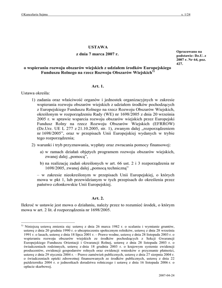 ©Kancelaria Sejmu s. 1/24 USTAWA z dnia 7 marca 2007 r. o wspieraniu rozwoju obszarów wiejskich z udziałem środków Europejskiego Funduszu Rolnego na rzecz Rozwoju Obszarów Wiejskich1) Art. 1. Ustawa określa: 1) zadania oraz właściwość organów i jednostek organizacyjnych w zakresie wspierania rozwoju obszarów wiejskich z udziałem środków pochodzących z Europejskiego Funduszu Rolnego na rzecz Rozwoju Obszarów Wiejskich, określonym w rozporządzeniu Rady (WE) nr 1698/2005 z dnia 20 września 2005 r. w sprawie wsparcia rozwoju obszarów wiejskich przez Europejski Fundusz Rolny na rzecz Rozwoju Obszarów Wiejskich (EFRROW) (Dz.Urz. UE L 277 z 21.10.2005, str. 1), zwanym dalej „rozporządzeniem nr 1698/2005”, oraz w przepisach Unii Europejskiej wydanych w trybie tego rozporządzenia; 2) warunki i tryb przyznawania, wypłaty oraz zwracania pomocy finansowej: a) w ramach działań objętych programem rozwoju obszarów wiejskich, zwanej dalej „pomocą”, b) na realizację zadań określonych w art. 66 ust. 2 i 3 rozporządzenia nr 1698/2005, zwanej dalej „pomocą techniczną” – w zakresie nieokreślonym w przepisach Unii Europejskiej, o których mowa w pkt 1, lub przewidzianym w tych przepisach do określenia przez państwo członkowskie Unii Europejskiej. Art. 2. Ilekroć w ustawie jest mowa o działaniu, należy przez to rozumieć środek, o którym mowa w art. 2 lit. d rozporządzenia nr 1698/2005. 1) Niniejszą ustawą zmienia się: ustawę z dnia 26 marca 1982 r. o scalaniu i wymianie gruntów, ustawę z dnia 20 grudnia 1990 r. o ubezpieczeniu społecznym rolników, ustawę z dnia 28 września 1991 r. o lasach, ustawę z dnia 18 lipca 2001 r. – Prawo wodne, ustawę z dnia 28 listopada 2003 r. o wspieraniu rozwoju obszarów wiejskich ze środków pochodzących z Sekcji Gwarancji Europejskiego Funduszu Orientacji i Gwarancji Rolnej, ustawę z dnia 28 listopada 2003 r. o świadczeniach rodzinnych, ustawę z dnia 18 grudnia 2003 r. o krajowym systemie ewidencji producentów, ewidencji gospodarstw rolnych oraz ewidencji wniosków o przyznanie płatności, ustawę z dnia 29 stycznia 2004 r. – Prawo zamówień publicznych, ustawę z dnia 27 sierpnia 2004 r. o świadczeniach opieki zdrowotnej finansowanych ze środków publicznych, ustawę z dnia 22 października 2004 r. o jednostkach doradztwa rolniczego i ustawę z dnia 16 listopada 2006 r. o opłacie skarbowej. 2007-04-24 Opracowano na podstawie: Dz.U. z 2007 r. Nr 64, poz. 427. ©Kancelaria Sejmu s. 2/24 Art. 3. 1. Minister właściwy do spraw rozwoju wsi opracowuje: 1) projekt krajowego planu strategicznego, o którym mowa w art. 11 rozporządzenia nr 1698/2005, 2) projekt programu rozwoju obszarów wiejskich, o którym mowa w art. 15 rozporządzenia nr 1698/2005, zwanego dalej „programem” – po zasięgnięciu opinii samorządów województw oraz partnerów gospodarczych i społecznych, o których mowa w rozporządzeniu nr 1698/2005. 2. Rada Ministrów, w drodze uchwały: 1) przyjmuje krajowy plan strategiczny; 2) zatwierdza projekt programu. 3. Minister właściwy do spraw rozwoju wsi: 1) przekazuje Komisji Europejskiej: a) przyjęty przez Radę Ministrów krajowy plan strategiczny, b) zatwierdzony przez Radę Ministrów projekt programu; 2) współpracuje z Komisją Europejską w zakresie oceny przekazanego jej projektu programu oraz przeglądu tego programu zgodnie z rozporządzeniem nr 1698/2005. 4. Po zatwierdzeniu programu przez Komisję Europejską minister właściwy do spraw rozwoju wsi ogłasza program, w drodze obwieszczenia, w Dzienniku Urzędowym Rzeczypospolitej Polskiej „Monitor Polski”. 5. Minister właściwy do spraw rozwoju wsi opracowuje projekt zmiany programu po zasięgnięciu opinii komitetu monitorującego, o którym mowa w art. 77 rozporządzenia nr 1698/2005. Do zmiany programu przepisy ust. 2-4 stosuje się odpowiednio. Art. 4. 1. Minister właściwy do spraw rozwoju wsi: 1) pełni funkcję instytucji zarządzającej, o której mowa w art. 74 ust. 2 lit. a rozporządzenia nr 1698/2005; 2) zamawia, w trybie przepisów o zamówieniach publicznych, wykonywanie ocen programu oraz przedkłada te oceny Komisji Europejskiej; 3) przekazuje Komisji Europejskiej roczne sprawozdania, o których mowa w art. 82 rozporządzenia nr 1698/2005; 4) uznaje, w drodze decyzji administracyjnej, krajowe systemy jakości żywności, o których mowa w art. 32 ust. 1 lit. b rozporządzenia nr 1698/2005; 5) powołuje, w drodze zarządzenia, komitet monitorujący, o którym mowa w art. 77 rozporządzenia nr 1698/2005; 6) tworzy krajową sieć obszarów wiejskich, o której mowa w art. 68 rozporządzenia nr 1698/2005. 2007-04-24 ©Kancelaria Sejmu s. 3/24 2. Agencja Restrukturyzacji i Modernizacji Rolnictwa, zwana dalej „Agencją”, akredytowana na podstawie przepisów odrębnych jako agencja płatnicza, realizuje zadania i kompetencje agencji płatniczej określone w przepisach, o których mowa w art. 1 pkt 1, oraz w ustawie. Art. 5. 1. Program jest realizowany na terytorium Rzeczypospolitej Polskiej i obejmuje następujące działania: 1) szkolenia zawodowe dla osób zatrudnionych w rolnictwie i leśnictwie; 2) ułatwianie startu młodym rolnikom; 3) renty strukturalne; 4) modernizacja gospodarstw rolnych; 5) zwiększanie wartości dodanej podstawowej produkcji rolnej i leśnej; 6) poprawianie i rozwijanie infrastruktury związanej z rozwojem i dostosowywaniem rolnictwa i leśnictwa przez: a) scalanie gruntów, b) gospodarowanie rolniczymi zasobami wodnymi; 7) uczestnictwo rolników w systemach jakości żywności; 8) działania informacyjne i promocyjne; 9) wspieranie gospodarstw rolnych niskotowarowych w fazie restrukturyzacji; 10) grupy producentów rolnych; 11) korzystanie z usług doradczych przez rolników i posiadaczy lasów; 12) wspieranie gospodarowania na obszarach górskich i innych obszarach o niekorzystnych warunkach gospodarowania (ONW); 13) płatności dla obszarów NATURA 2000 oraz 