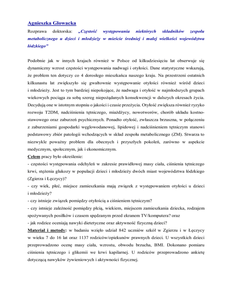 Agnieszka Głowacka Rozprawa doktorska: „Częstość występowania niektórych składników zespołu metabolicznego u dzieci i młodzieży w mieście średniej i małej wielkości województwa łódzkiego” Podobnie jak w innych krajach również w Polsce od kilkudziesięciu lat obserwuje się dynamiczny wzrost częstości występowania nadwagi i otyłości. Dane statystyczne wskazują, że problem ten dotyczy co 4 dorosłego mieszkańca naszego kraju. Na przestrzeni ostatnich kilkunastu lat zwiększyło się gwałtownie występowanie otyłości również wśród dzieci i młodzieży. Jest to tym bardziej niepokojące, że nadwaga i otyłość w najmłodszych grupach wiekowych pociąga za sobą szereg niepożądanych konsekwencji w dalszych okresach życia. Decydują one w istotnym stopniu o jakości i czasie przeżycia. Otyłość zwiększa również ryzyko rozwoju T2DM, nadciśnienia tętniczego, miażdżycy, nowotworów, chorób układu kostnostawowego oraz zaburzeń psychicznych. Ponadto otyłość, zwłaszcza brzuszna, w połączeniu z zaburzeniami gospodarki węglowodanowej, lipidowej i nadciśnieniem tętniczym stanowi podstawowy zbiór patologii wchodzących w skład zespołu metabolicznego (ZM). Stwarza to niezwykle poważny problem dla obecnych i przyszłych pokoleń, zarówno w aspekcie medycznym, społecznym, jak i ekonomicznym. Celem pracy było określenie: - częstości występowania odchyleń w zakresie prawidłowej masy ciała, ciśnienia tętniczego krwi, stężenia glukozy w populacji dzieci i młodzieży dwóch miast województwa łódzkiego (Zgierza i Łęczycy)? - czy wiek, płeć, miejsce zamieszkania mają związek z występowaniem otyłości u dzieci i młodzieży? - czy istnieje związek pomiędzy otyłością a ciśnieniem tętniczym? - czy istnieje zależność pomiędzy płcią, wiekiem, miejscem zamieszkania dziecka, rodzajem spożywanych posiłków i czasem spędzanym przed ekranem TV/komputera? oraz - jak rodzice oceniają nawyki dietetyczne oraz aktywność fizyczną dzieci? Materiał i metody: w badaniu wzięło udział 842 uczniów szkół w Zgierzu i w Łęczycy w wieku 7 do 16 lat oraz 1137 rodziców/opiekunów prawnych dzieci. U wszystkich dzieci przeprowadzono ocenę masy ciała, wzrostu, obwodu brzucha, BMI. Dokonano pomiaru ciśnienia tętniczego i glikemii we krwi kapilarnej. U rodziców przeprowadzono ankietę dotyczącą nawyków żywieniowych i aktywności fizycznej. Wyniki: najczęstszym odchyleniem od przyjętej normy u dzieci i młodzieży miasta Zgierza i Łęczycy były: nadwaga, otyłość i wysokie wartości ciśnienia tętniczego (≥c95). U chłopców w obu badanych populacjach stwierdzono częstsze występowanie otyłości niż u dziewcząt. U chłopców wskaźnik WHR wskazujący na otyłość brzuszną, częściej był wyższy niż u dziewcząt, szczególnie w najmłodszych grupach wiekowych. Również wysokie wartości ciśnienia tętniczego częściej występowały u dzieci z otyłością brzuszną. Najwięcej czasu przed ekranem TV/komputera spędzała młodzież w wieku 16 lat, przy czym najwięcej posiłków typu "fast food" spożywały dzieci i młodzież, która spędza ponad 2 godziny dziennie przed ekranem TV/PC. W Łęczycy większy odsetek dzieci i młodzieży ponad 2 godz. dziennie spędzał przed ekranem TV/PC niż w Zgierzu. W obu badanych populacjach ponad 50% rodziców oceniało aktywność fizyczną dzieci jako prawidłową, a prawie 90% rodziców akceptowało nawyki dietetyczne dzieci. Wnioski: Poznanie uwarunkowań dotyczących występowania składników zespołu metabolicznego w populacji dzieci i młodzieży małego i średniej wielkości miasta województwa łódzkiego, daje możliwość wczesnego wdrożenia optymalnych metod prewencji pierwotnej. Metody te powinny być odpowiednie do zidentyfikowanych potrzeb określonych grup pod względem płci i wieku. Szczególną uwagą w działaniach profilaktycznych powinni być objęci w populacjach obu miast chłopcy w wieku 7-12 lat . W tej grupie główne ryzyko stanowi występowanie nadwagi i otyłości. Wyniki moich badań wskazują, że do dzieci i młodzieży w obu badanych miastach należy kierować atrakcyjne programy przeciwdziałające siedzącemu trybowi życia i niezdrowym nawykom żywieniowym. Należy także, ze względu na niedostateczną wiedzę rodziców dotyczącą zasad zdrowego stylu życia dla dzieci i młodzieży, zintensyfikować działania edukacyjne w tym zakresie. Otyłość stwierdzona u dużego odsetka dzieci i młodzieży zamieszkujących dwa niedużej wielkości miasta województwa łódzkiego – Zgierz i Łęczycę - może stwarzać zagrożenie zdrowotne w późniejszym okresie ich życia. Wiąże się to ze zwiększeniem w przyszłości obciążenia budżetu województwa łódzkiego przeznaczonego na opiekę zdrowotną, w tym na profilaktykę drugorzędową i trzeciorzędową. Podsumowując, uzyskane przeze mnie wyniki wskazują na konieczność wdrożenia wielokierunkowych działań promujących prozdrowotny styl życia wśród dzieci i młodzieży województwa łódzkiego. W realizację tego programu powinien być zaangażowany nie tylko system opieki zdrowotnej, ale w jak najszerszym zakresie rodzice, nauczyciele oraz media publiczne. Adres do korespondencji Agnieszka Głowacka Wydział Nauk o Zdrowiu Uniwersytet Medyczny w Łodzi tel. 500432848 email: [email protected]