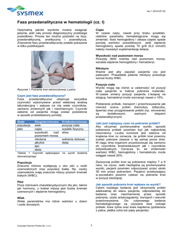 rev.1 2015-07-22 Faza przedanalityczna w hematologii (cz. I) Ciąża W czasie ciąży, nawet przy braku powikłań, niektóre parametry hematologiczne mogą się zmieniać. Ilość hemoglobiny i żelaza często spada poniżej wartości prawidłowych. Jeśli stężenie hemoglobiny spada poniżej 10 g/dl (6,2 mmol/l) należy rozważyć suplementację żelaza. Optymalną jakość wyników można osiągnąć jedynie, jeśli cały proces diagnostyczny przebiega prawidłowo. Proces ten można podzielić na fazy: przedanalityczną, analityczną i poanalityczą. Znaczenie fazy przedanalitycznej zostało pokazane w kilku publikacjach. Wysokość nad poziomem morza Powyżej 3600 metrów nad poziomem morza, wzrasta stężenie hemoglobiny i hematokryt. Nikotyna Ważne jest aby zapytać pacjenta czy jest palaczem. Przewlekłe palenie nikotyny powoduje wzrost liczby WBC. Pozycja ciała Wyniki mogą się różnić w zależności od pozycji ciała pacjenta w trakcie pobrania materiału. W czasie zmiany pozycji pacjenta z leżącej na stojącą, hematokryt może wzrosnąć nawet o 15%. Rysunek 1 Pobranie krwi włośniczkowej z palca Czym jest faza przedanalityczna? Faza przedanalityczna obejmuje wszystkie czynności wykonywane przed właściwą analizą laboratoryjną i wpływa na nią wiele czynników, zarówno zmiennych jak i niezmiennych. Czynniki zależne od pacjenta mogą zostać podzielone w sposób przedstawiony poniżej: Stałe populacja płeć Długoterminowe wiek ciąża wysokość nad poziomem morza nikotyna alkohol leki dieta Pobieranie próbek, transport i przechowywanie jak również ocena próbki (hemoliza, żółtaczka, lipemia) oraz przygotowanie próbki (np. wirowanie) są dodatkowymi, ważnymi etapami przedanalitycznymi. Krótkoterminowe pozycja ciała wysiłek fizyczny stres Jaki jest najlepszy czas na pobranie próbki? Aby otrzymać porównywalne wyniki, sposób pobierania próbek powinien być jak najbardziej niezmienny. Liczba komórek jest zależna od krążenia krwi co oznacza, że próbki krwi powinny zostać pobrane zawsze o tej samej porze dnia. W ciągu dnia organizm przystosowuje się zarówno do czynników środowiskowych jak i czynników indywidualnych. Oznacza to, że zmienność wartości WBC, hemoglobiny i hematokrytu może osiągać nawet 20%. wahania dobowe dieta Tabela 1 Czynniki wpływające na wynik badania laboratoryjnego Zazwyczaj próbki krwi są pobierane między 7 a 9 rano, na czczo. Jeśli niezbędne są porównywalne wyniki, pacjent powinien odpoczywać przez około 30 min przez pobraniem. Pacjenci przebywający w poczekalni powinni czekać na pobranie krwi w pozycji siedzącej. Populacja Znaczne różnice występują u obu płci u osób czarnoskórych oraz populacji białej. Np. osoby czarnoskóre mają znacznie niższy poziom krwinek białych (WBC). Płeć Poza różnicami charakterystycznymi dla płci, takimi jak hormony, u kobiet niższa jest liczba krwinek czerwonych i stężenie hemoglobiny. Jak sposób pobrania krwi wpływa na wynik? Celem każdego badania jest otrzymanie próbki adekwatnej do stanu pacjenta, odpowiedniej do badania oraz niezmienionej przez sposób pobrania, użyte antykoagulanty, transport i warunki przechowywania. Do rutynowego badania hematologicznego są używane dwa rodzaje próbek: krew żylna oraz krew kapilarna (pobierana z palca, płatka ucha lub pięty pacjenta). Wiek Wiele parametrów ma różne wartości u dzieci i osób dorosłych. Copyright Sysmex Polska Sp. z o.o. 1 rev.1 2015-07-22 Skład krwi różni się między różnymi regionami ukrwienia. Około 65% całkowitej objętości krwi znajduje się w żyłach, 20% w kapilarach i 15% w tętnicach. Pojemność układu żylnego i kapilarnego ma duży wpływ na dystrybucję i skład krwi. W wyniku rozszerzenia światła naczyń stosunek osocza w układzie włośniczkowym wzrasta z powodu nadmiernego wyciekania elementów komórkowych do przestrzeni okołowłośniczkowej. O ile skład krwi tętniczej i żylnej jest mniej lub bardziej stały, procesy metaboliczne i wymiany substancji zachodzące w naczyniach włosowatych mogą powodować szybkie zmiany w składzie krwi włośniczkowej. Co więcej, sytuacje stresowe powodują słabsze krążenie krwi włośniczkowej, przez co krew włośniczkowa nie odzwierciedla rzeczywistego stanu pacjenta i jest mniej reprezentatywna niż krew żylna. b. Bezpośrednio zapytany pacjent zawsze powinien podać swoje dane. 3. Identyfikacja próbki a. Próbki, których nie da się jednoznacznie zidentyfikować, nigdy nie powinny być badane. Naklejka z kodem kreskowym na pierwotnej próbce zapewnia bezpieczną identyfikację. b. Do opisywania szklanych lub plastikowych probówek należy używać tylko wodoodpornych markerów. c. Dodatek antykoagulantów, aktywatorów krzepnięcia czy żeli zaznaczony jest za pomocą różnych kolorów. Kod europejski [ ] (biały) █ █ █ █ Pobieranie krwi włośniczkowej jest metodą z wyboru jedynie w przypadku noworodków i niemowląt. W pewnych okolicznościach jest również wybierane u dorosłych: • zły stan naczyń żylnych pacjenta, • pacjent z oparzeniami lub bliznami w miejscach pobierania krwi żylnej, • pacjenci otyli, • pacjenci, którzy mają często wykonywane badania krwi, • pacjenci, którzy mają wenflony w obydwu rękach lub nogach, • jeśli próbka krwi włośniczkowej jest wystarczająca do badania, • pacjenci z planowanym leczeniem dożylnym lub chemioterapią, • badania przyłóżkowe (POCT), do których wystarczy kilka kropel krwi. █ █ surowica surowica z żelem heparyna litowa Glukoza EDTA Cytrynian 3,2% (OB) Cytrynian 3,8% (koagulologia) Kod amerykański █ █ █ █ █ █ █ Tabela 2 Oznaczenia probówek do pobierania materiału Co należy uwzględnić pobierając próbkę? Osoba pobierająca materiał obowiązkowo musi nosić rękawiczki ochronne. Właściwa kolejność pobieranych próbek: 1. Posiew krwi 2. Krew natywna („na skrzep”) 3. Krew pobier