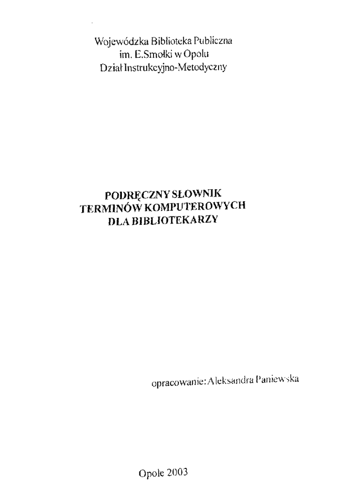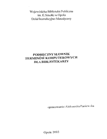 Wojewódzka Biblioteka Publiczna im. E.Smołki w Opolu Dział Instrukcyjno-Metodyczny PODRĘCZNY SŁOWNIK TERMINÓW KOMPUTEROWYCH DLA BIBLIOTEKARZY opracowanie: Aleksandra Paniewska Opole 2003 @ - at, małpka, symbol rozdzielający nazwę użytkownika od nazwy (domeny) serwera poczty elektronicznej. administrator sieci - osoba nadzorująca pracę powierzonego je j sprzętu sieci, mająca prawo do zmiany uprawnień wszystkich użytkowników. Aleph (Automated Library Expandable Program) - to nowoczesny zintegrowany system działający w 42 krajach, opracowany specjalnie dla potrzeb dużych bibliotek, ośrodków informacji, archiwów, muzeów. Architektura systemu opiera się na wielowarstwowym modelu klient - serwer. Aleph może automatyzować pojedyncze biblioteki, lokalnąsieć bibliotek, rozległąsieć ogólnokrajową oraz katalog centralny. Aleph jest systemem całkowicie spolonizowanym. Polskim przedstawicielstwem zajmuje sięfirma TCH Systems. System Aleph obsługuje m.in. Bibliotekę Publiczną m. st. Warszawy. alfanumeryczny - alfabetyczno-numeryczny; przymiotnik odnoszący się do znaków alfabetu i cyfr; używany do określenia rodzaju klawiatur, monitorów, drukarek. algorytm - zestaw instrukcji, które należy wykonać, albo rozwiązanie określonego zadania. aplikacja (appłication - zastosowanie) - program użytkowy; oprogramowanie używane bezpośrednio do głównie pozainformatycznych zastosowań, np. edytorstwo. API (Application Programming Interfaces) - interfejs programowania aplikacji; udostępniany przez producentów niektórych systemów operacyjnych; narzędzie pozwalające programiście na bezpośredni dostęp do tworzenia aplikacji w danym środowisku. ARCnet (Attached-Resource Computing network) - sieć o topologii gwiazdy, w której każda stacja robocza jest połączona bezpośrednio z serwerem. arkusz kalkulacyjny - program do prowadzenia obliczeń tabelarycznych. Obliczenia są wykonywane automatycznie. Najbardziej znane arkusze kalkulacyjne to: Lotus 1-2-3, Microsoft Excel. bajt (byle) - podstawowa jednostka danych dla komputerów - osiem kolejnych bitów. Bajt mający jeden znak jest również podstawową jednostką pomiaru pojemności pamięci komputera. baza danych - zbiór informacji uszeregowanych wg określonego schematu logicznego. biblioteka (library) - zbiór standardowych, przetestowanych programów, które można wykorzystać włączając do nowych programów. biblioteka cyfrowa (digital library) - nie posiada zbiorów w postaci konwencjonalnej. Wszystkie dokumenty występują wyłącznie w postaci elektronicznej. Dostęp do nich zapewniają specjalne urządzenia, dotyczy to gromadzenia zbiorów jak i katalogów. biblioteka elektroniczna (electronic library) - wszystkie procesy, które majątu miejsce (gromadzenie, opracowanie, wyszukiwanie, udostępnianie) odbywają się z zastosowaniem techniki elektronicznej. Na organizację jej działalności wpływ ma zastosowanie zintegrowanego systemu bibliotecznego w tym katalogu OPAC. Zbiory mąjącharakter polimedialny. biblioteka polimedialna (polimedia library) - biblioteka posiada różne typy dokumentów zapisanych na różnorodnych nośnikach: papierowych, audiowizualnych, elektronicznych. Dokumenty tradycyjne sąpodstawązbiorów. biblioteka wirtualna (virtual library) - biblioteka „bez ścian",nie istnieje fizycznie. Stwarza możliwość dotarcia do informacji przez przeszukiwanie wielu systemów informacyjnych zorganizowanych w jedną bazę. BIOS (Basic Input/Out put System) - program zapisany w pamięci, odpowiadający za sprawdzanie stanu wewnętrznych układów elektronicznych, zawierający jednocześnie zbiór podstawowych funkcji systemu komputerowego. bit - podstawowa jednostka informacji w dwójkowym systemie liczenia - dosłownie cyfra binarna, czyli O lub 1; najmniejsza porcja informacji: „tak lub nie". 8 bitów tworzy oktet zwany bajtem. bps (bit - per - second) - bit na sekundę; jednostka szybkości transmisji danych cyfrowych w sieciach. C - język programowania cache - podręczna szybka pamięć lokalna, przeznaczona przeważnie do przechowywania szczególnie często używanych danych lub programów. CD (Compact Disc) - okrągła płytka z tworzywa sztucznego umożliwiająca przechowywanie zapisanych na niej utworów muzycznych CD-R (Compact Disc Recordable) - odmiana dysków CD umożliwiająca na nich jednokrotny zapis informacji. CD-RW (Compact Disc ReWritable) - odmiana dysków CD umożliwiająca na nich wielokrotny zapis i kasowanie informacji. CD-ROM (Compact Disc Read Only Memory) - dysk kompaktowy tylko do odczytu. Także potoczne określenie czytnika płyt CDROM. CKHW - centralna kartoteka haseł wzorcowych. cłuster (klaster, dosł. zlepek) - jednostka pamięci dysku składająca się z jednego lub kilku sektorów. CPU (Central Unit Processor) - procesor, główna jednostka obliczeniowa komputera, np. Celevon, Pentium III, IV. czasopisma elektroniczne (elektronie journals) - wydawnictwa cyfrowe o charakterze ciągłym ukazujące się systematycznie w Internecie, niezależnie od ich treści, formy w jakiej są dostępne, sposobu dystrybucji. Przykładem jest EBIB - Elektroniczny Biuletyn Informacyjny Bibliotekarzy. czytnik kodów kreskowych - urządzenie wejściowe, które wczytuje kod kreskowy i za pomocą specjalnego oprogramowania konwertuje go na dane liczbowe. dBase (data Base) język i program obsługi danych przeznaczonych zwłaszcza dla komputerów osobistych. defragmentacja - procedura przepisywania wszystkich plików na dysku twardym taka, by wszystkie części każdego pliku były zapisane w kolejnych sektorach. W rezultacie defragmentacji otrzymuje się zwiększenie szybkości odczytu danych nawet o 75%. digitalizacja - proces transformacji danych analogowych na postać cyfrową. dokument elektroniczny - dokument istniejący w postaci elektronicznej, dostępny za pomocątechniki komputerowej. dom ena - w Internecie pierwszy poziom podziału sieci, głównie k