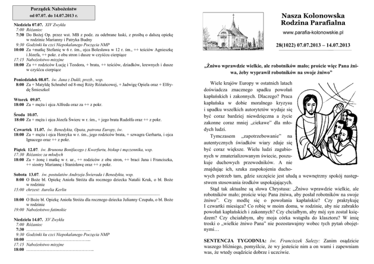 Porządek Nabożeństw od 07.07. do 14.07.2013 r. Niedziela 07.07. XIV Zwykła 7:00 Różaniec 7:30 Do Bożej Op. przez wst. MB z podz. za odebrane łaski, z prośbą o dalszą opiekę w rodzinie Marianny i Patryka Budny 9:30 Godzinki ku czci Niepokalanego Poczęcia NMP 10:00 Za +matkę Stefanię w 6 r. śm., ojca Bolesława w 12 r. śm., ++ teściów Agnieszkę i Józefa, ++ pokr. z obu stron i dusze w czyśćcu cierpiące 17:15 Nabożeństwo misyjne 18:00 Za ++ rodziców Łucję i Teodora, + brata, ++ teściów, dziadków, krewnych i dusze w czyśćcu cierpiące Poniedziałek 08.07. św. Jana z Dukli, prezb., wsp. 8:00 Za + Matyldę Schnabel od 8-mej Róży Różańcowej, + Jadwigę Opiela oraz + Elfrydę Śmieszkol Wtorek 09.07. 18:00 Za + męża i ojca Alfreda oraz za ++ z pokr. Środa 10.07. 18:00 Za + męża i ojca Józefa Świerc w r. śm., + jego brata Rudolfa oraz ++ z pokr. Czwartek 11.07. św. Benedykta, Opata, patrona Europy, św. 18:00 Za + męża i ojca Henryka w r. śm., jego rodziców brata, + szwagra Gerharta, i ojca Ignacego oraz ++ z pokr. Piątek 12.07. św. Brunona Bonifacego z Kwerfurtu, biskup i męczennika, wsp. 17:30 Różaniec za młodych 18:00 Za + żonę i matkę w r. ur., ++ rodziców z obu stron, ++ braci Jana i Franciszka, ++ siostry Mariannę i Stanisławę oraz ++ z pokr. Sobota 13.07. św. postulatów Andrzeja Świerada i Benedykta, wsp. 8:00 O Boże bł. Opiekę Anioła Stróża dla rocznego dziecka Natalii Kruk, o bł. Boże w rodzinie 15:00 chrzest: Aurelia Kerlin —–————–——————–—————–—————————–––—— 18:00 O Boże bł. Opiekę Anioła Stróża dla rocznego dziecka Julianny Czupała, o bł. Boże w rodzinie 19:00 Nabożeństwo fatimskie Niedziela 14.07. XV Zwykła 7:00 Różaniec 7:30 ……………………………………... 9:30 Godzinki ku czci Niepokalanego Poczęcia NMP 10:00 ……………………………………... 17:15 Nabożeństwo misyjne 18:00 ……………………………………….. Nasza Kolonowska Rodzina Parafialna www.parafia-kolonowskie.pl 28(1022) 07.07.2013 – 14.07.2013 „Żniwo wprawdzie wielkie, ale robotników mało; proście więc Pana żniwa, żeby wyprawił robotników na swoje żniwo” Wiele krajów Europy w ostatnich latach doświadcza znacznego spadku powołań kapłańskich i zakonnych. Dlaczego? Praca kapłańska w dobie moralnego kryzysu i upadku wszelkich autorytetów wydaje się być coraz bardziej niewdzięczna a życie zakonne coraz mniej „ciekawe” dla młodych ludzi. Tymczasem „zapotrzebowanie” na autentycznych świadków wiary zdaje się być coraz większe. Wielu ludzi zagubionych w zmaterializowanym świecie, poszukuje duchowych przewodników. A nie znajdując ich, szuka zaspokojenia duchowych potrzeb tam, gdzie szczęście jest ułudą a wewnętrzny spokój następstwem stosowania środków uspokajających. Stąd tak aktualne są słowa Chrystusa: „Żniwo wprawdzie wielkie, ale robotników mało; proście więc Pana żniwa, aby posłał robotników na swoje żniwo”. Czy modlę się o powołania kapłańskie? Czy praktykuję I czwartki miesiąca? Co robię w moim domu, w rodzinie, aby nie zabrakło powołań kapłańskich i zakonnych? Czy chciałbym, aby mój syn został księdzem? Czy chciałabym, aby moja córka wstąpiła do klasztoru? W imię troski o „wielkie żniwo Pana” nie pozostawajmy wobec tych pytań obojętnymi… SENTENCJA TYGODNIA: św. Franciszek Salezy: Zanim osądzicie waszego bliźniego, pomyślcie, że wy jesteście nim a on wami i zapewniam was, że wtedy osądzicie dobrze i uczciwie. 28/2013 Poszukujący ateista: Starszy człowiek, który był ateistą, udał się do pewnego znanego księdza. Miał nadzieję, że w ten sposób rozwiąże problemy swojej wiary. Nie był w stanie uwierzyć, że Jezus z Nazaretu naprawdę zmartwychwstał. Szukał dowodów, które pozwoliłyby mu uwierzyć w zmartwychwstanie... Kiedy dotarł do domu parafialnego, w którym mieszkał ksiądz, znajdował się już u niego jakiś gość. Ksiądz dostrzegłszy przez uchylone drzwi czekającego starca, wyszedł z kancelarii i z uśmiechem podał mu krzesło. Pożegnawszy się z przebywającym u niego gościem, zaprosił starca do siebie. Wysłuchał uważnie jego wątpliwości, a potem przez długi czas rozmawiali. Po burzliwej dyskusji ateista stał się wierzącym. Powrócił do przyjmowania sakramentów, wypełniania Słowa Bożego i uwierzył w Matkę Bożą. Szczęśliwy, i trochę zdziwiony, kapłan zapytał go kiedyś: – Niech mi pan powie, co w tej długiej rozmowie stało się dowodem, przekonującym pana, że Chrystus naprawdę zmartwychwstał, że Bóg rzeczywiście istnieje? – Sposób, w jaki podał mi ksiądz krzesło, abym nie zmęczył się oczekiwaniem – odpowiedział starzec. —————————————————————————————— Katechizm w pytaniach i odpowiedziach W jaki sposób społeczeństwo zapewnia sprawiedliwość społeczną? Społeczeństwo zapewnia sprawiedliwość społeczną, gdy respektuje godność i prawa człowieka. Osoba jest celem ostatecznym społeczeństwa. Ponadto społeczeństwo zapewnia sprawiedliwość społeczną, gdy urzeczywistnia warunki pozwalające zrzeszeniom oraz każdemu z osobna na osiągnięcie tego, co im się należy. Na czym opiera się równość między ludźmi? Wszyscy ludzie cieszą się równą godnością i posiadają te same fundamentalne prawa, ponieważ są stworzeni na obraz jedynego Boga, obdarzeni są taką samą rozumną duszą, mają tę samą naturę i to samo pochodzenie i są wezwani, w Chrystusie jedynym Zbawicielu, do uczestnictwa w Boskim szczęściu. W jaki sposób przejawia się solidarność ludzka? Solidarność, która wypływa z ludzkiego i chrześcijańskiego braterstwa, przejawia się przede wszystkim w sprawiedliwym podziale dóbr, w wynagrodzeniu za pracę oraz zakłada wysiłek na rzecz bard