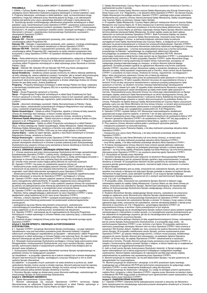 REGULAMIN UMOWY O ABONAMENT PREAMBUŁA I. CANAL+ Cyfrowy Spółka Akcyjna, z siedzibą w Warszawie („Operator CYFRY+”), udostępnia swoim Abonentom kodowane programy telewizyjne w ramach pakietów i opcji. II. Programy telewizyjne, wchodzące w skład pakietów i opcji, są transmitowane drogą satelitarną i mogą być odbierane przez Abonenta jedynie tą drogą, a ich odkodowanie możliwe jest jedynie przy użyciu specjalnego dekodera cyfrowego z kartą abonencką. III. Dystrybucję sprzętu umożliwiającego odkodowanie programów wchodzących w skład pakietów i opcji, transmitowanych przez Operatora CYFRY+, powierzono autoryzowanym dystrybutorom lub autoryzowanym punktom sprzedaży Operatora CYFRY+ („Autoryzowany Dystrybutor”). W związku z powyższym wszelkie prawa i obowiązki wynikające z Umowy o Abonament („Umowa”), zawartej przez Autoryzowanego Dystrybutora, są prawami i obowiązkami Operatora CYFRY+. Artykuł 1. DEFINICJE Dekoder SD – Dekoder z wyposażeniem (przewody, pilot, zasilacz), bez funkcji umożliwiającej odbiór Programów HD. Dekoder HD – Dekoder z wyposażeniem (przewody, pilot, zasilacz), z funkcją umożliwiającą odbiór Programów HD na zasadach określonych w ofercie Operatora CYFRY+. Dekoder HD PVR – Dekoder z wyposażeniem (przewody, pilot, zasilacz), z funkcją umożliwiającą odbiór Programów HD i nagrywanie na dysku twardym programów oraz korzystanie z usług Operatora CYFRY+ na zasadach określonych w ofercie Operatora CYFRY+. Karta – Karta elektroniczna, która po jej należytym zainstalowaniu, wyłącznie w Dekoderach wynajmowanych na podstawie Umowy lub w dekoderach opisanych w art. 11 Regulaminu, umożliwia odbiór Programów wchodzących w skład wybranego przez Abonenta w Umowie Pakietu i Opcji. Sprzęt – Dekoder SD, Dekoder HD lub Dekoder HD PVR oraz Karta udostępnione Abonentowi na zasadach określonych w Umowie i Regulaminie. Sprzęt Dodatkowy – dodatkowy zestaw sprzętu konieczny do odbioru telewizji satelitarnej, na który składają się: antena satelitarna (czasza) i konwerter, jaki w ramach akcji promocyjnej Abonent może otrzymać oprócz Sprzętu określonego w Umowie i Regulaminie. Zasady powyższych akcji promocyjnych będą uregulowane w drodze odrębnego Aneksu do Umowy. Zestaw ten jest dalej zwany „Anteną Satelitarną”. Programy – Programy telewizyjne wchodzące w skład danego Pakietu lub Opcji, nadawane w standardowej rozdzielczości (Programy SD) lub w wysokiej rozdzielczości High Definition (Programy HD). Pakiet – Grupa Programów opisanych w Cenniku. Opcja – Program/grupa Programów wchodzących w skład Opcji Dodatkowej lub Opcji Premium opisanych w Cenniku. Zasady korzystania z Opcji (w tym wysokość opłat) mogą określać postanowienia odrębnego regulaminu, jeżeli przewiduje to aktualna oferta Operatora CYFRY+. Cennik – dokument określający wysokość: Opłaty Abonamentowej za Pakiety i Opcje, Czynszu Najmu, odszkodowań przewidzianych niniejszym Regulaminem oraz opisujący nazwy i zawartość programową Pakietów i Opcji. Opłata Uzupełniająca – Opłata za odbiór Programów, zgodnie z Umową od daty zawarcia Umowy do ostatniego dnia miesiąca, w którym została zawarta Umowa. Opłata Aktywacyjna – Opłata uiszczana przy zawarciu Umowy, określona w Cenniku. Pakietowa Opłata Aktywacyjna – Opłata uiszczana w związku ze zmianą Pakietu w trybie opisanym w art. 9 Regulaminu, określona w Cenniku. Opłata Abonamentowa – Opłata za odbiór Programów wchodzących w skład Pakietu i Opcji, na którą składają się: Opłata Uzupełniająca, Opłaty Miesięczne, Opłata Aktywacyjna, Pakietowa Opłata Aktywacyjna, określone w Cenniku oraz opłaty za odbiór programów w ramach Opcji Dodatkowej CYFRA+ VOD oraz za inne usługi opisane w Cenniku. Czynsz Najmu – opłata za najem Sprzętu, zgodnie z warunkami określonymi w Umowie i Regulaminie Umowy, określona w Cenniku. Kaucja Gwarancyjna – ustanowiona przez Operatora CYFRY+ forma zabezpieczenia roszczeń w stosunku do Abonenta z tytułu niewykonania lub nienależytego wykonania przezeń obowiązków określonych w Umowie w postaci pobranej przez Autoryzowanego Dystrybutora przy zawarciu Umowy sumy pieniężnej w kwocie określonej w Cenniku lub aneksach/regulaminach promocyjnych. Artykuł 2. ZAWARCIE UMOWY, OBOWIĄZKI OPERATORA CYFRY+ § 1. Umowa zawierana jest przez Autoryzowanego Dystrybutora lub innego upoważnionego przedstawiciela Operatora CYFRY+ z jednej strony, działającego w imieniu i na rzecz Operatora CYFRY+, oraz z drugiej strony przez Abonenta, tj. osobę zamierzającą korzystać z wybranego w Umowie Pakietu oraz wybranej Opcji dla osobistego użytku. §2. Umowę może zawrzeć osoba mająca pełną zdolność do czynności prawnych. §3. Operator CYFRY+ ma prawo do uzależnienia zawarcia Umowy od: – dostarczenia przez osobę zamierzającą zawrzeć Umowę („Klient”) aktualnych danych koniecznych do jej zawarcia oraz okazania dokumentów lub, poświadczonych za zgodność z oryginałem, kopii takich dokumentów wymaganych przez Operatora CYFRY+, – dostarczenia przez Klienta dokumentów potwierdzających możliwość wypełnienia przez Klienta zobowiązań w stosunku do Operatora CYFRY+ wynikających z Umowy. §4. Operator CYFRY+ może również uzależnić zawarcie Umowy od podjęcia pozytywnej oceny wiarygodności płatniczej Klienta. W wypadku negatywnej oceny wiarygodności płatniczej takiej osoby Operator CYFRY+ może uzależnić zawarcie Umowy lub rozszerzenie jej zakresu od zabezpieczenia przez Klienta jej wykonania lub od spełnienia przez Klienta innych dodatkowych wymogów, w szczególności przez wniesienie Kaucji. §5. Operator CYFRY+ ma nadto prawo do odmowy zawarcia Umowy w wypadku: – Klientów, którzy zalegali/zalegają z płatnościami na rzecz Operatora CYFRY+ z tytułu jakiejkolwiek usługi świadczonej na ich rzecz przez Operatora CYFRY+, – Klientów, z którymi