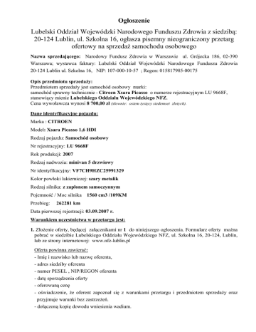 Ogłoszenie Lubelski Oddział Wojewódzki Narodowego Funduszu Zdrowia z siedzibą: 20-124 Lublin, ul. Szkolna 16, ogłasza pisemny nieograniczony przetarg ofertowy na sprzedaż samochodu osobowego Nazwa sprzedającego: Narodowy Fundusz Zdrowia w Warszawie ul. Grójecka 186, 02-390 Warszawa; wystawca faktury: Lubelski Oddział Wojewódzki Narodowego Funduszu Zdrowia 20-124 Lublin ul. Szkolna 16, NIP: 107-000-10-57 ; Regon: 015817985-00175 Opis przedmiotu sprzedaży: Przedmiotem sprzedaży jest samochód osobowy marki: samochód sprawny technicznie - Citroen Xsara Picasso o numerze rejestracyjnym LU 9668F, stanowiący mienie Lubelskiego Oddziału Wojewódzkiego NFZ. Cena wywoławcza wynosi 8 700,00 zł (słownie: osiem tysięcy siedemset złotych). Dane identyfikacyjne pojazdu: Marka : CITROEN Model: Xsara Picasso 1,6 HDI Rodzaj pojazdu: Samochód osobowy Nr rejestracyjny: LU 9668F Rok produkcji: 2007 Rodzaj nadwozia: minivan 5 drzwiowy Nr identyfikacyjny: VF7CH9HZC25991329 Kolor powłoki lakierniczej: szary metalik Rodzaj silnika: z zapłonem samoczynnym Pojemność / Moc silnika 1560 cm3 /109KM Przebieg: 262281 km Data pierwszej rejestracji: 03.09.2007 r. Warunkiem uczestnictwa w przetargu jest: 1. Złożenie oferty, będącej załącznikami nr 1 do niniejszego ogłoszenia. Formularz oferty można pobrać w siedzibie Lubelskiego Oddziału Wojewódzkiego NFZ, ul. Szkolna 16, 20-124, Lublin, lub ze strony internetowej: www.nfz-lublin.pl Oferta powinna zawierać: - Imię i nazwisko lub nazwę oferenta, - adres siedziby oferenta - numer PESEL , NIP/REGON oferenta - datę sporządzenia oferty - oferowaną cenę - oświadczenie, że oferent zapoznał się z warunkami przetargu i przedmiotem sprzedaży oraz przyjmuje warunki bez zastrzeżeń. - dołączoną kopię dowodu wniesienia wadium. Każdy oferent może złożyć tylko jedną ofertę. Sprzedający nie dopuszcza składania ofert wariantowych. Oferty należy składać osobiście lub przesłać pocztą do Lubelskiego Oddziału Wojewódzkiego NFZ, ul. Szkolna 16, 20-124, Lublin, pokój nr 19 w terminie do dnia 30.09.2015 r., do godz. 12.00”. Oferty należy składać w zaklejonych kopertach z napisem: „Przetarg – kupno samochodu” „Nie otwierać przed dniem 30.09. 2015 r., do godz. 12.15”. Decyduje data i godzina wpływu oferty do Lubelskiego Oddziału Wojewódzkiego NFZ, ul. Szkolna 16, 20-124, Lublin, a nie data jej wysłania przesyłką pocztową czy kurierską. Oferty złożone po terminie nie będą rozpatrywane. 2. Wpłacenie wadium w wysokości 10 % ceny wywoławczej pojazdu, co stanowi 870,00 zł (słownie: osiemset siedemdziesiąt złotych). Wadium można wpłacić w kasie siedziby Sprzedającego lub na rachunek bankowy nr: 02 1130 1206 0028 9000 1220 0002 . Wadium wniesione przez oferentów, których oferty nie zostały wybrane, zostanie zwrócone niezwłocznie. Wadium nie podlega zwrotowi w przypadku, gdy uczestnik przetargu, którego oferta została wybrana, jako najkorzystniejsza, uchylił się od zawarcia umowy. Pozostałe informacje: 1. Otwarcie ofert nastąpi w dniu 30.09.2015 roku o godz. 12.15, w siedzibie Lubelskiego Oddziału Wojewódzkiego NFZ, ul. Szkolna 16 w Lublinie w pok. Nr 205. 2. Samochód zostanie sprzedany za najwyższą zaoferowaną cenę. Kupujący zobowiązany jest do zapłaty ceny nabycia i do odbioru przedmiotu przetargu w ciągu 3 dni od dnia ogłoszenia wyników przetargu. 3. W przypadku zaoferowania takiej samej ceny przez więcej niż jednego oferenta, Sprzedającemu przysługuje prawo swobodnego wyboru oferty. 4. Przedmiot przetargu można oglądać w dniach 21 - 28 września 2015r. w godzinach od 10.00 do 14.00 po uprzednim uzgodnieniu w siedzibie Lubelskiego Oddziału Wojewódzkiego NFZ, ul. Szkolna 16 w Lublinie pok. Nr 1 tel. 081 53 10 532 Pan Michał Piwoni. 5. Sprzedający nie udziela gwarancji na stan samochodu objętego przetargiem ani nie odpowiada za wady ukryte. 6. Oferty cenowe poniżej ceny wywoławczej nie będą rozpatrywane. 7. Wszelkie informacje na temat sprzedaży samochodu uzyskać można w siedzibie Lubelskiego Oddziału Wojewódzkiego NFZ, ul. Szkolna 16 w Lublinie w pok. nr 1, lub telefonicznie pod nr 081/53 105 32. Do udzielania informacji i do protokolarnego wydania samochodu Kupującemu upoważnieni są: Joanna Klimkowska i Michał Piwoni. Załącznik nr 1 ………………………………………………..……………….. /imię i nazwisko / firma/ …………………………………………………………………. /adres / …………………………………………………………………… …………………………………… …………………………… /nr PESEL/ NIP/Regon/ …………………………………… /telefon kontaktowy/ …………………………, dnia ………………… OFERTA-OŚWIADCZENIE Ja niżej podpisany oświadczam, że zapoznałem się z warunkami postępowania przetargowego określonymi w ogłoszeniu o przetargu na sprzedaż samochodu osobowego oraz z treścią wzoru umowy (załącznik nr 2). Akceptuję warunki udziału w postępowaniu oraz po zapoznaniu się ze stanem technicznym pojazdu składam ofertę na zakup samochodu marki Citroen Xsara Picasso nr rej. LU 9668F za kwotę …………………………zł brutto (słownie: ………………………………………………………………………………………zł). W załączeniu dowód wpłaty kwoty wadium. Wyrażam zgodę, aby w przypadku wyboru mojej oferty, jako najkorzystniejszej pod względem oferowanej ceny, kwota wadium zaliczona została na poczet ceny. …………………………………. /podpis oferenta/ Załącznik nr 2 UMOWA SPRZEDAŻY zawarta w dniu ……………………… roku w Lublinie pomiędzy Lubelskim Oddziałem Wojewódzkim Narodowego Funduszu Zdrowia, ul. Szkolna 16, 20-124 Lublin, reprezentowanym przez: Andrzeja Kowalika - p.o. Dyrektora zwanym dalej „Sprzedającym”, a ……………