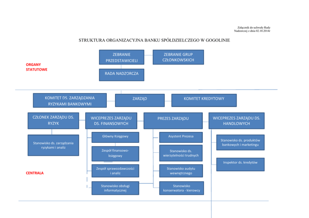 Załącznik do uchwały Rady Nadzorczej z dnia 02.10.2014r STRUKTURA ORGANIZACYJNA BANKU SPÓŁDZIELCZEGO W GOGOLINIE ZEBRANIE PRZEDSTAWICIELI ORGANY STATUTOWE RADA NADZORCZA KOMITET DS. ZARZĄDZANIA RYZYKAMI BANKOWYMI CZŁONEK ZARZĄDU DS. RYZYK ZARZĄD WICEPREZES ZARZĄDU DS. FINANSOWYCH Główny Księgowy Stanowisko ds. zarządzania ryzykami i analiz ZEBRANIE GRUP CZŁONKOWSKICH KOMITET KREDYTOWY PREZES ZARZĄDU WICEPREZES ZARZĄDU DS. HANDLOWYCH Asystent Prezesa Stanowisko ds. produktów bankowych i marketingu Zespół finansowoksięgowy Stanowisko ds. wierzytelności trudnych Inspektor ds. kredytów CENTRALA Zespół sprawozdawczości i analiz Stanowisko audytu wewnętrznego Stanowisko obsługi informatycznej Stanowisko konserwatora - kierowcy ODDZIAŁY ODDZIAŁ GOGOLIN ODDZIAŁ PRÓSZKÓW ODDZIAŁ STRZELECZKI ODDZIAŁ ZDZIESZOWICE KIEROWNIK ODDZIAŁU KIEROWNIK ODDZIAŁU KIEROWNIK ODDZIAŁU KIEROWNIK ODDZIAŁU Stanowisko ds. księgowości Stanowisko ds. księgowości Stanowisko ds. księgowości Stanowiska obsługi Stanowisko ds. księgowości Stanowiska ds. księgowości Stanowiska obsługi klienta (oszczędności, kredyty, rozliczenia) klienta (oszczędności, kredyty, rozliczenia) Stanowiska obsługi klienta (oszczędności, kredyty, rozliczenia) Stanowiska obsługi klienta (oszczędności, kredyty, rozliczenia) Stanowiska obsługi kasowej Stanowiska obsługi kasowej Stanowiska obsługi kasowej Stanowiska obsługi kasowej Stanowisko administracji kredytami Stanowisko administracji kredytami Stanowisko administracji kredytami Stanowisko administracji kredytami Stanowisko sprzątaczki Stanowisko sprzątaczki Stanowisko sprzątaczki Stanowisko sprzątaczki Filia Krapkowice Punkt Kasowy Dobra Punkt Kasowy Krapkowice Punkt Kasowy Zielina
